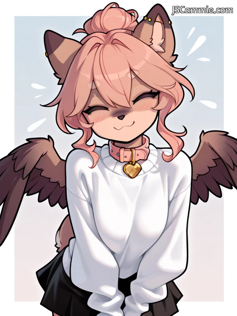white sweater, black skirt, pink collar, gold heart collar tag,