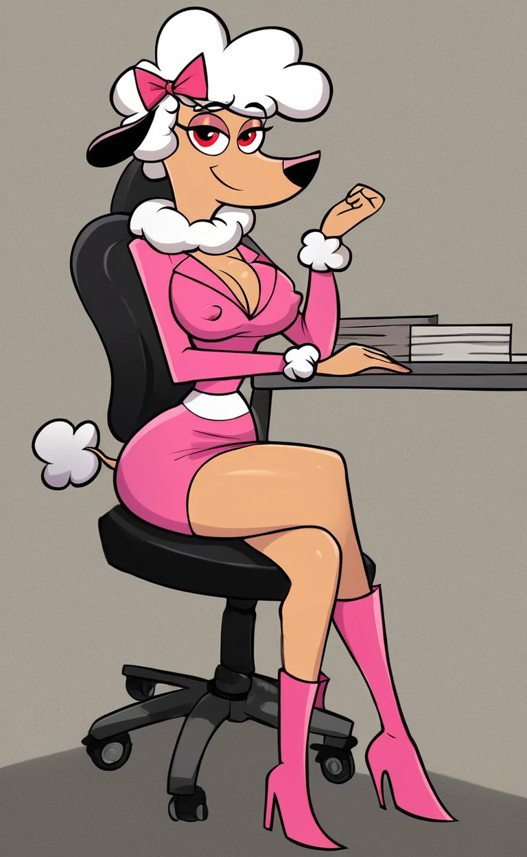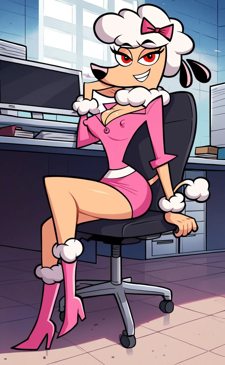 poodle, black nose, oui oui, curly white hair, fifi_hair, pink hair bow, snout, red pupil, black ears, tan skin,white tail tuft,