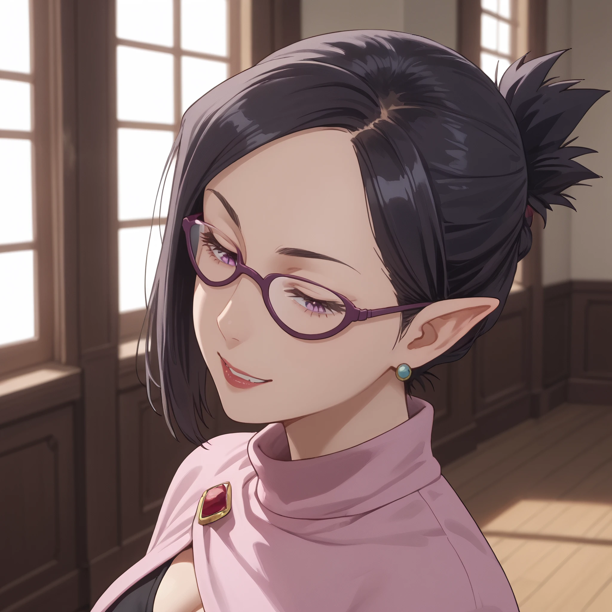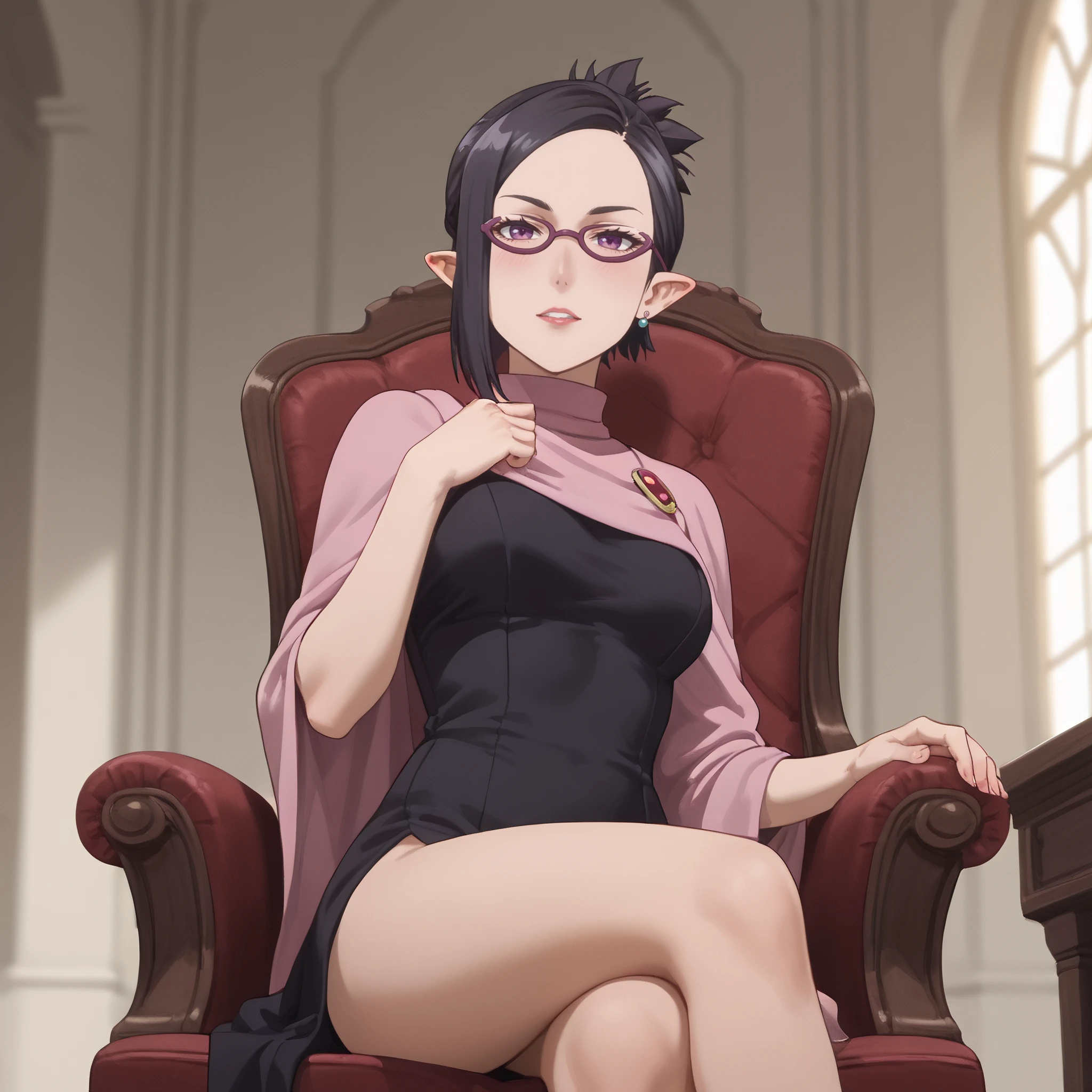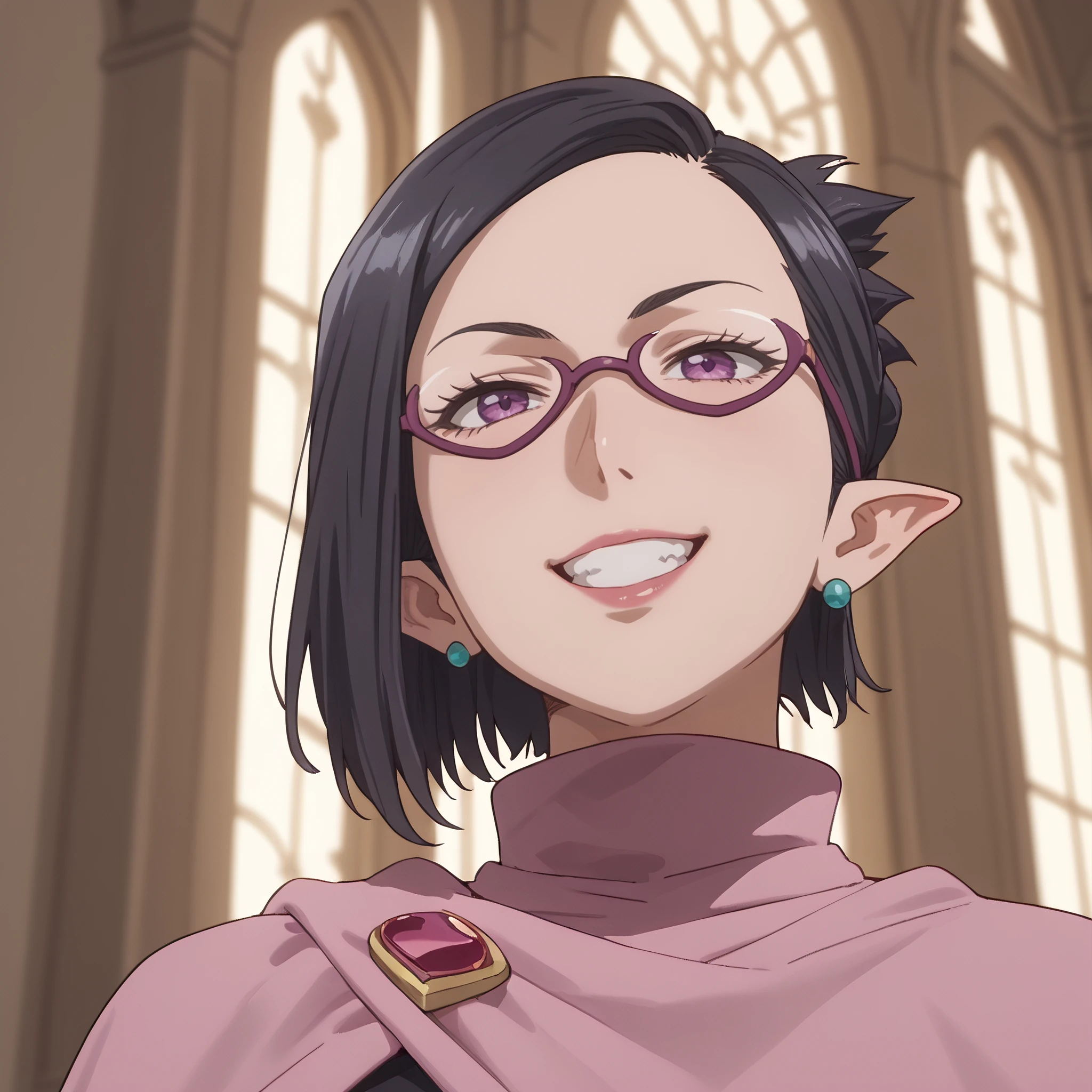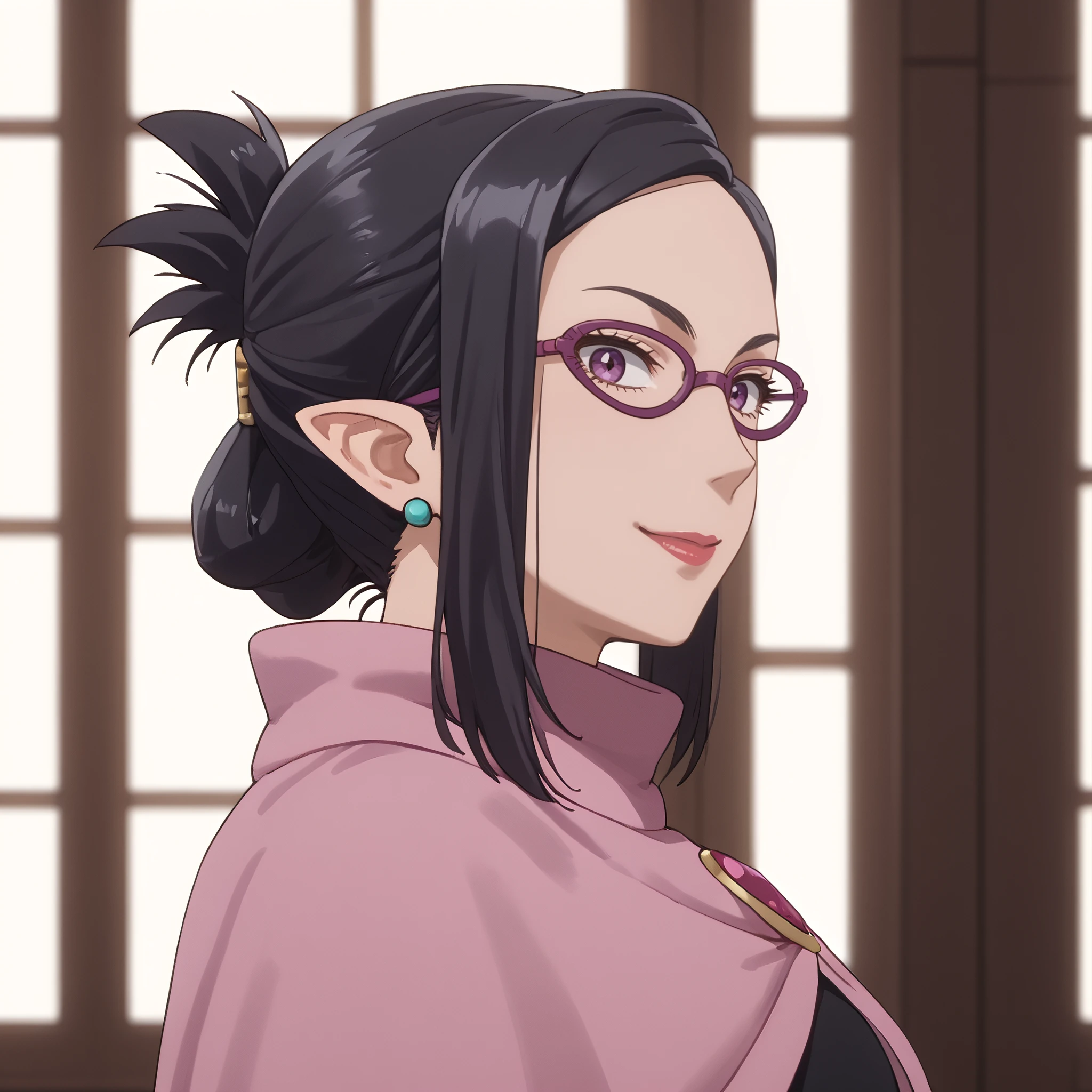 ARTGrenat, glasses, black hair, pointy ears, earrings, short hair, purple eyes, black-framed eyewear,