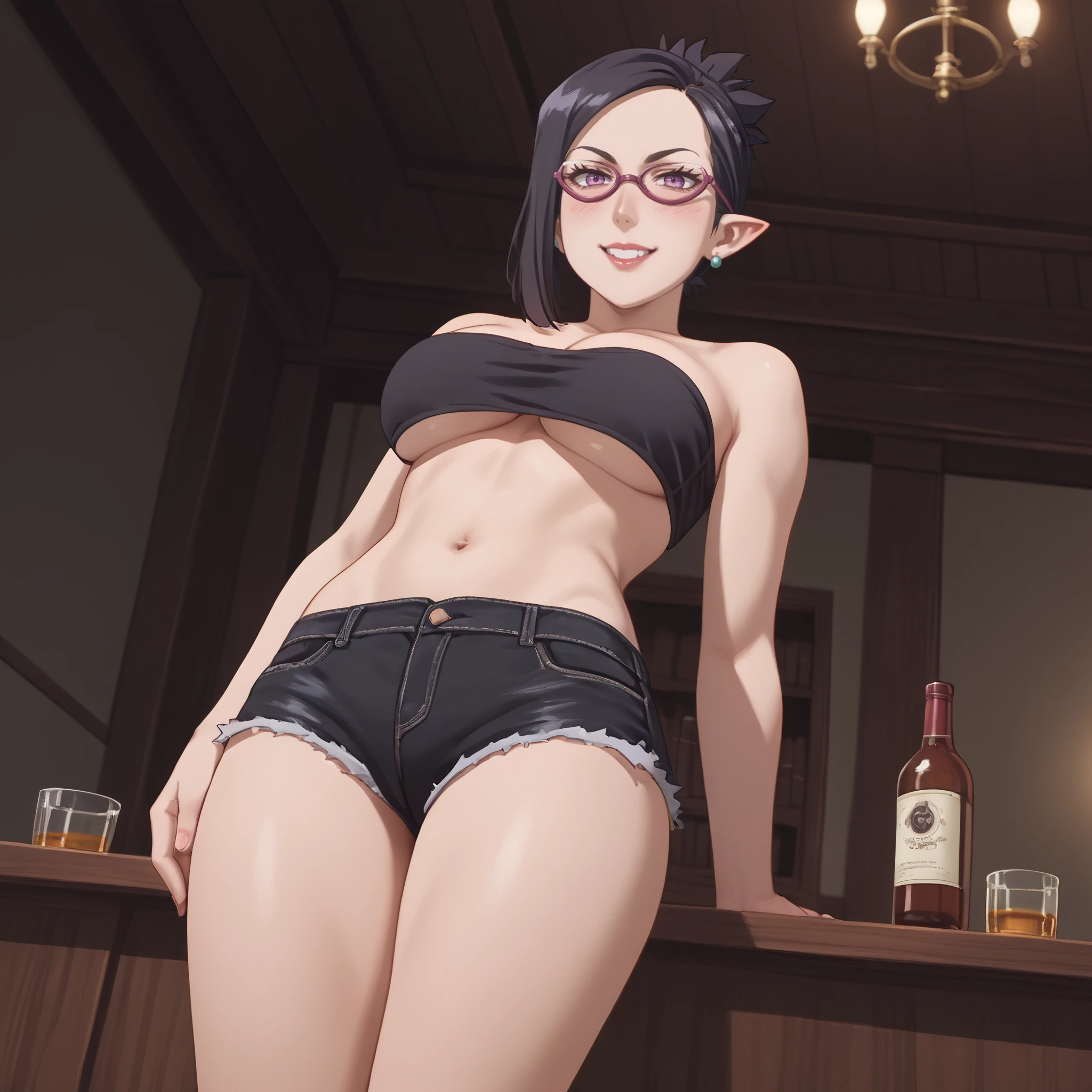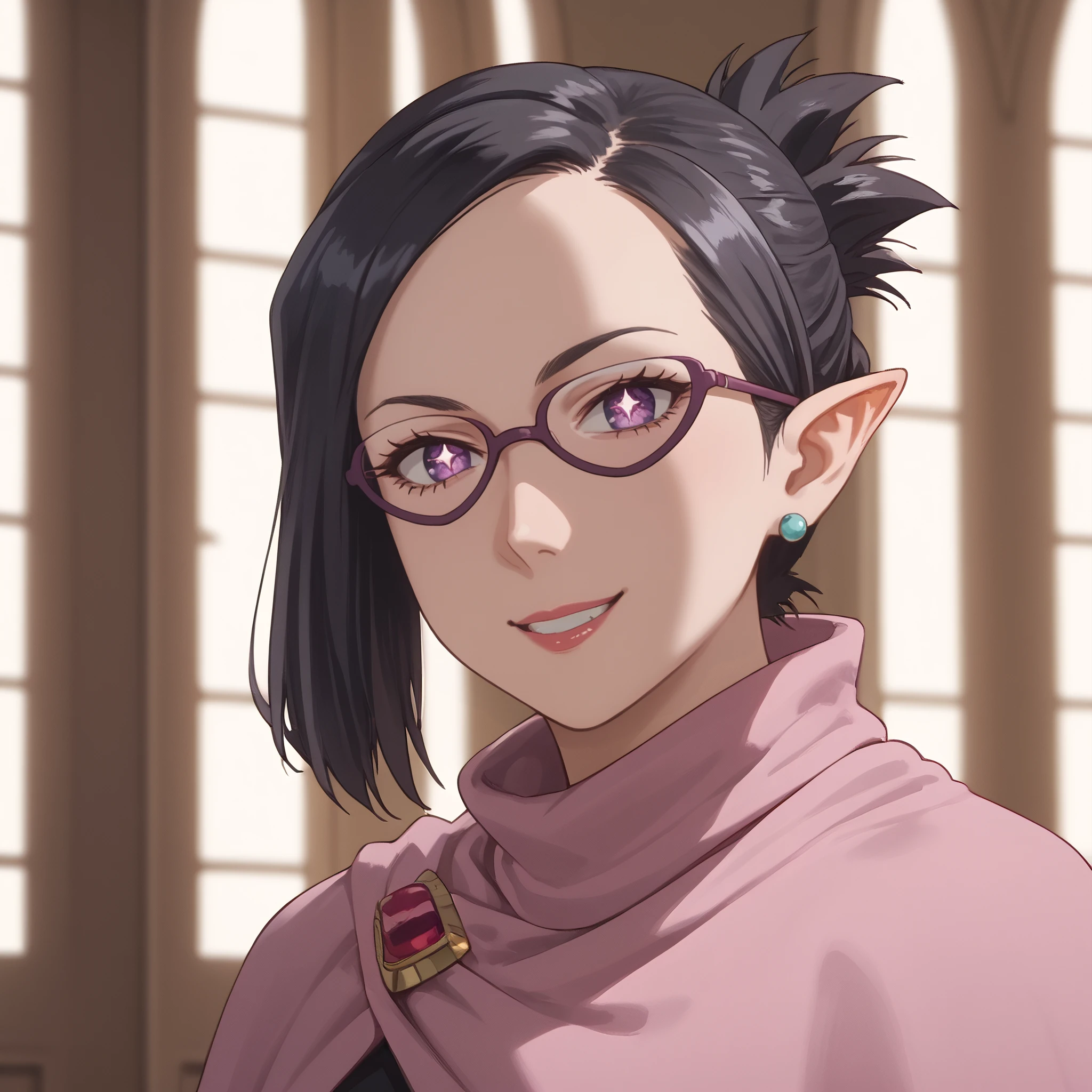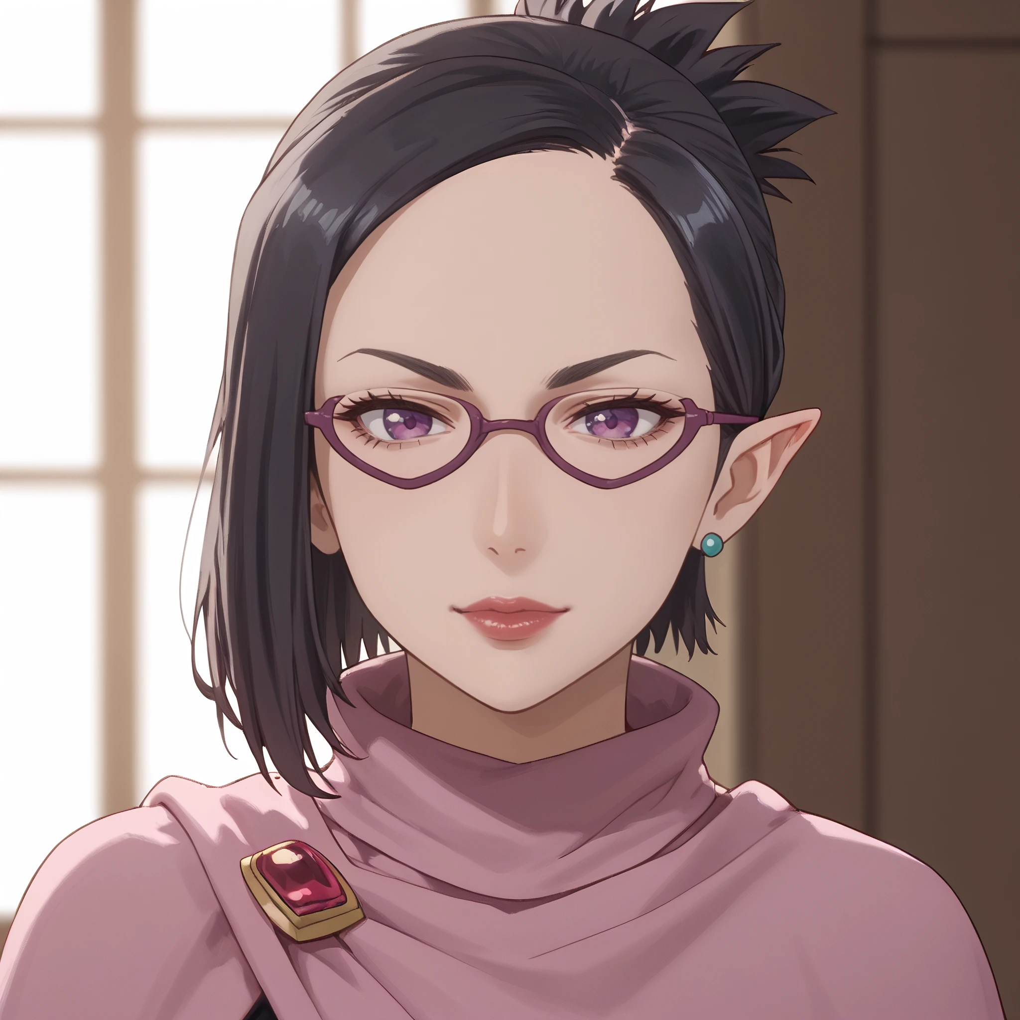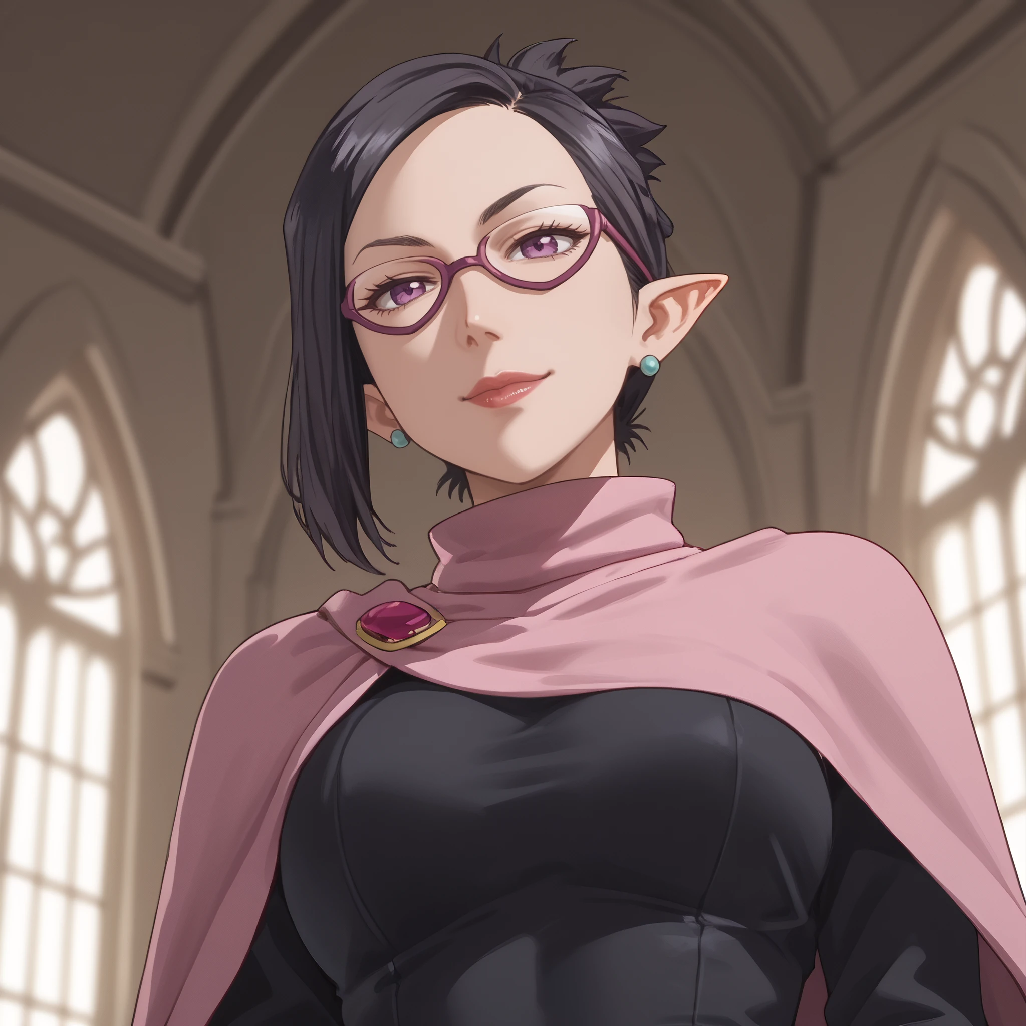ARTGrenat, glasses, black hair, pointy ears, earrings, short hair, purple eyes, black-framed eyewear,
