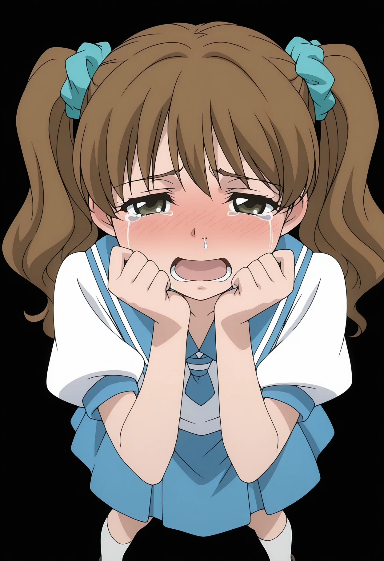 blue scrunchie, school uniform, puffy short sleeves, blue sailor collar, blue skirt, white socks, loafers