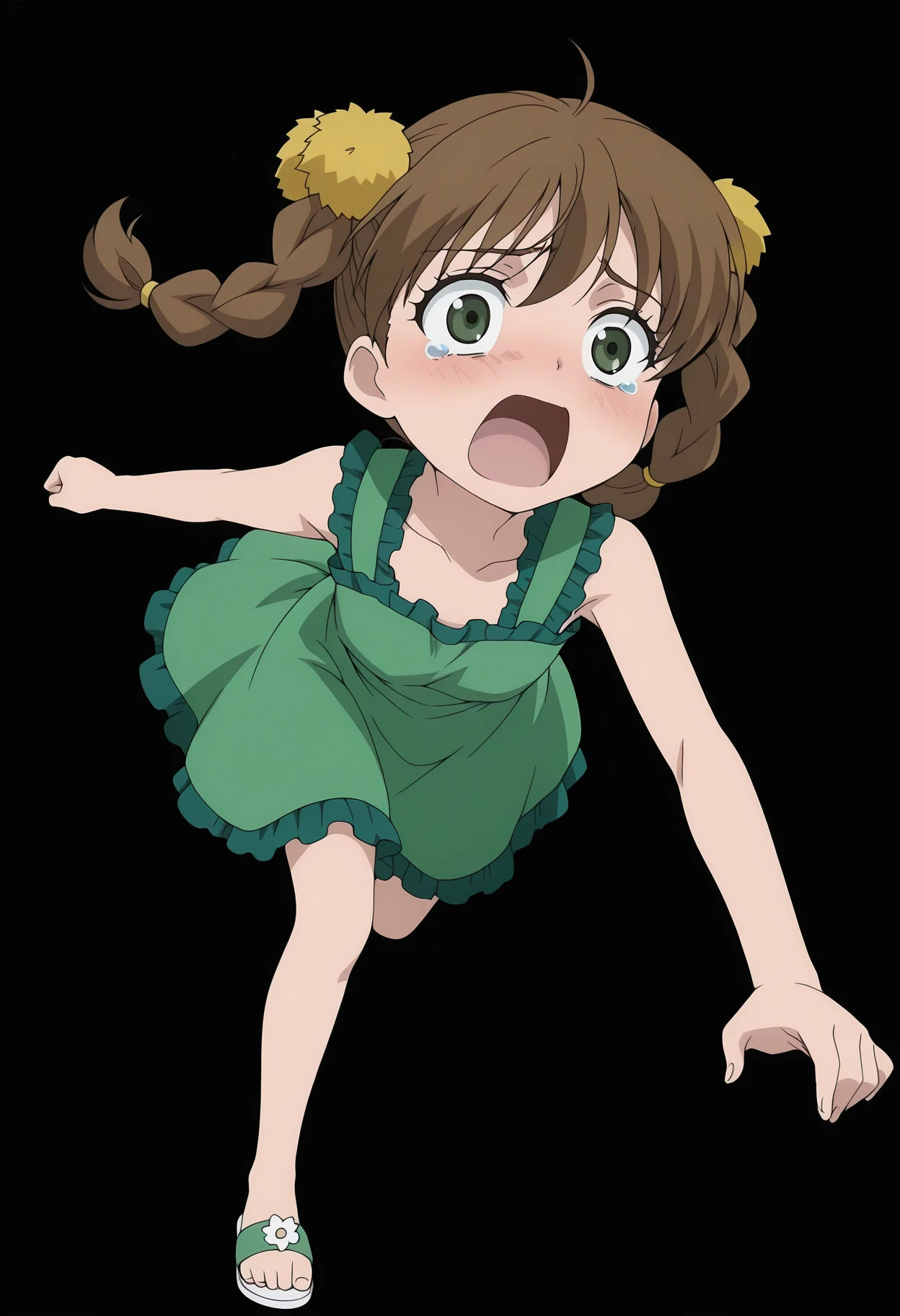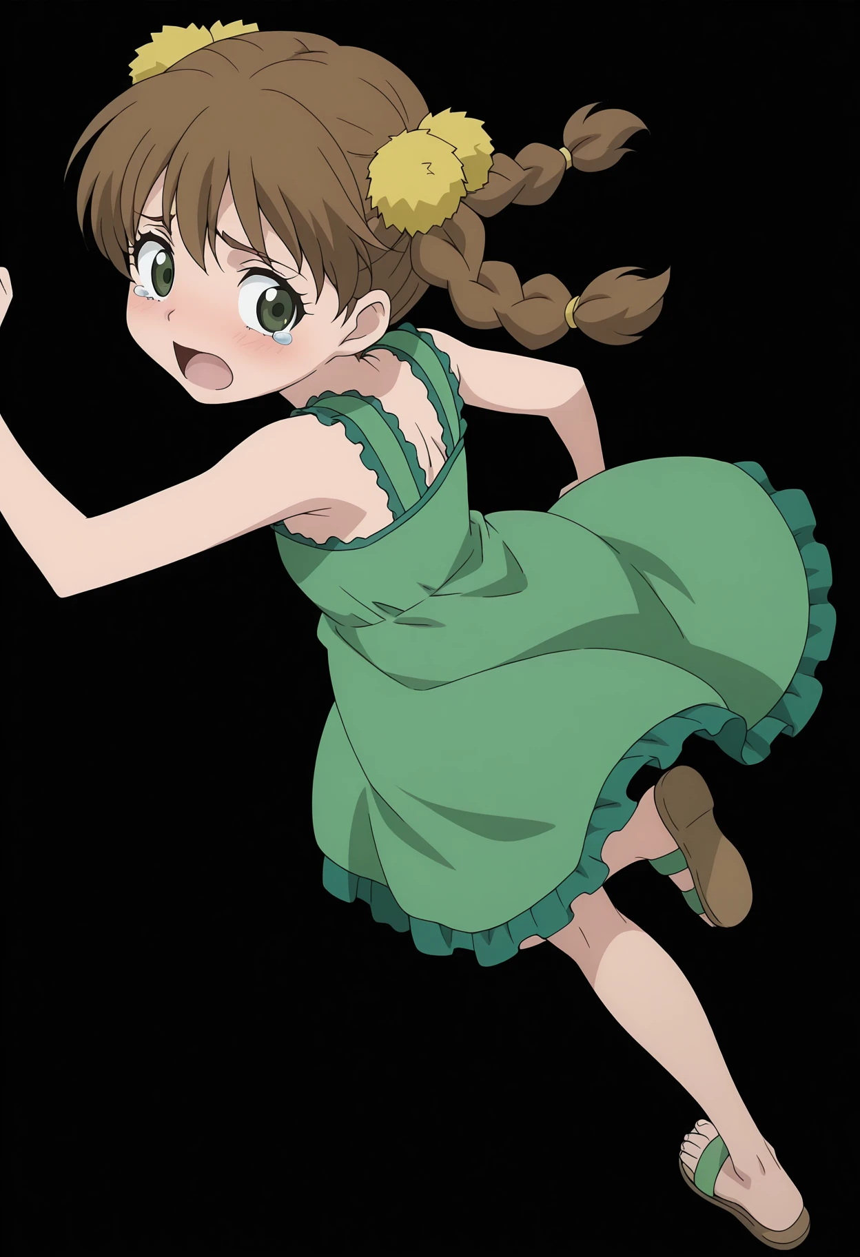hair ornament, collarbone, bare shoulders, bare arms, green dress, sleeveless dress, frills, barefoot, sandals