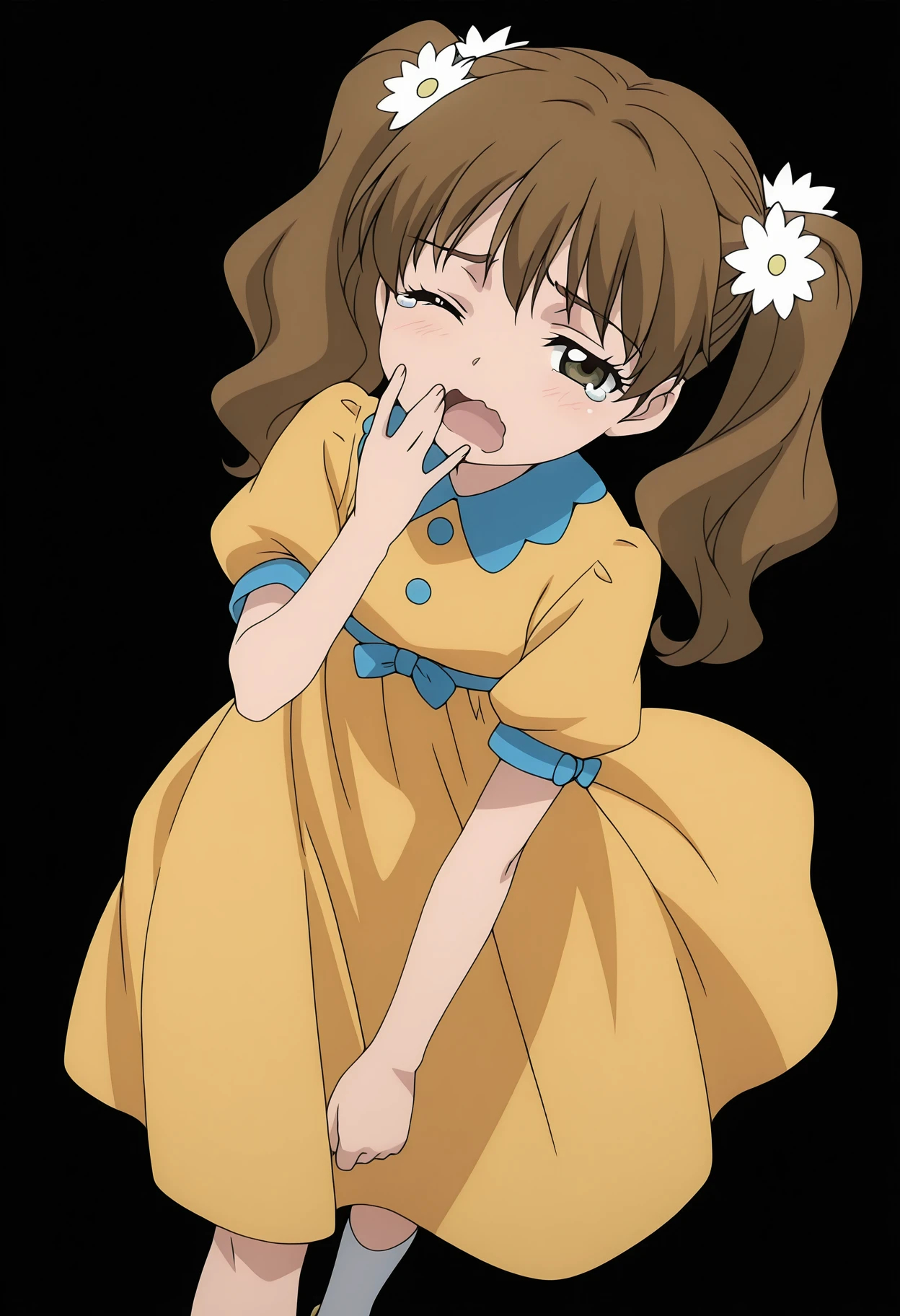 hair ornament, hair flower, white flower, yellow dress, dress bow, blue bow, puffy short sleeves, white socks