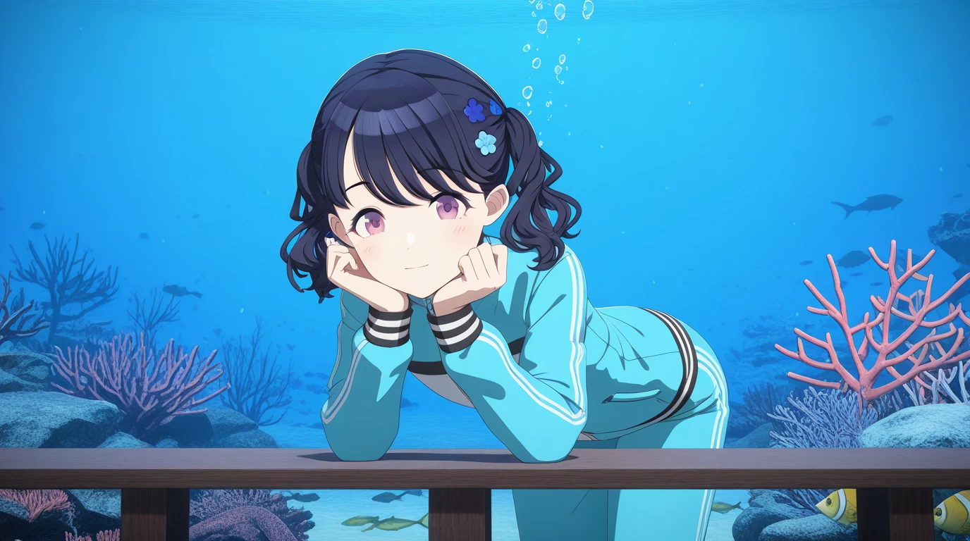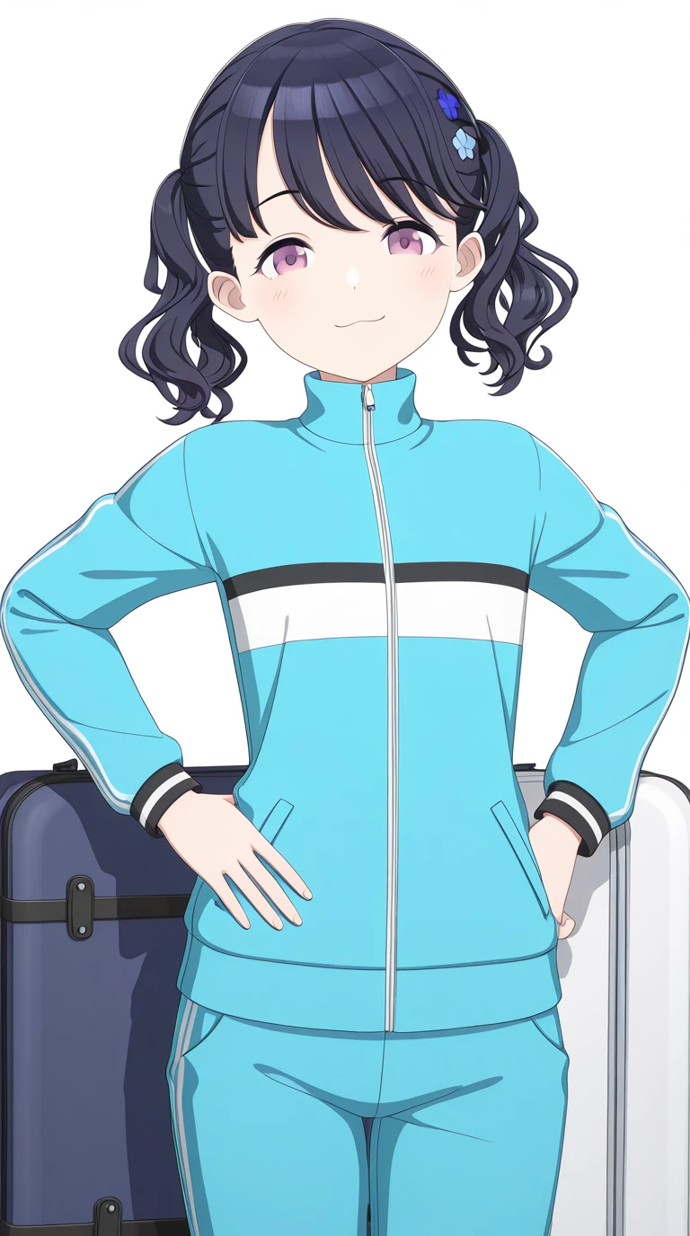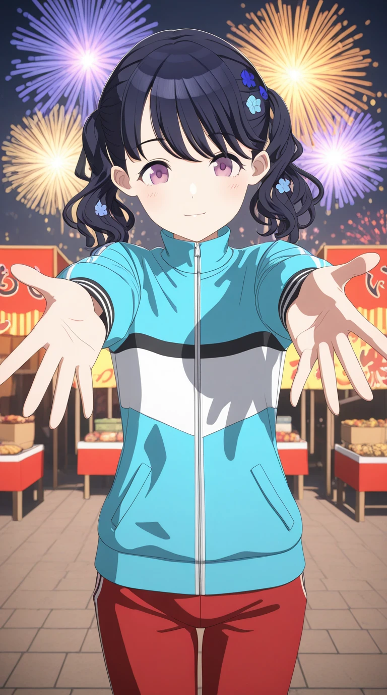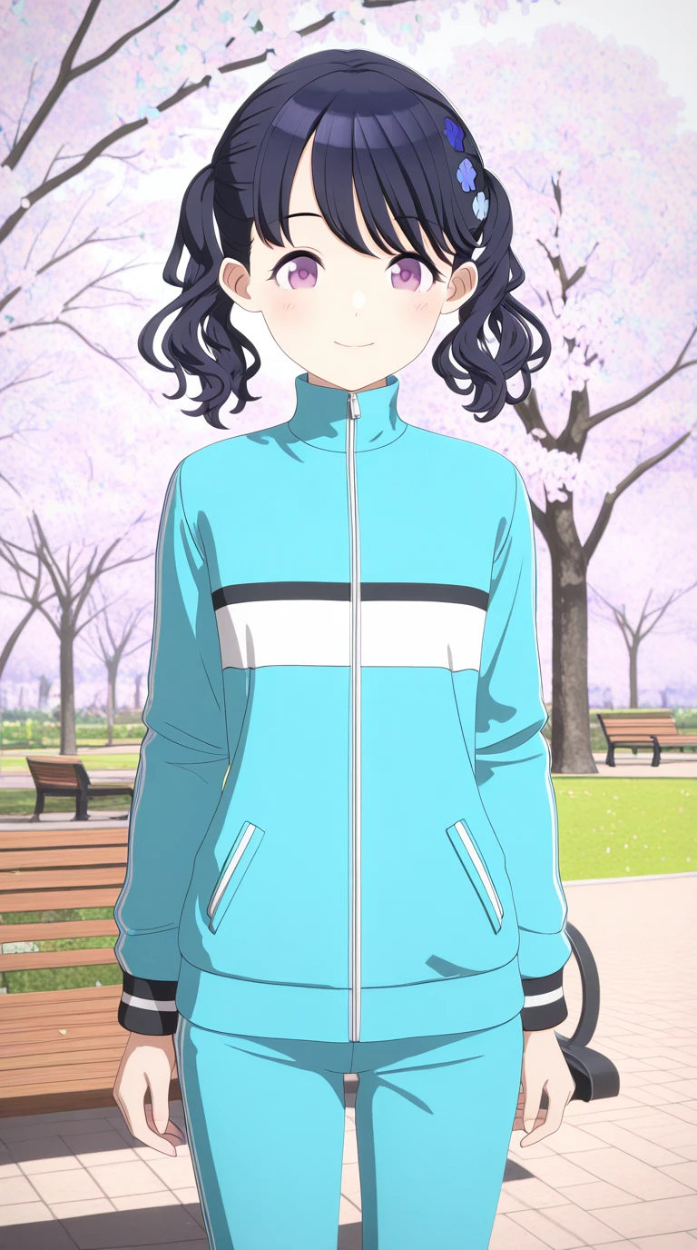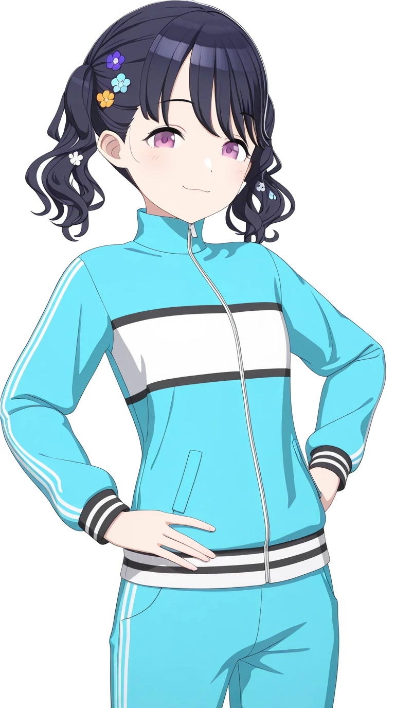 koito fukumaru, bangs, black hair, hair ornament, twintails, purple eyes, flower, hair flower, medium hair, swept bangs, 3d