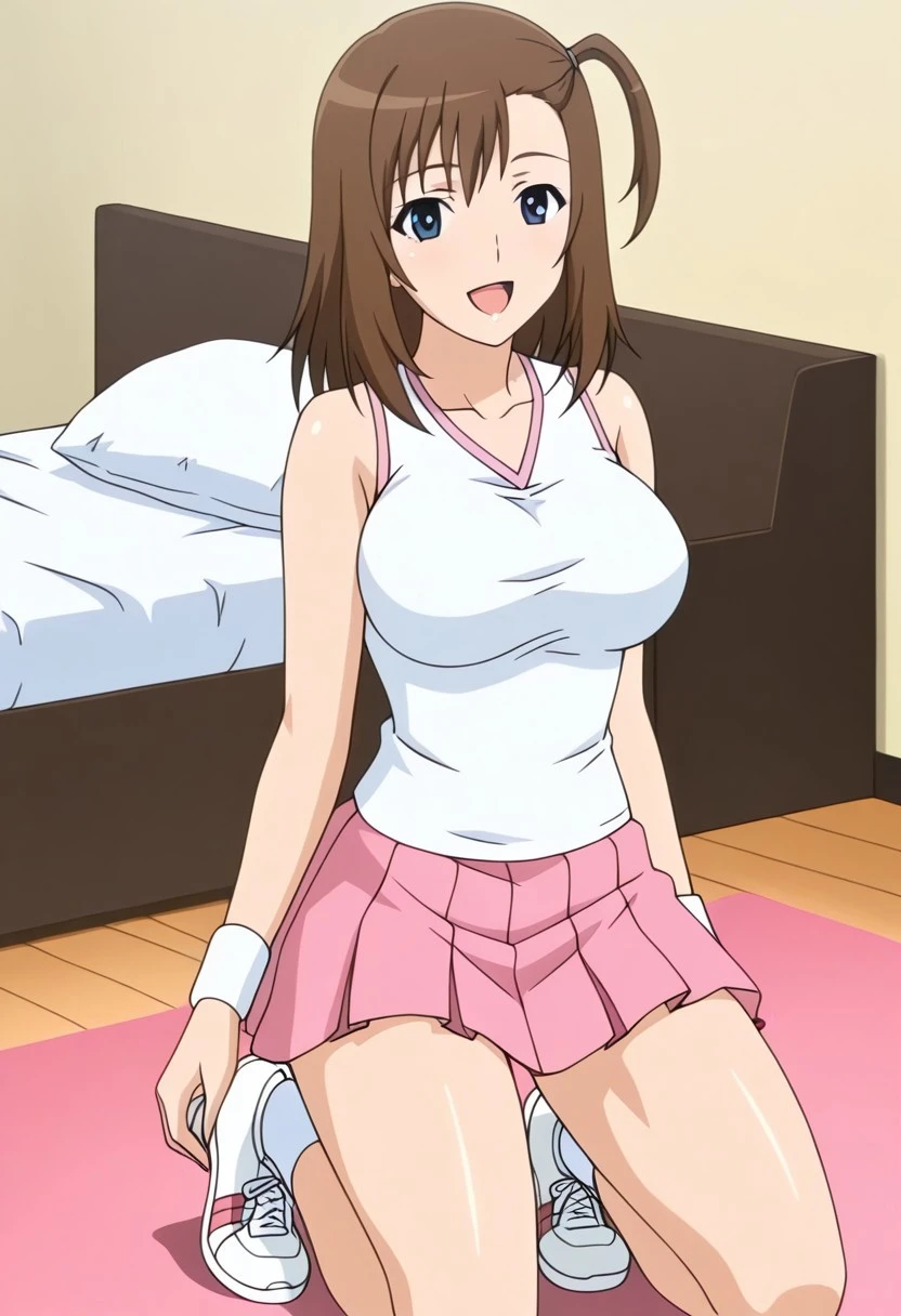 momoka nakayama ep2 tennis outfit, tennis uniform, white tank top, wristband, pink skirt, pleated skirt, white socks, sneakers,