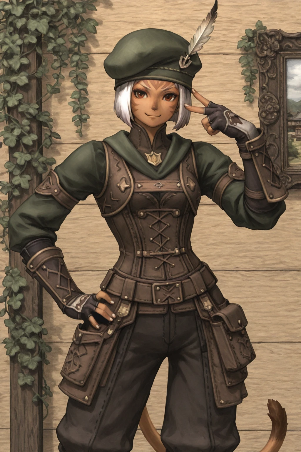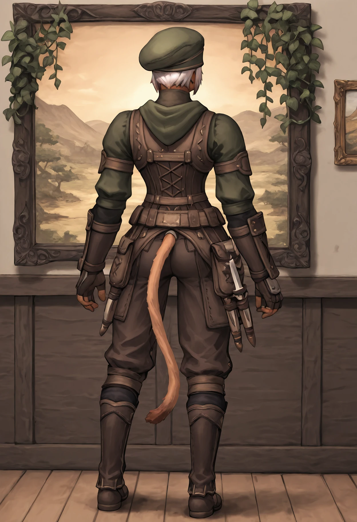 sylvanattire, armor, hood, hood down, vambraces, gloves, pants, shin guards, shoes, cuisses, criss-cross strings, green sleeves, long sleeves, dark brown armor, dark brown pants, cargo pants, belt, belt pouch, harness, With hat