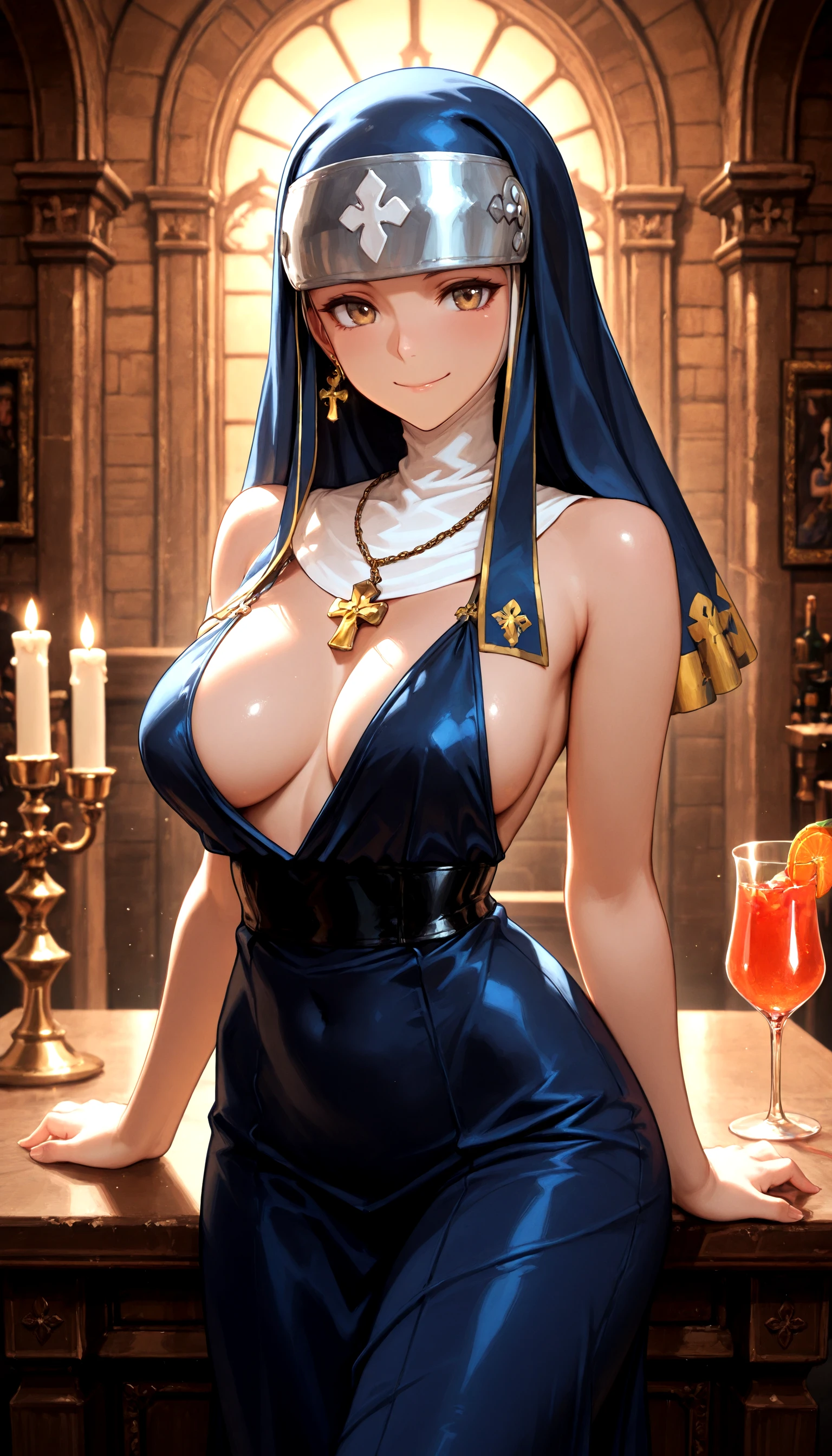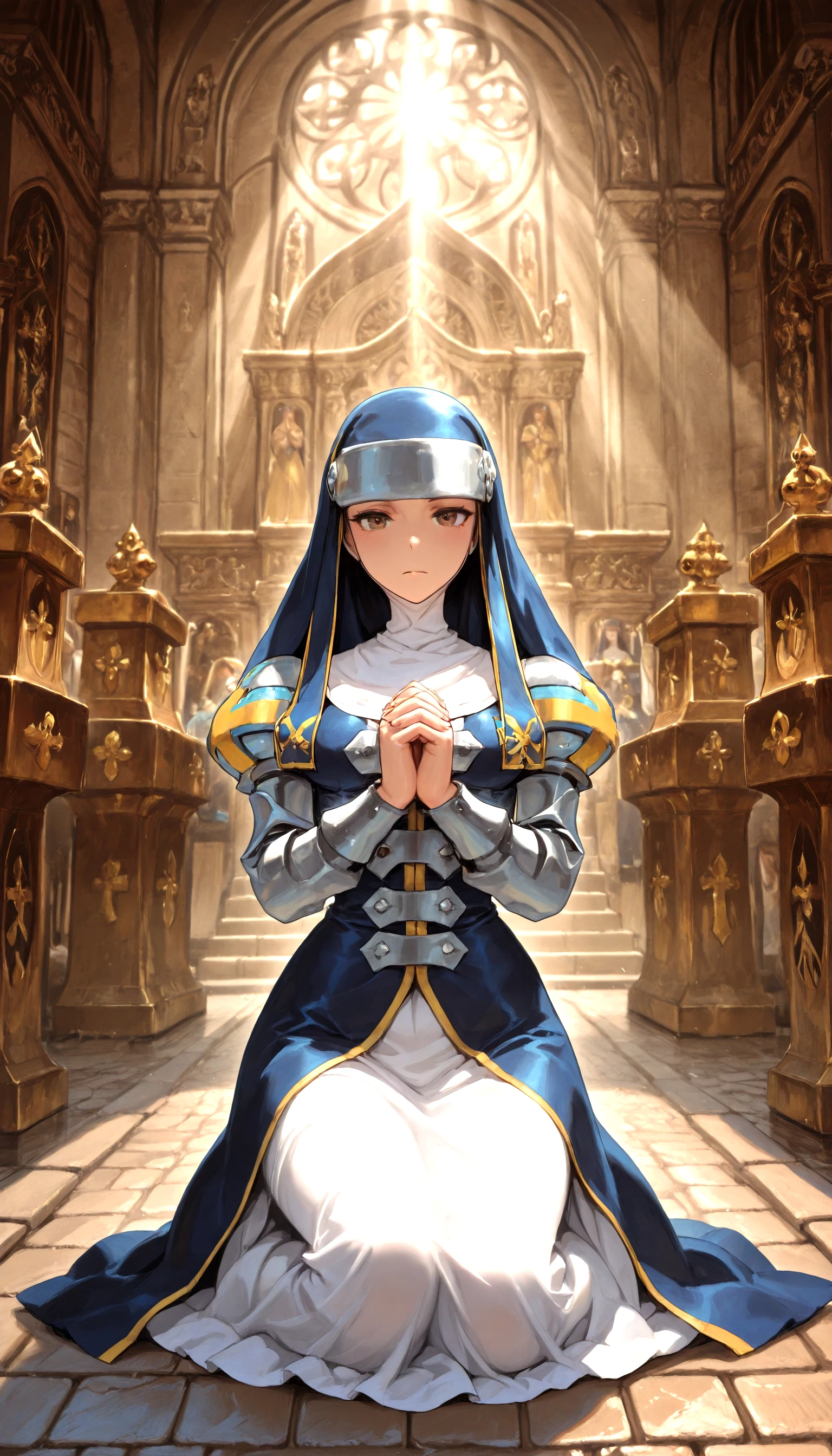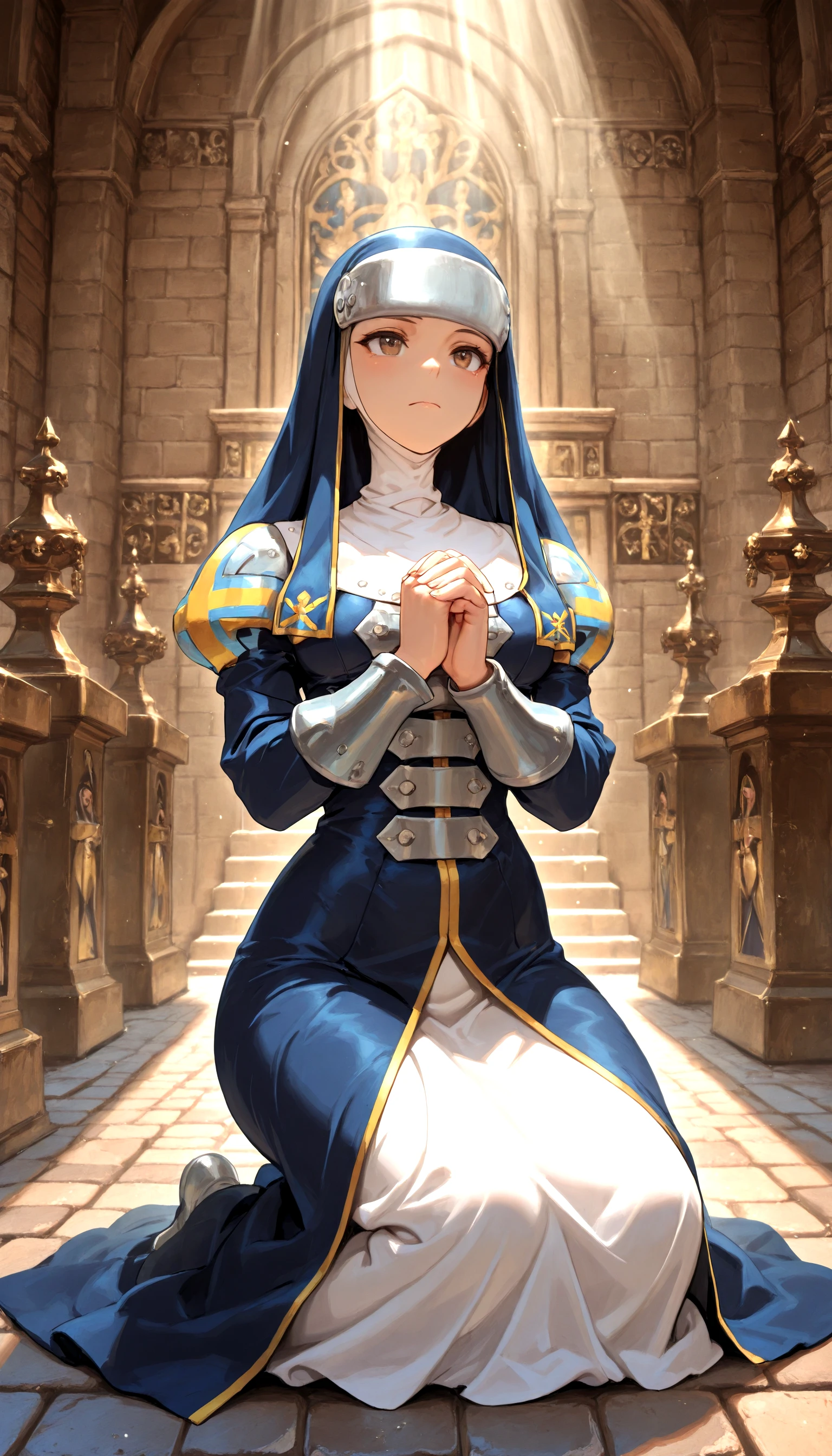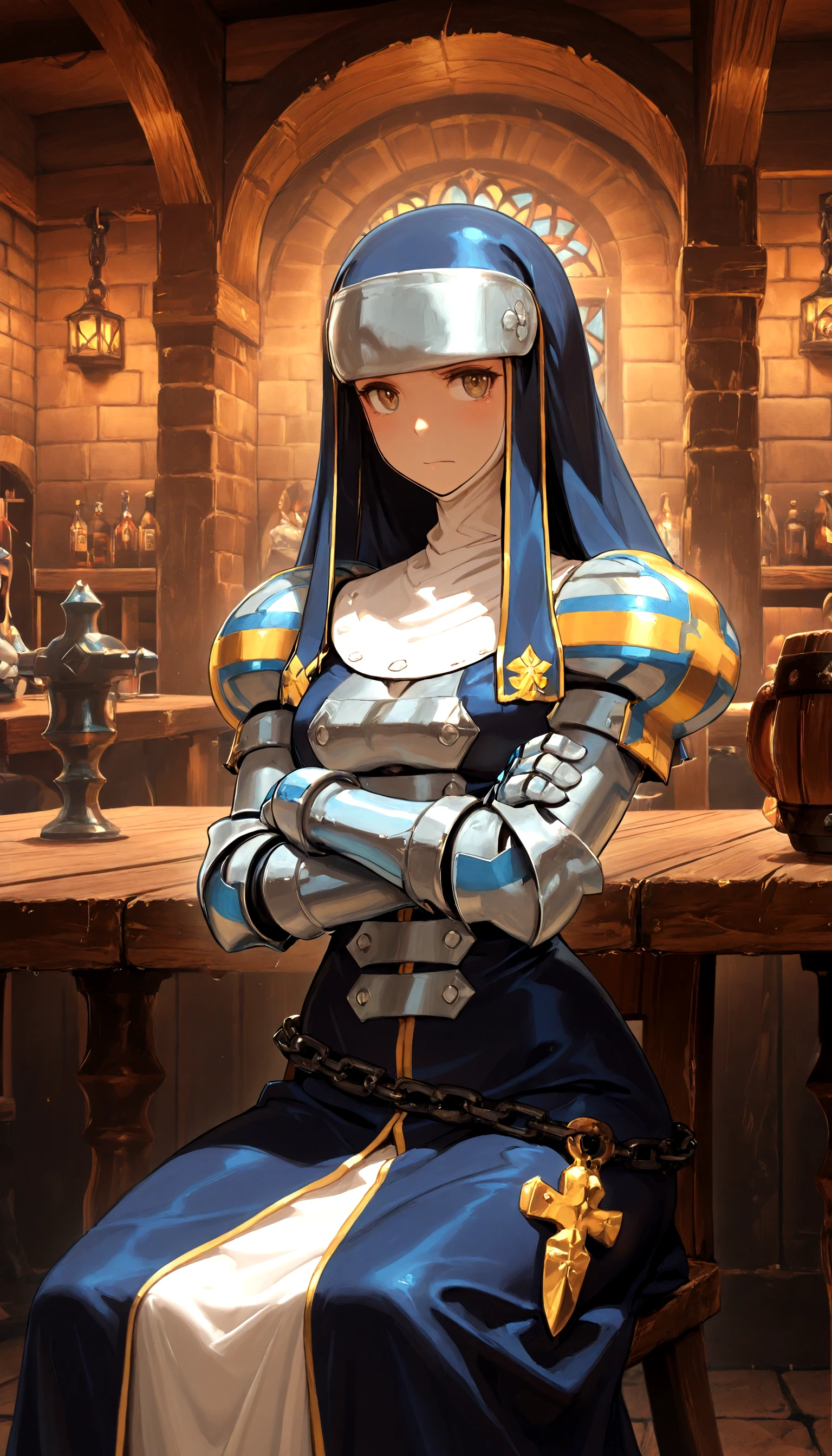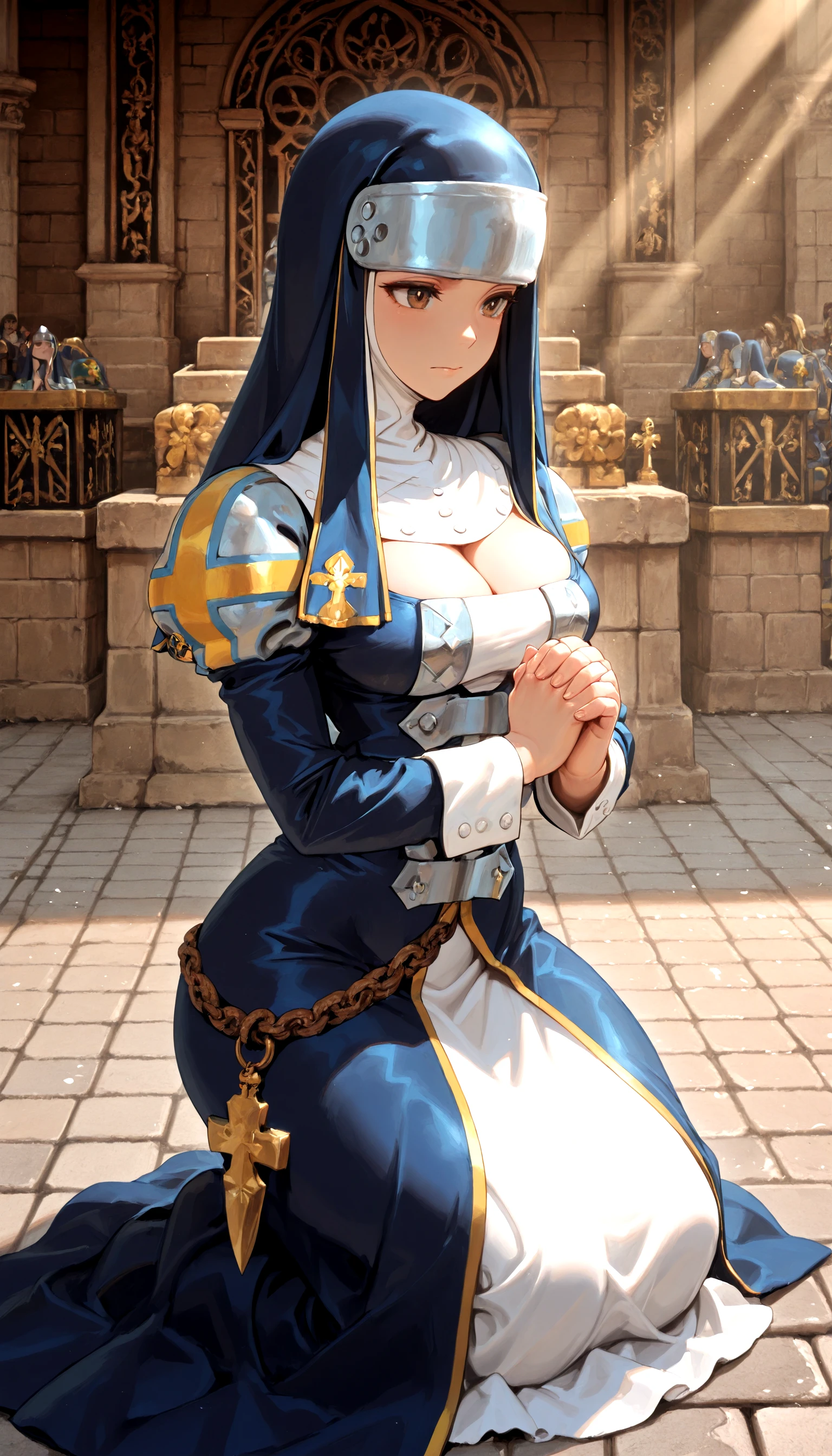 Example prompt: helga_wilhelmina, nun_habit, armor, long_hair,dress, solo, chain, high_heels,