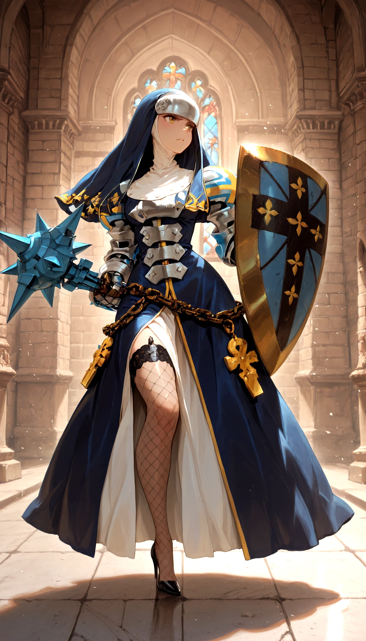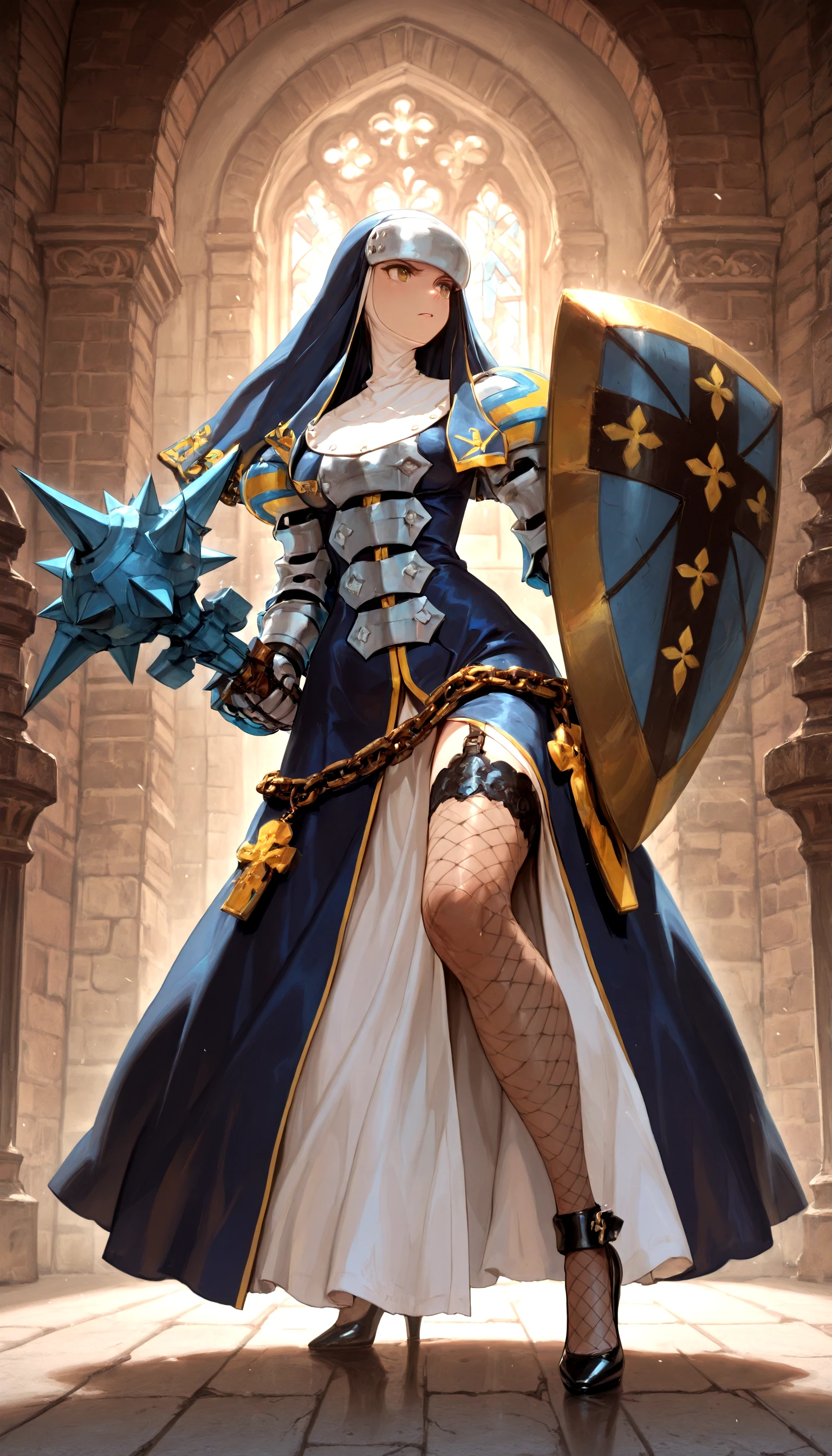 fighting_stance, mace, shield, castle, indoors, fishnets