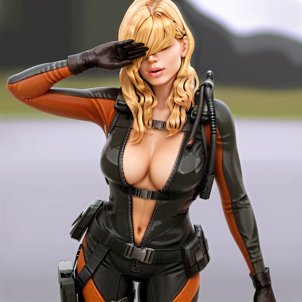 RachelFoley, 1girl, large breasts, blonde hair, bodysuit, navel, cleavage, black gloves, long hair, belt, zipper, unzipped, lips, pouch, hair over eyes, hair over one eye, cowboy shot