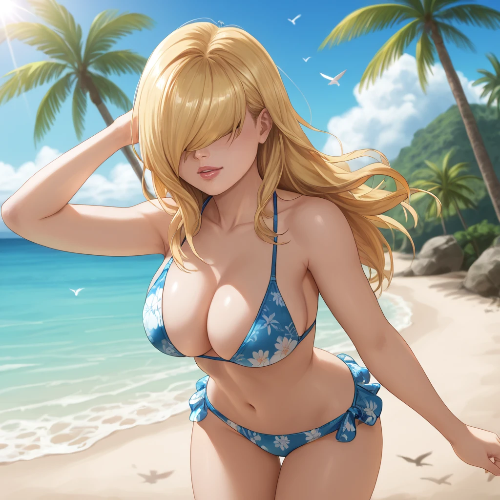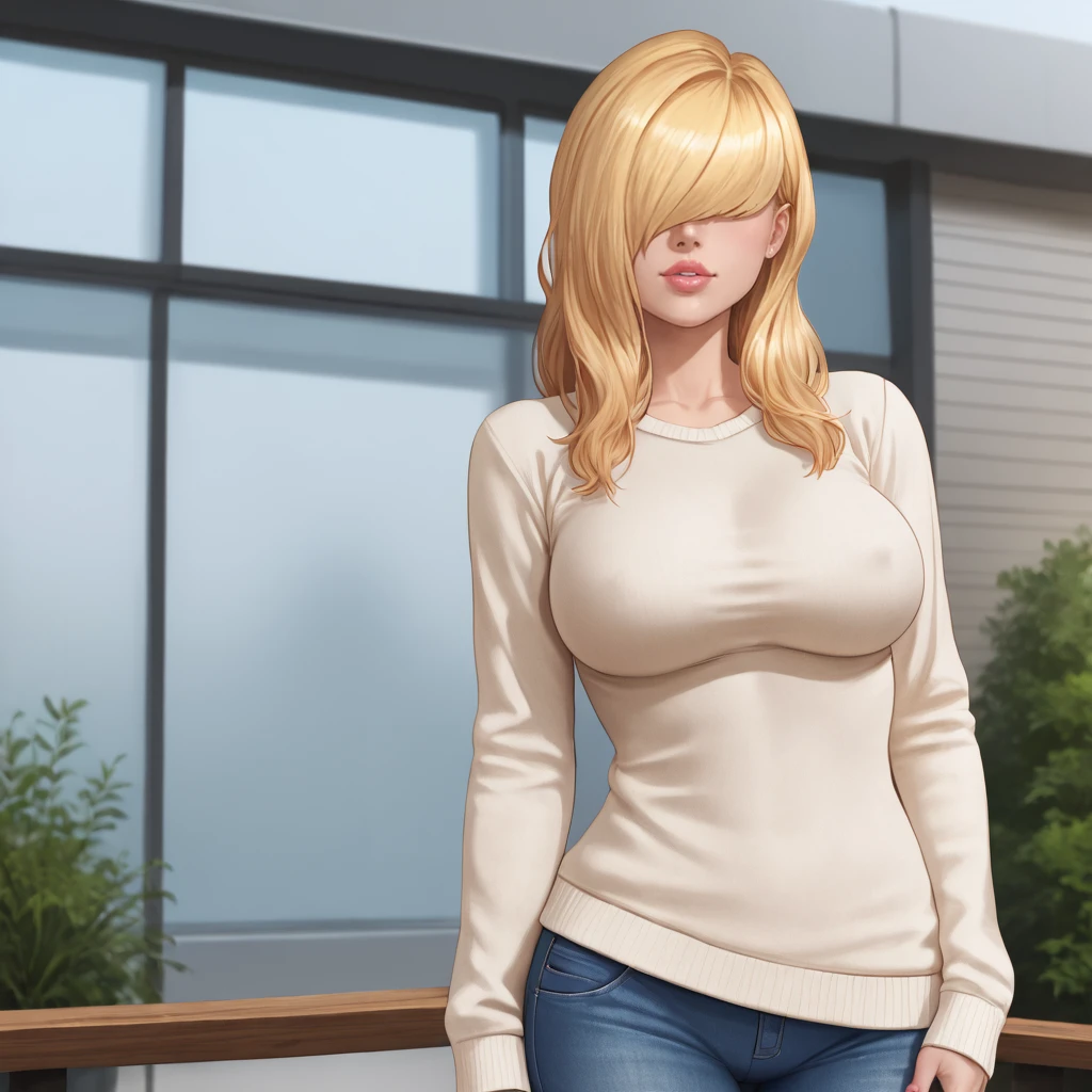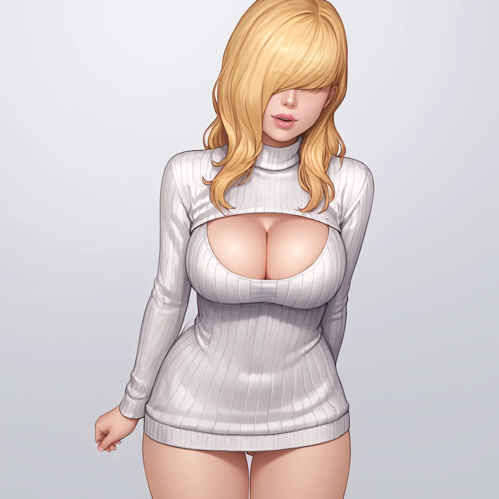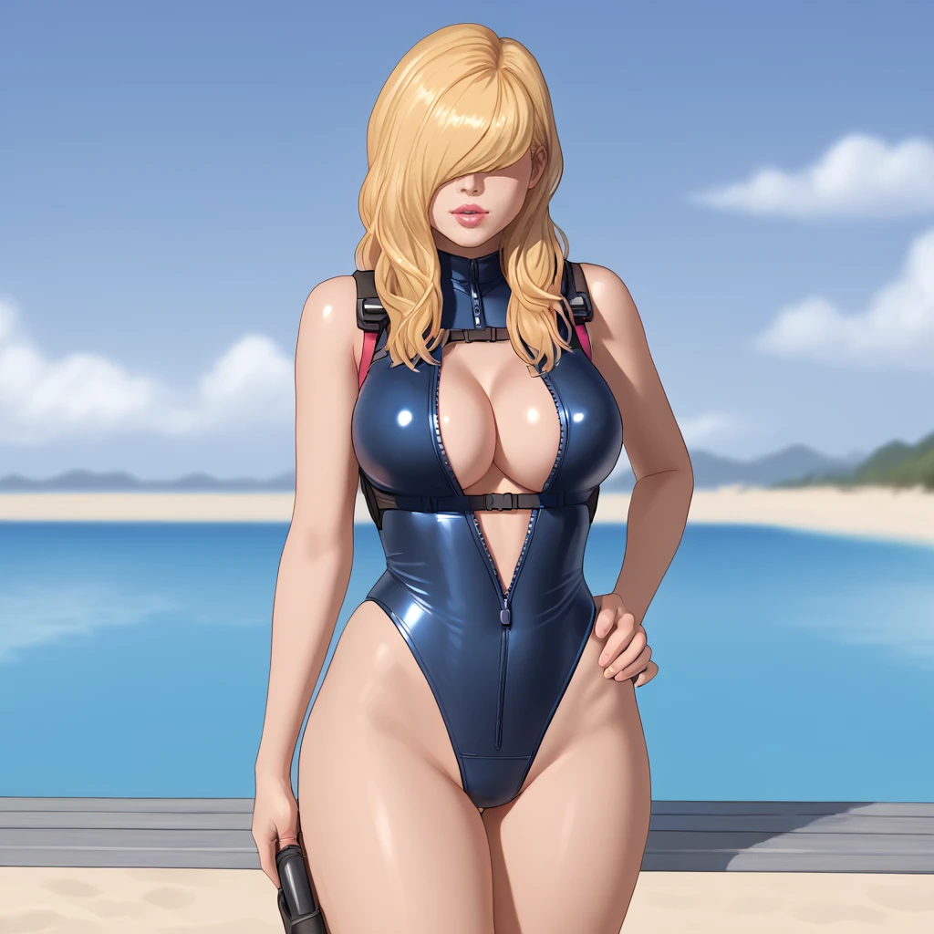 Trigger : RachelFoley, 1girl, large breasts, blonde hair, bodysuit, navel, cleavage, black gloves, long hair, belt, zipper, unzipped, lips, pouch, hair over eyes, hair over one eye, cowboy shot