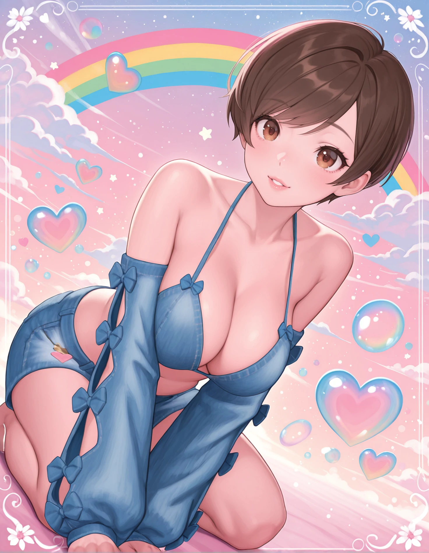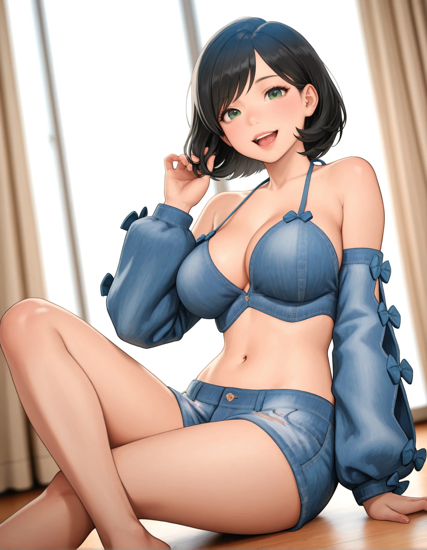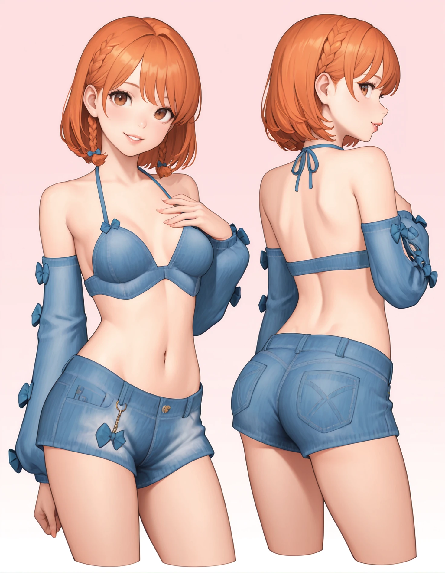 denim shirt, denim shorts, denim arm warmers, bow, halterneck