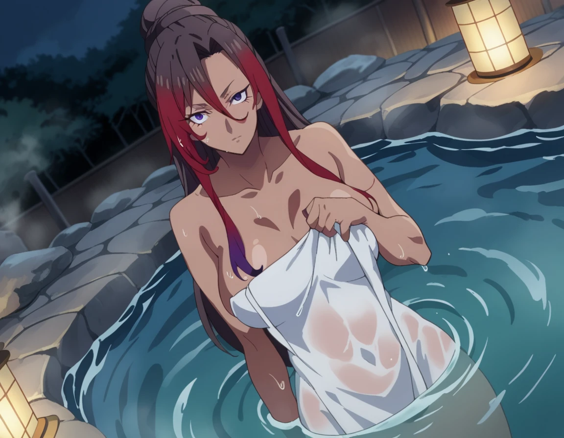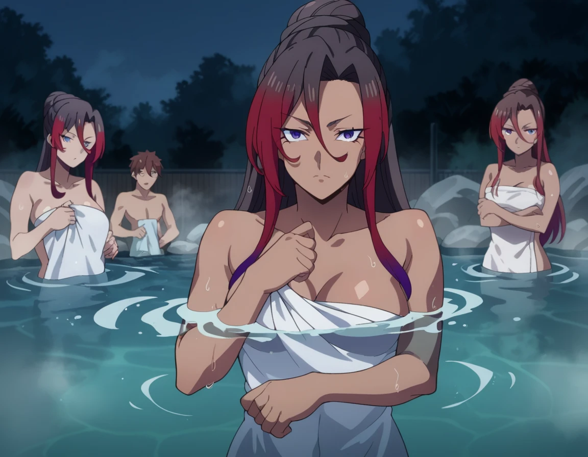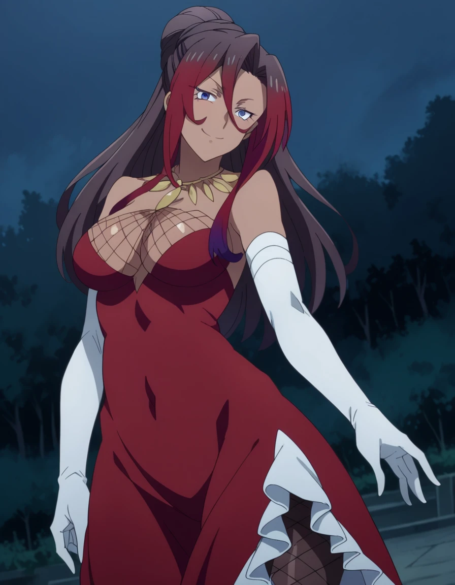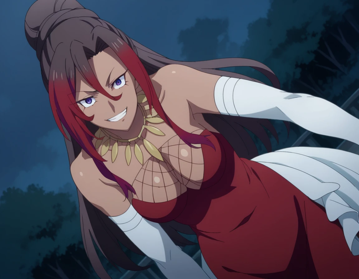 sylvia, long hair, brown hair, hair between eyes, ponytail, red hair, multicolored hair, dark skin, dark-skinned female, purple eyes,