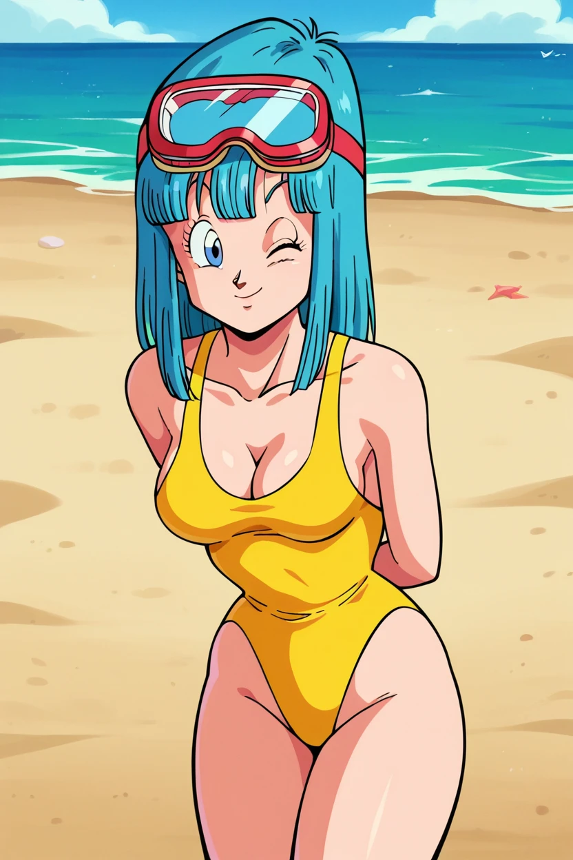 yellow one-piece swimsuit, goggles on headThe pink dress: