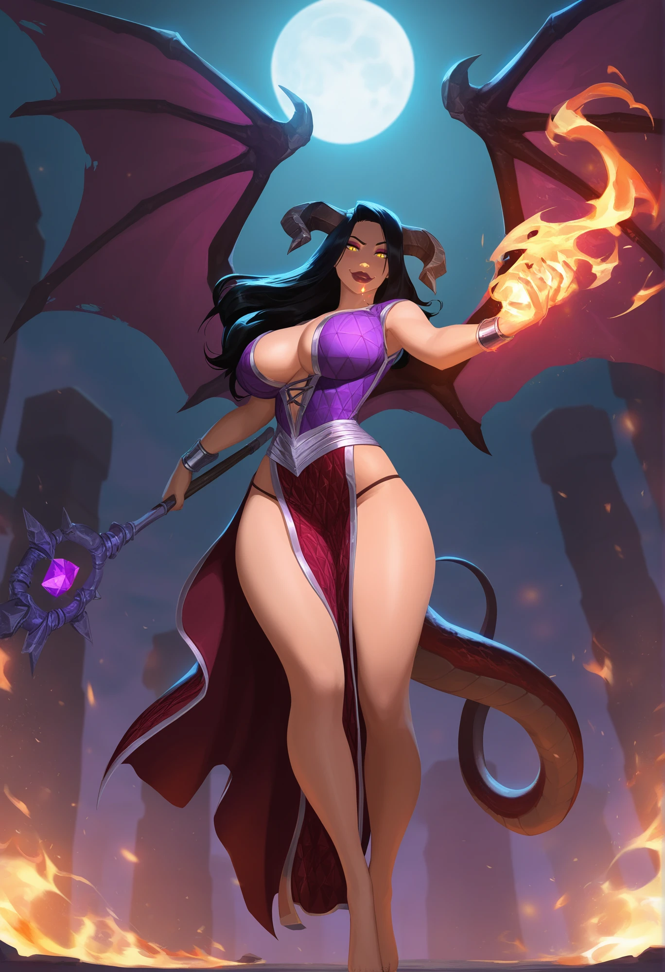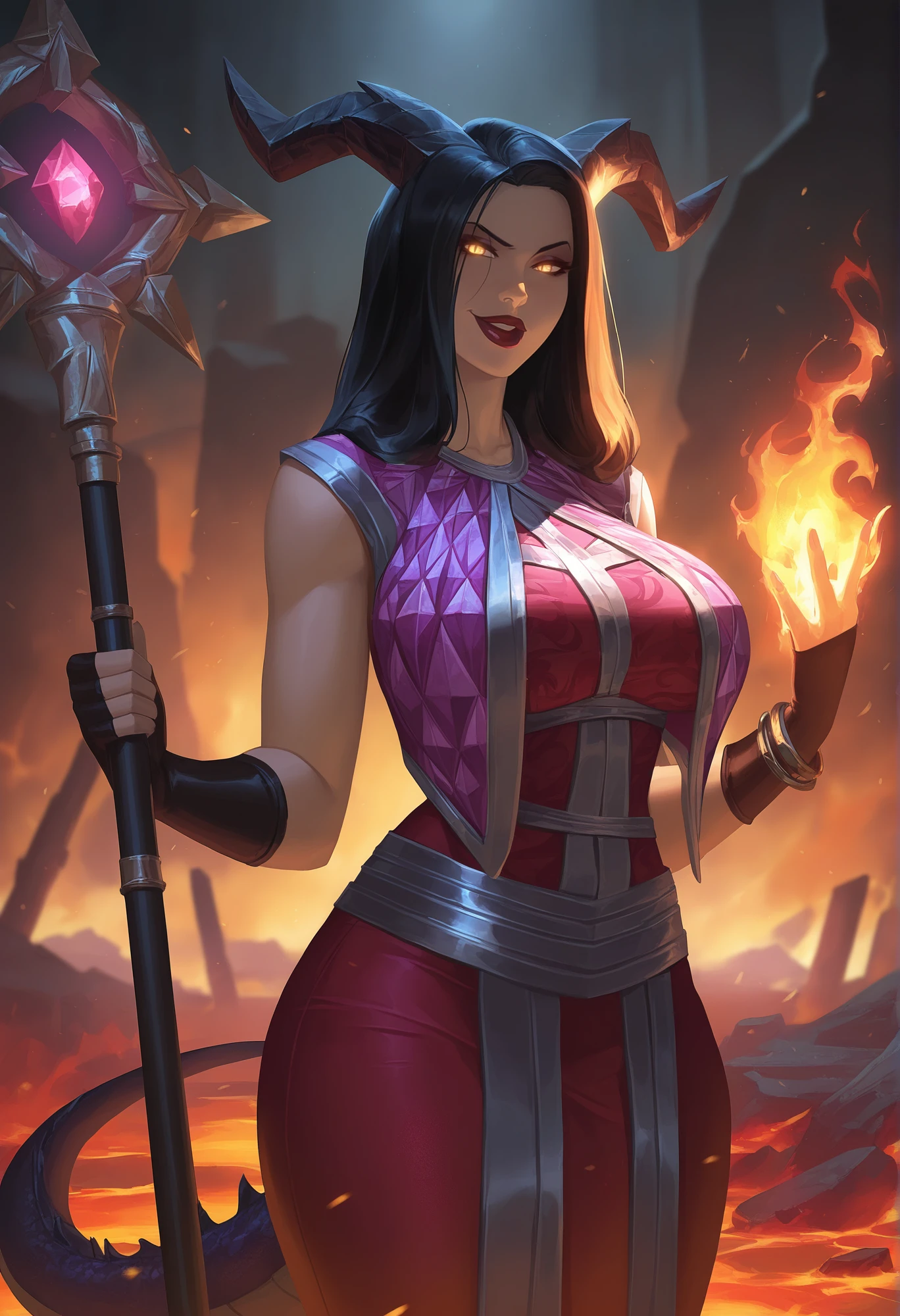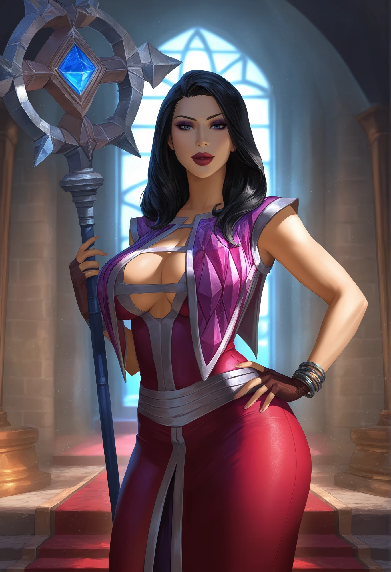 Onyxia,1girl, mature female, black hair, long hair, blue eyes, makeup, lipstick, robe, crop top, fingerless gloves, holding staff
