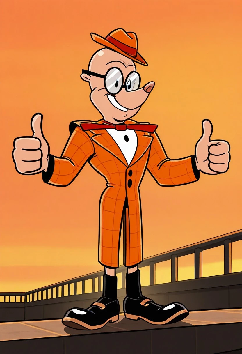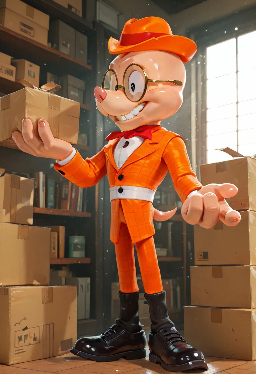 Wes Weasley, peach skin, long snout, pink nose, circular glasses, beady black eyes, bald, small orange hat, orange suit, red tie, white vest, black socks, black shoes