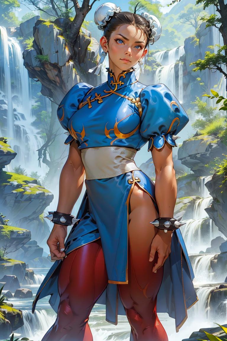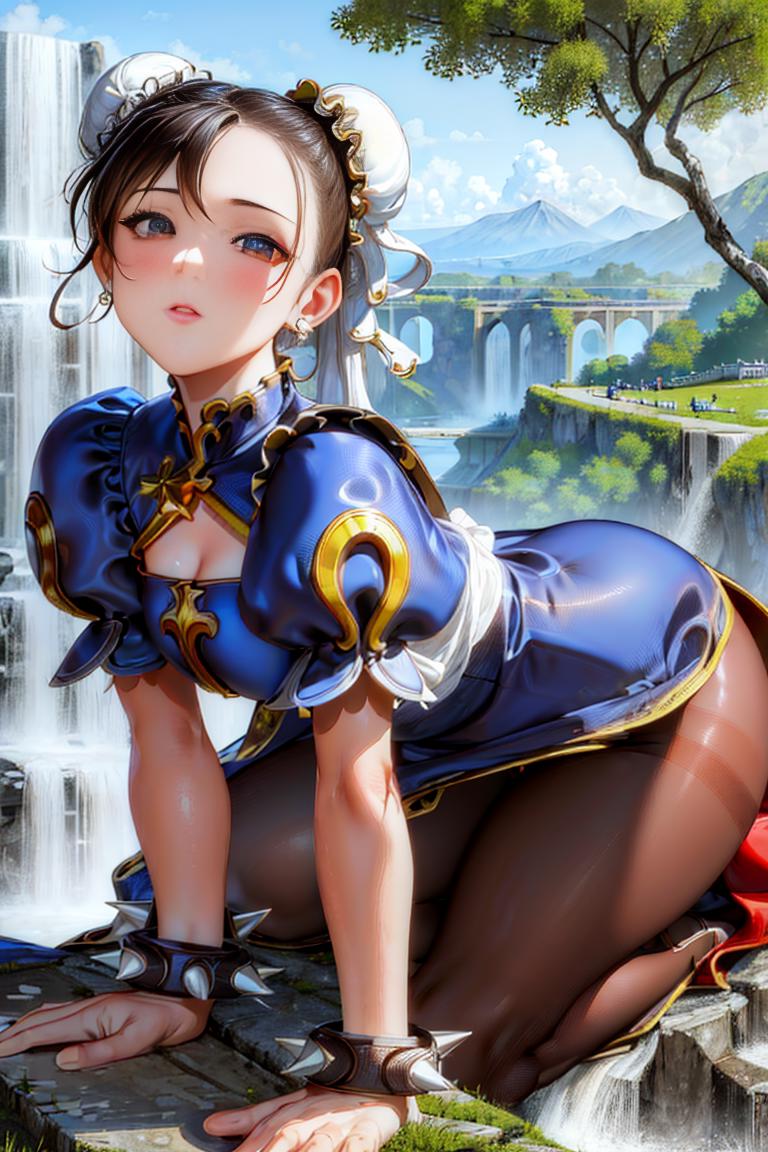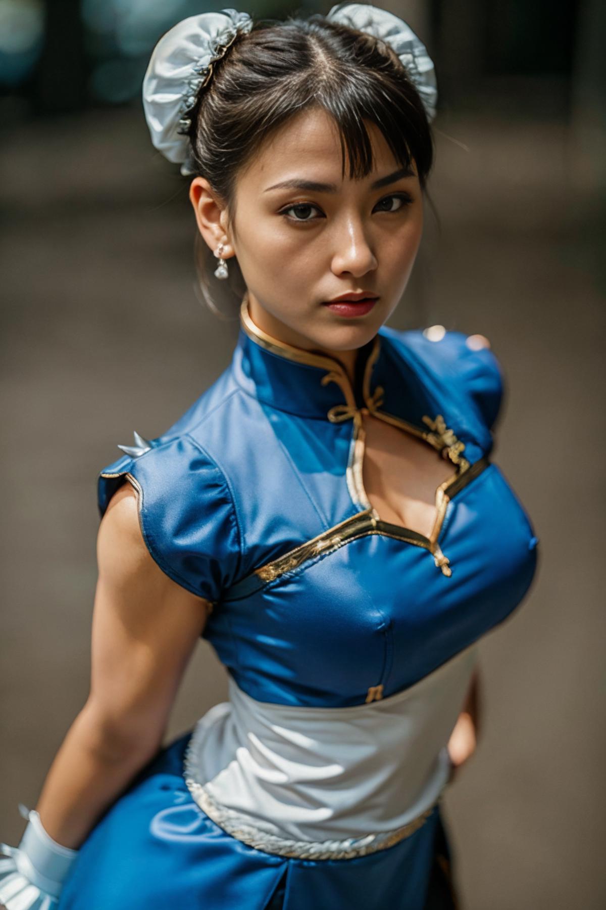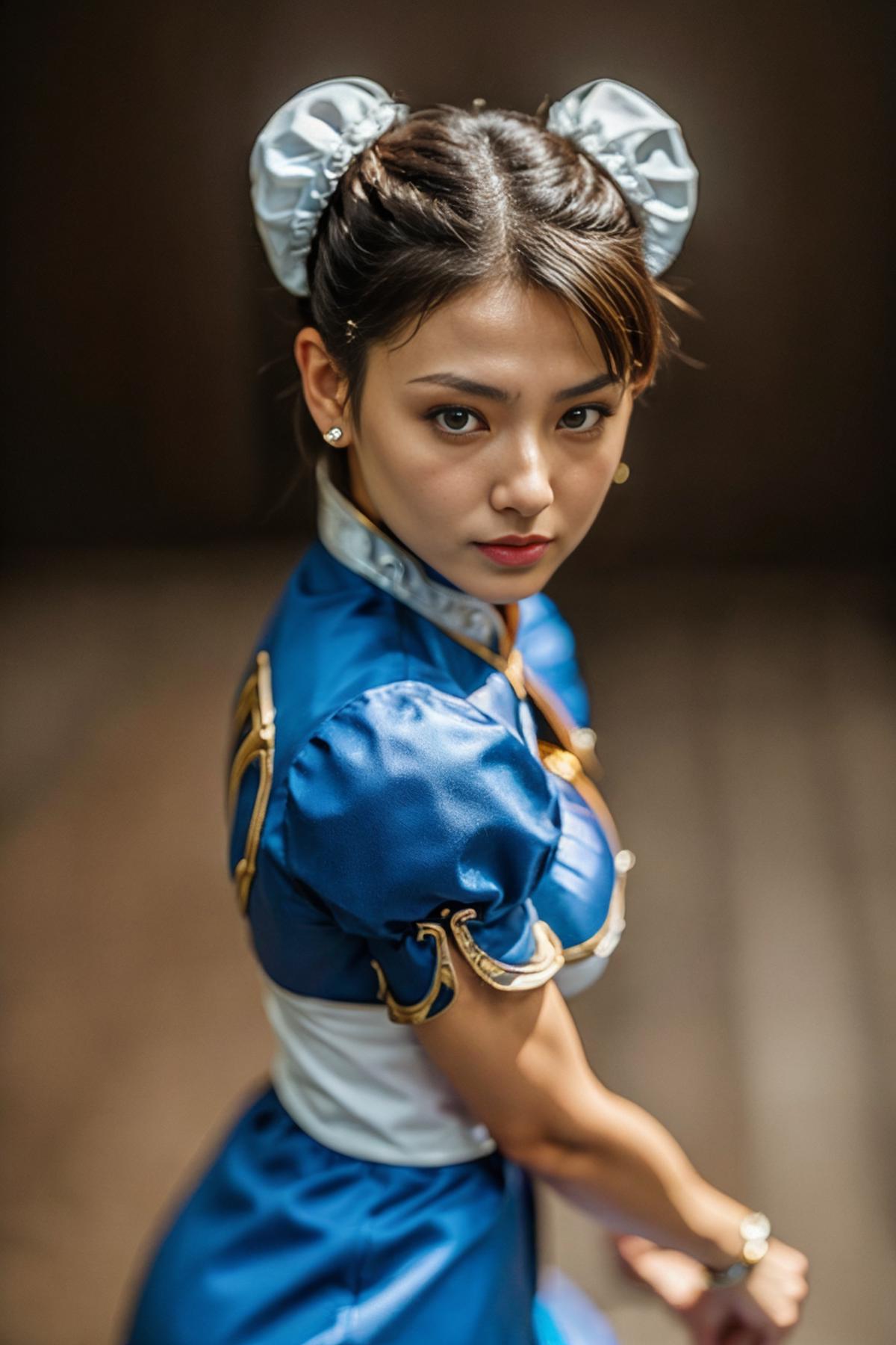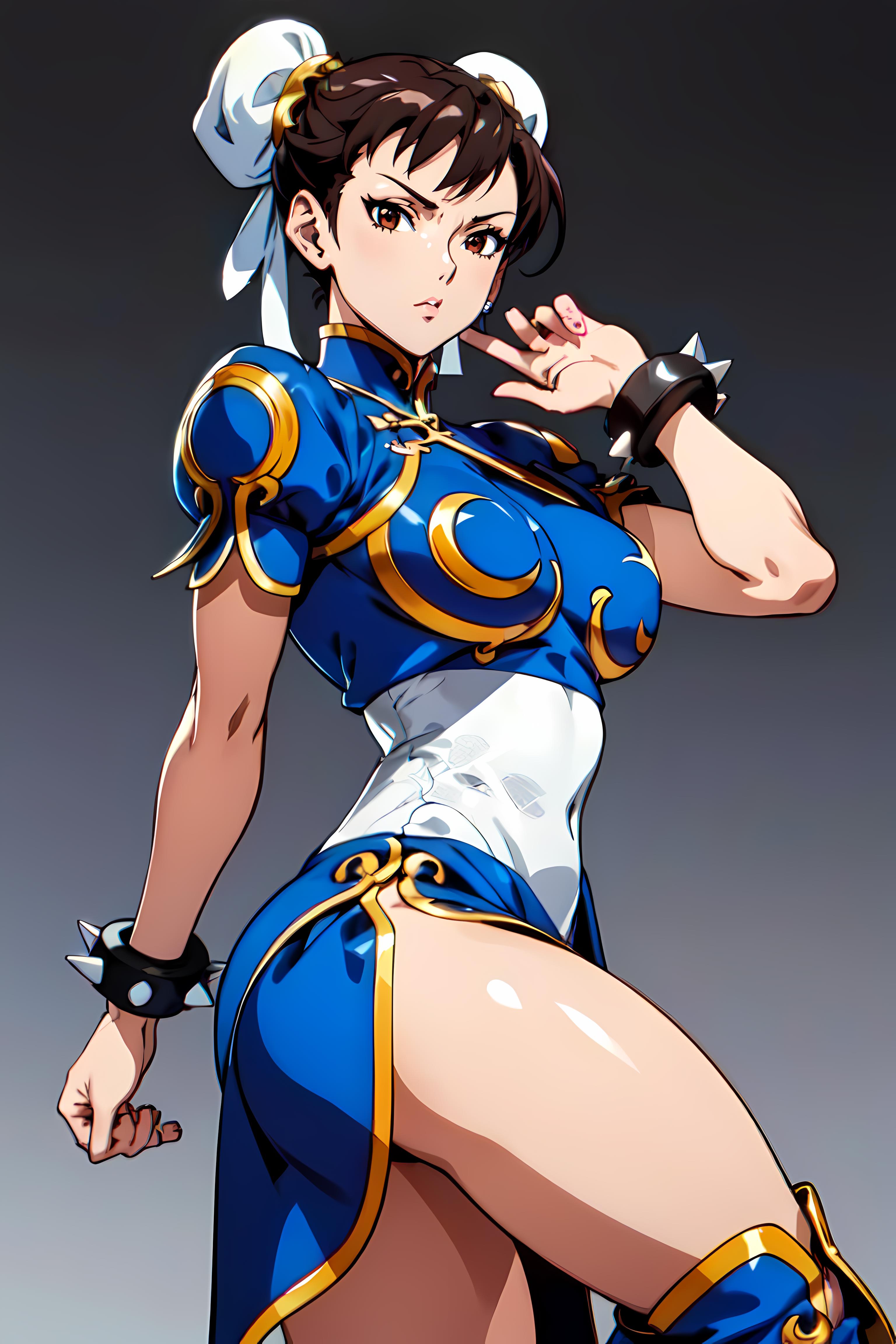 trigger-words: SF2CL, hair buns, covered buns, chinese dress, qipao, blue outfit, spiked bracelets, puffy sleeves, brown pantyhose, white belt, white boots