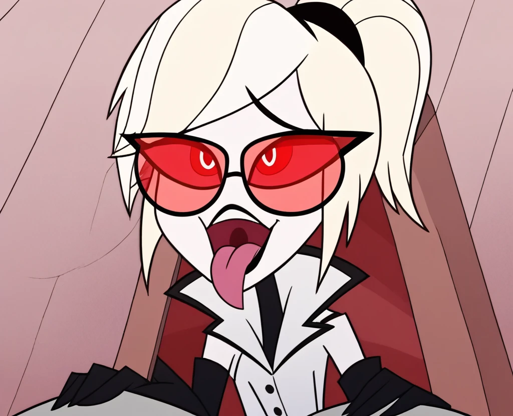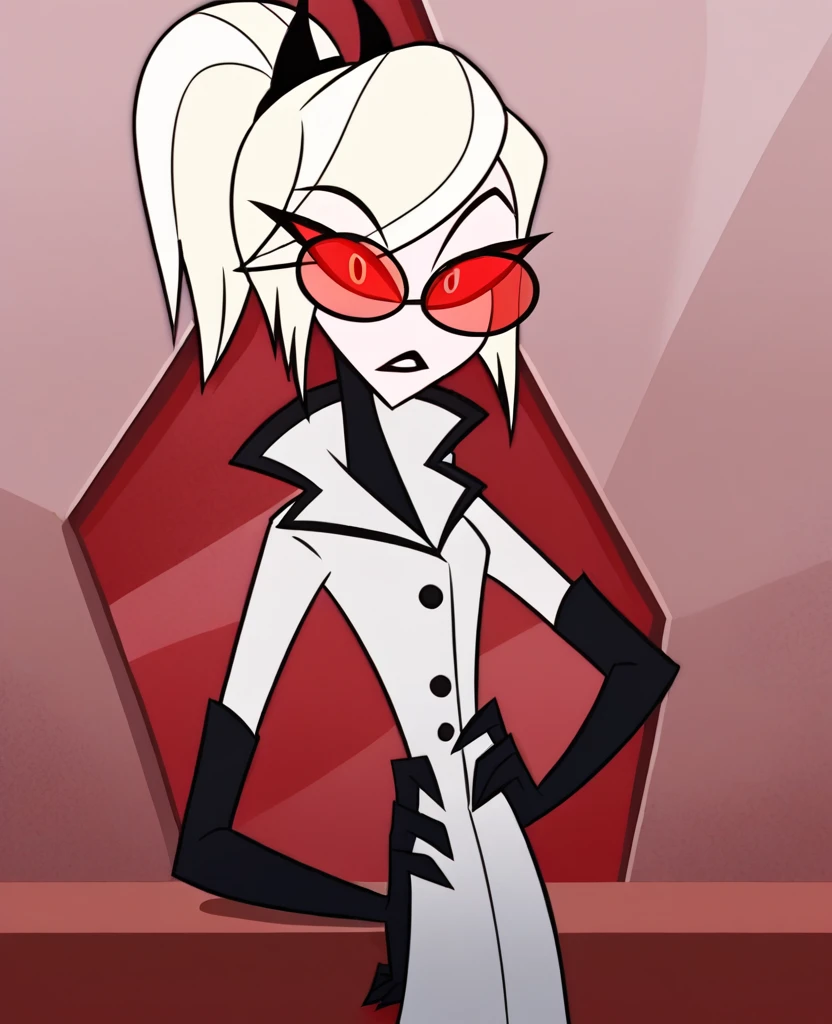 odc1, white hair, red sclera, short hair, ponytail, white eyes, coat, red-tinted eyewear, elbow gloves, shoes,