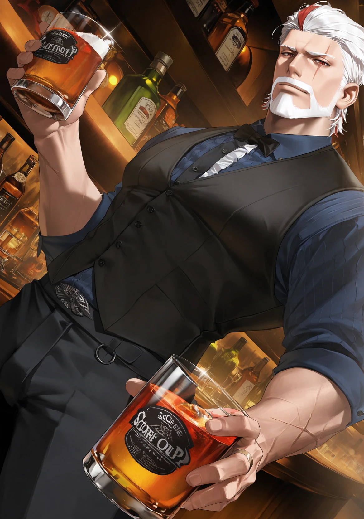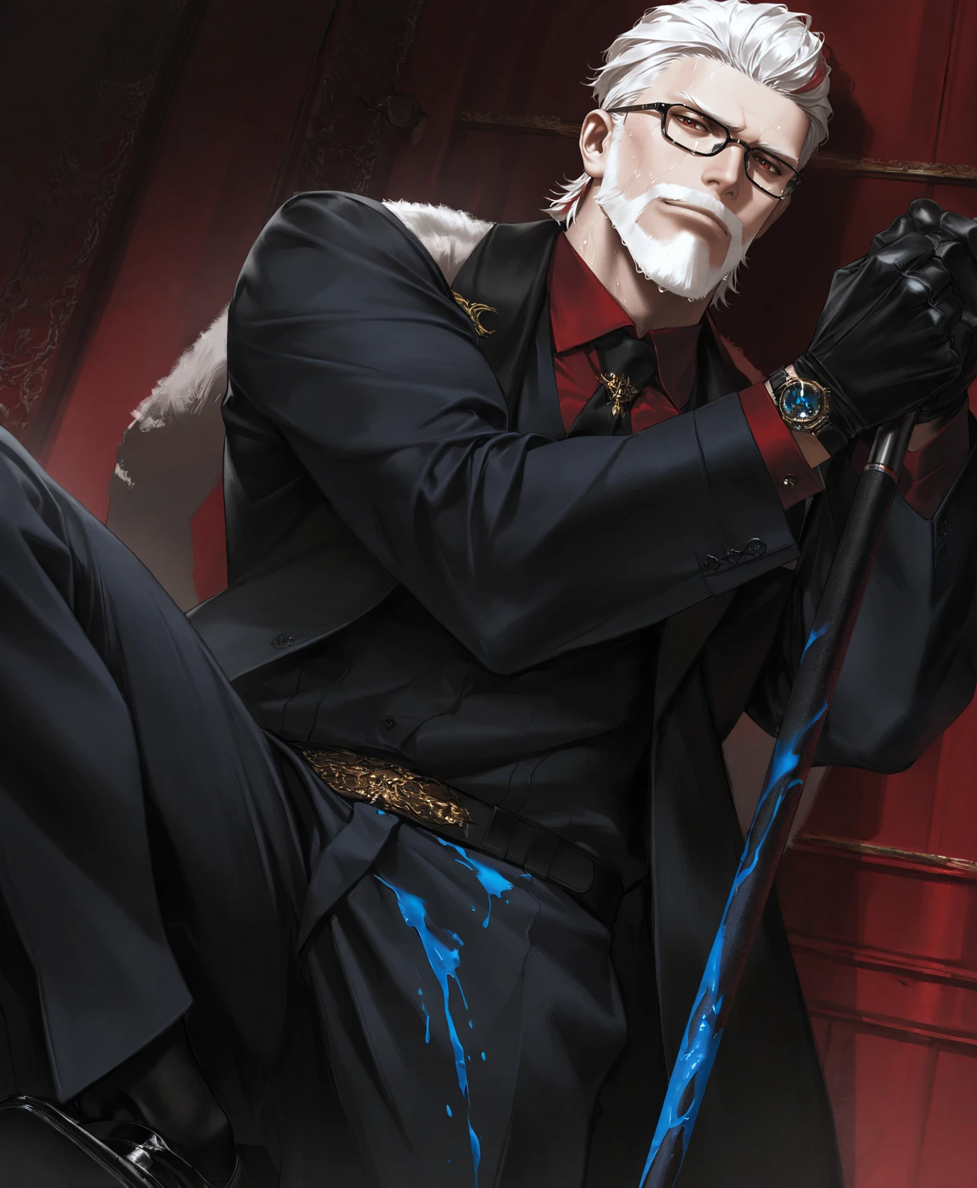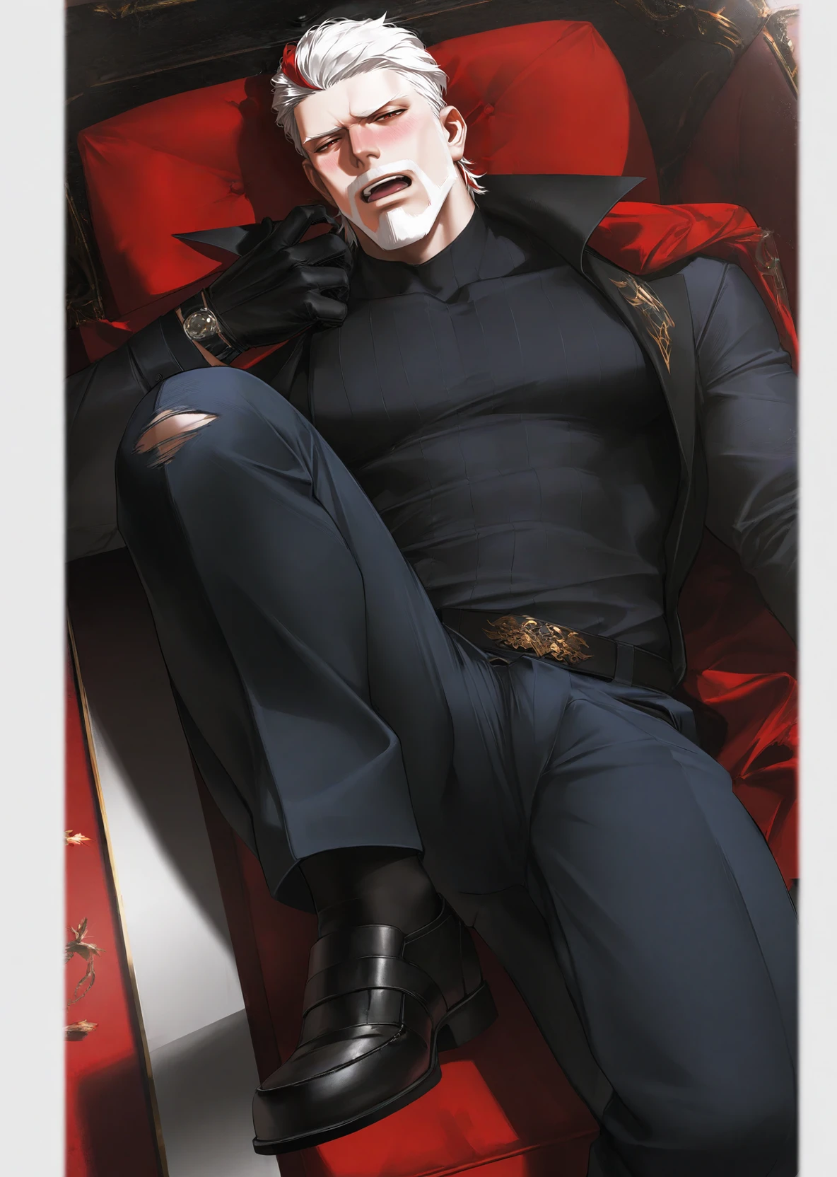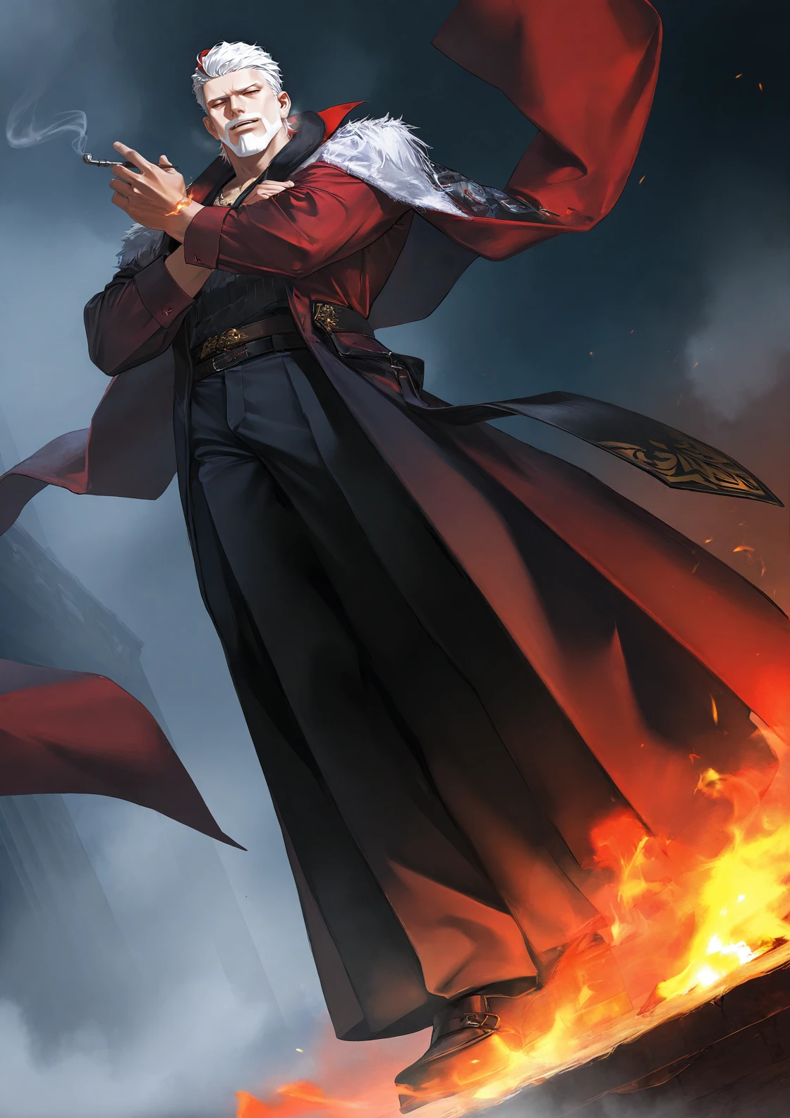 1boy,beard,white hair,facial hair,beard,mature male,mustache,short hair,red eyes