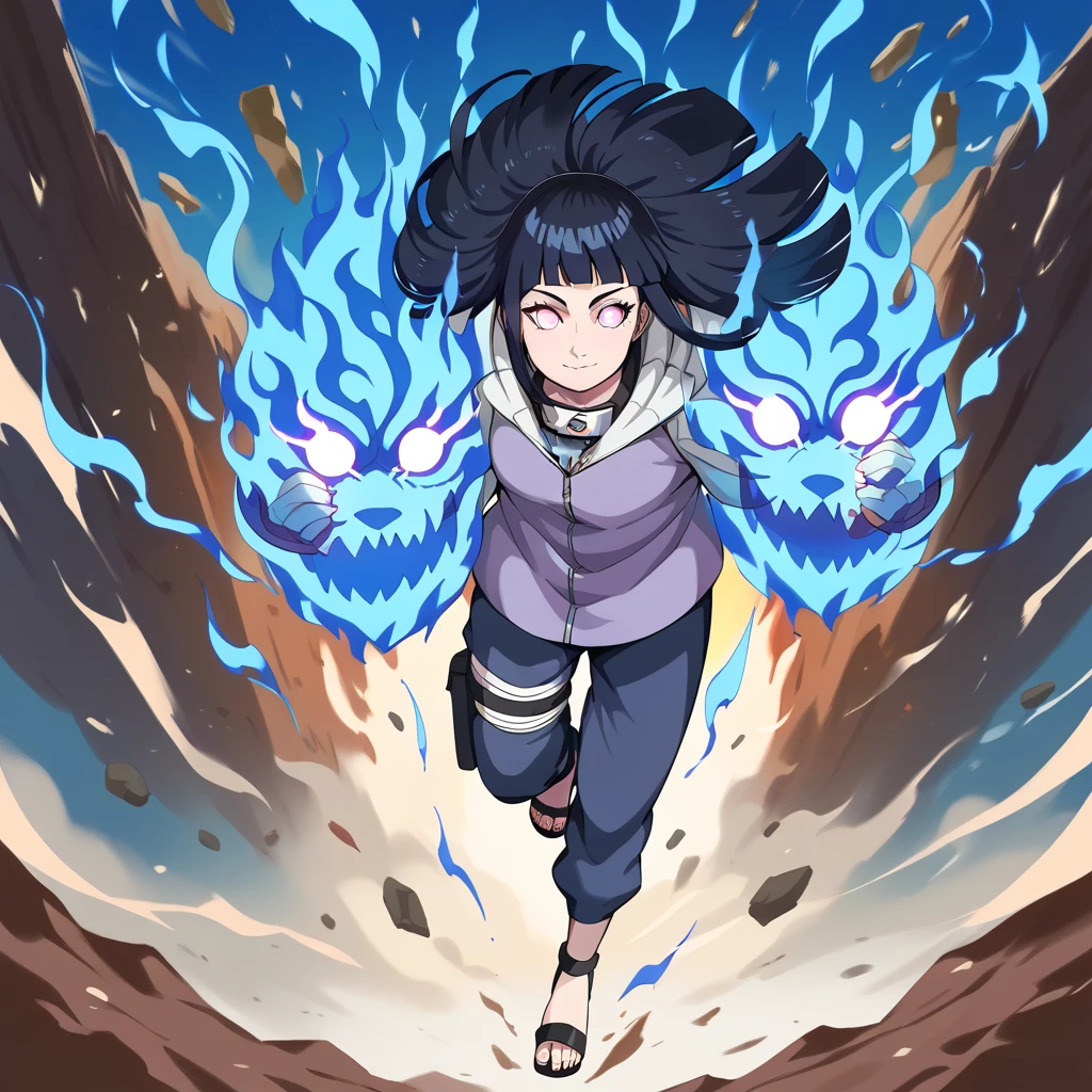 Hinata Hyuga,long hair,blunt bangs,dark blue hair,light eyes,forehead protector,konohagakure symbol,purple and white hooded jacket,fishnets,blue pants,holster,bandage on thigh,open sandals