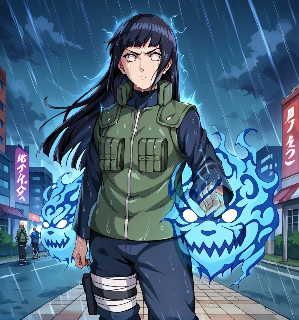 Hinata Hyuga,long hair,blunt bangs,dark blue hair,light eyes,green jonin vest,turtle neck,dark blue pants,holster,bandage on thigh,bandaged shins,blue sandals