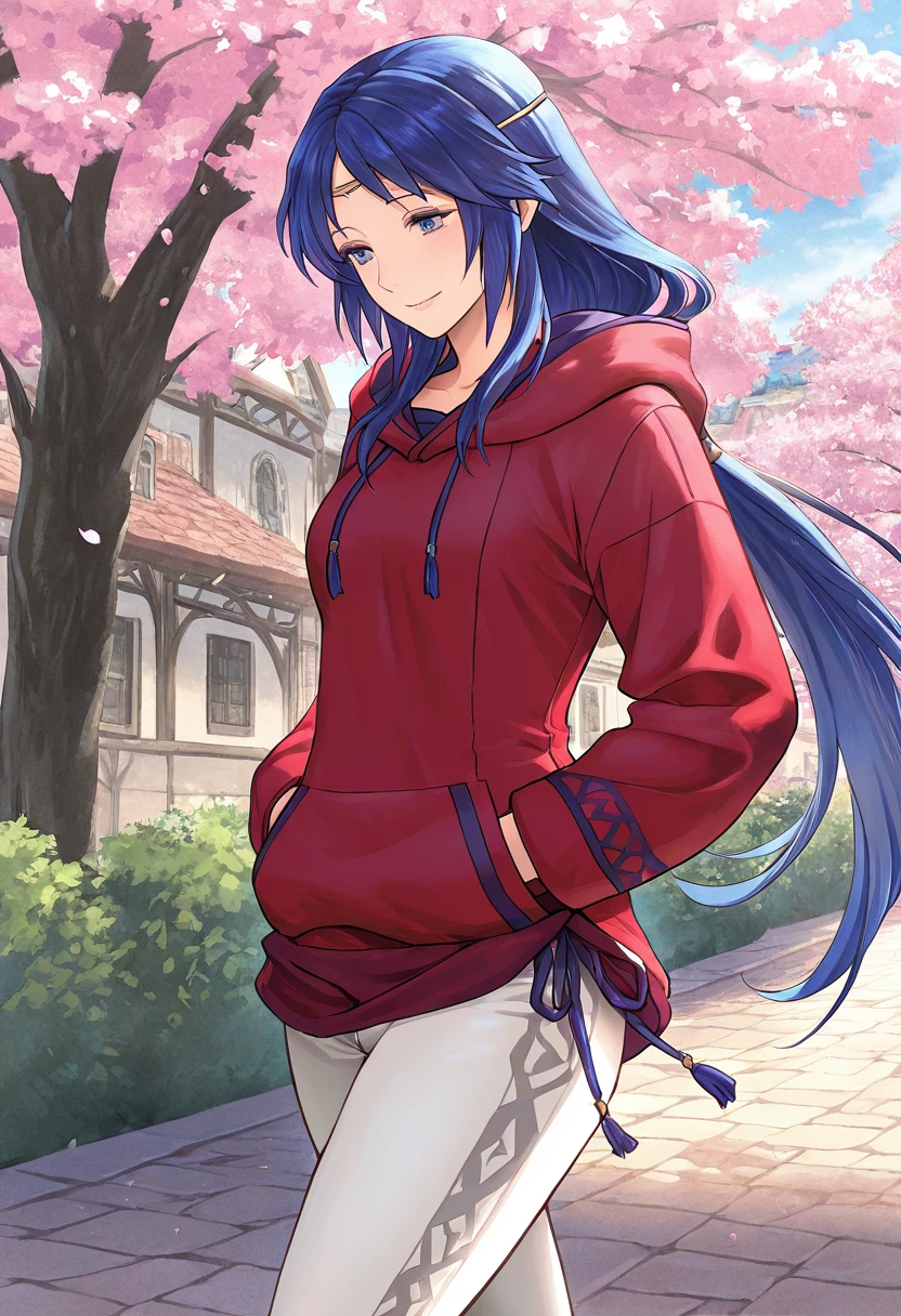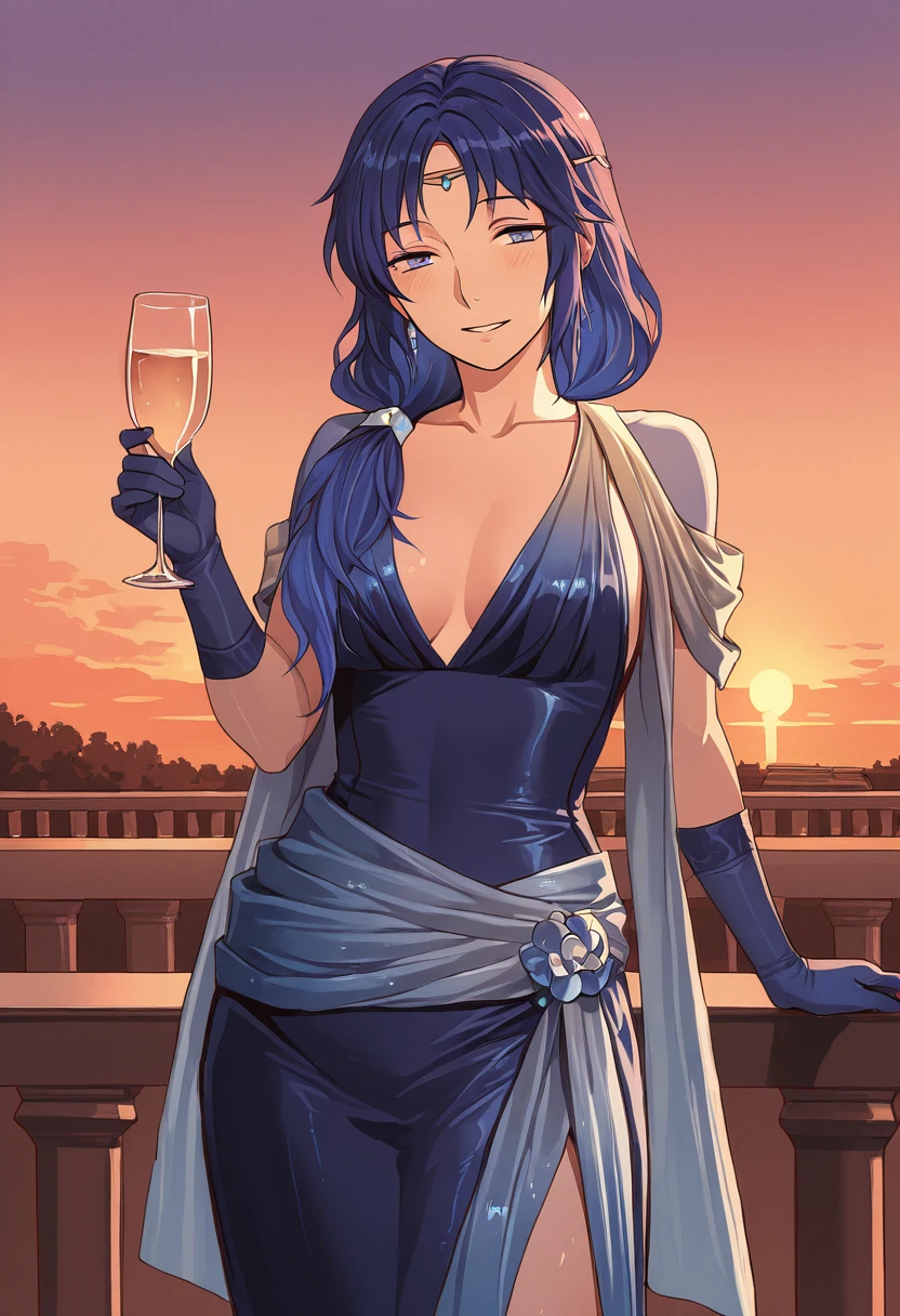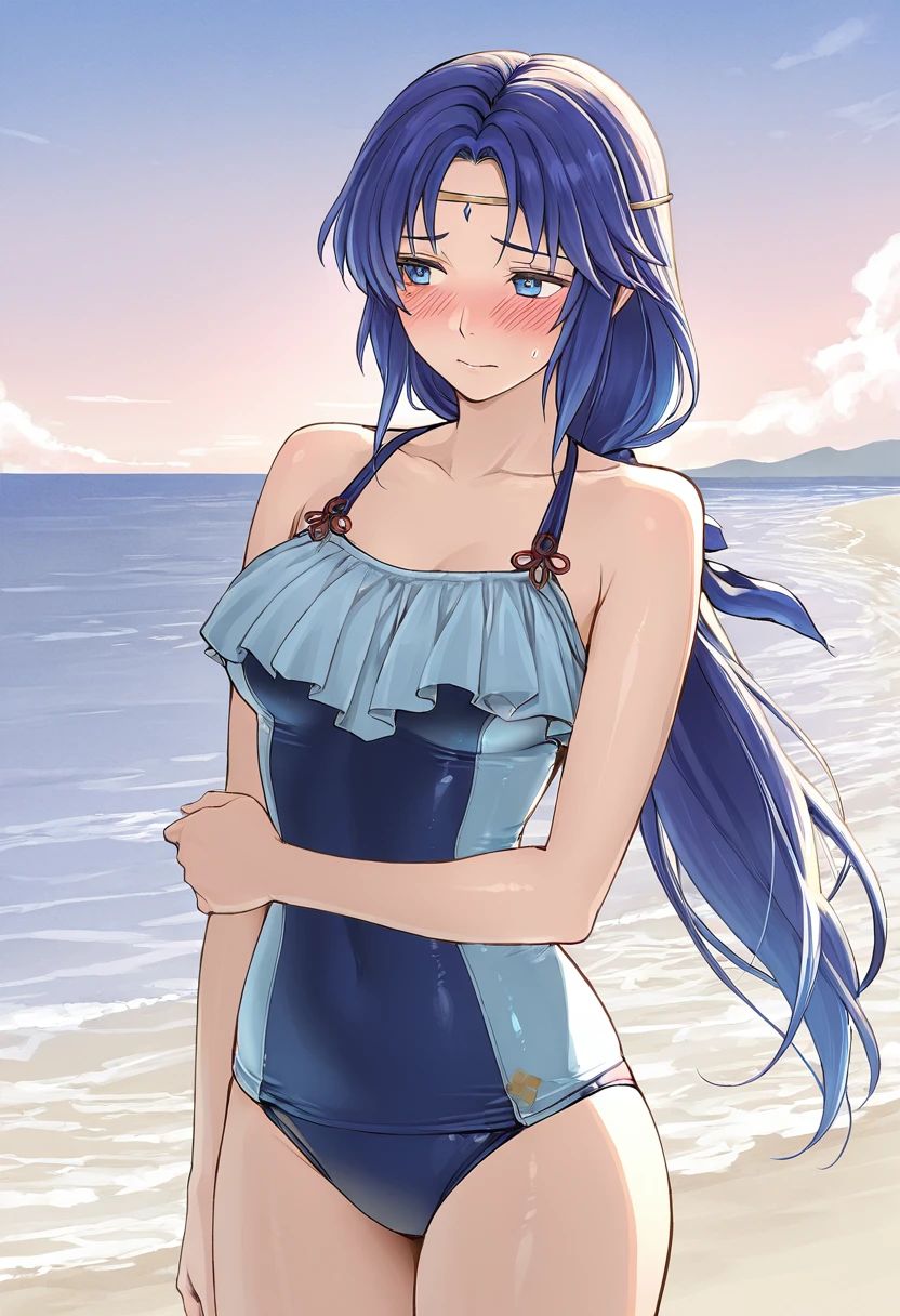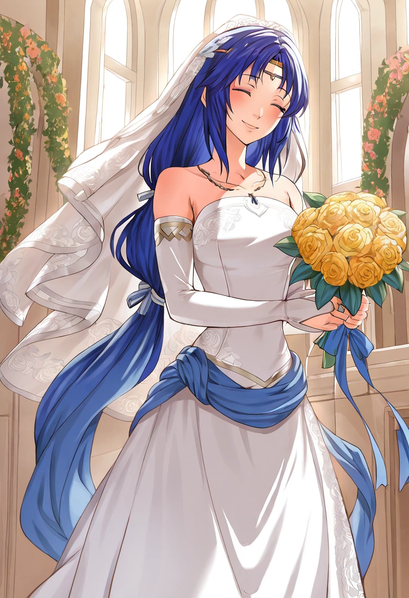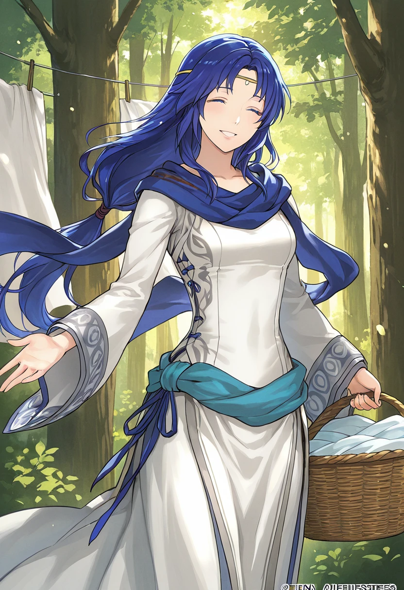 ElenaFE, blue hair, long hair, blue eyes, circlet, low ponytail,