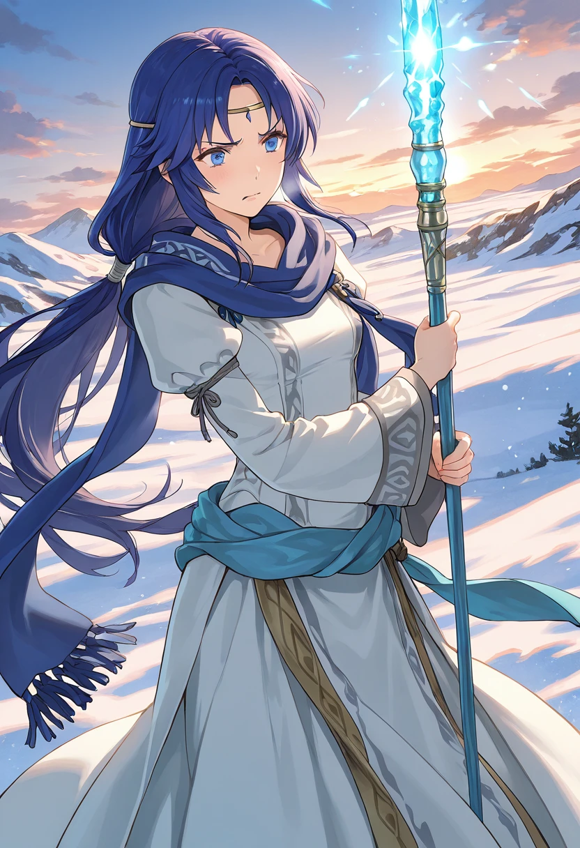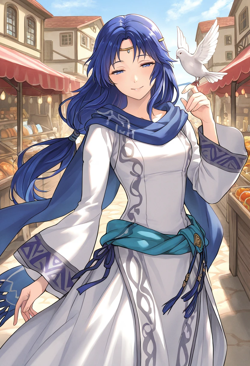 Trigger Words: ElenaFE, blue hair, long hair, blue eyes, circlet, low ponytail, pale blue scarf, white dress, long sleeves, long dress, teal sash, layered dress, brown boots