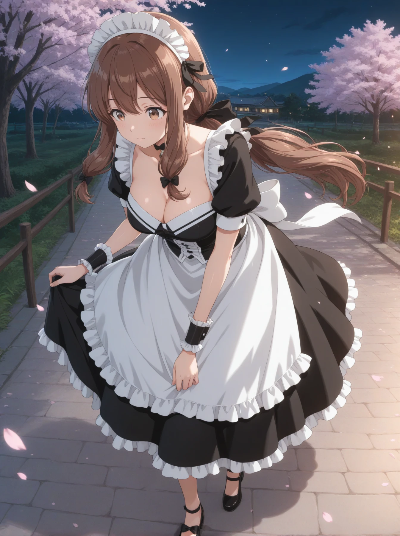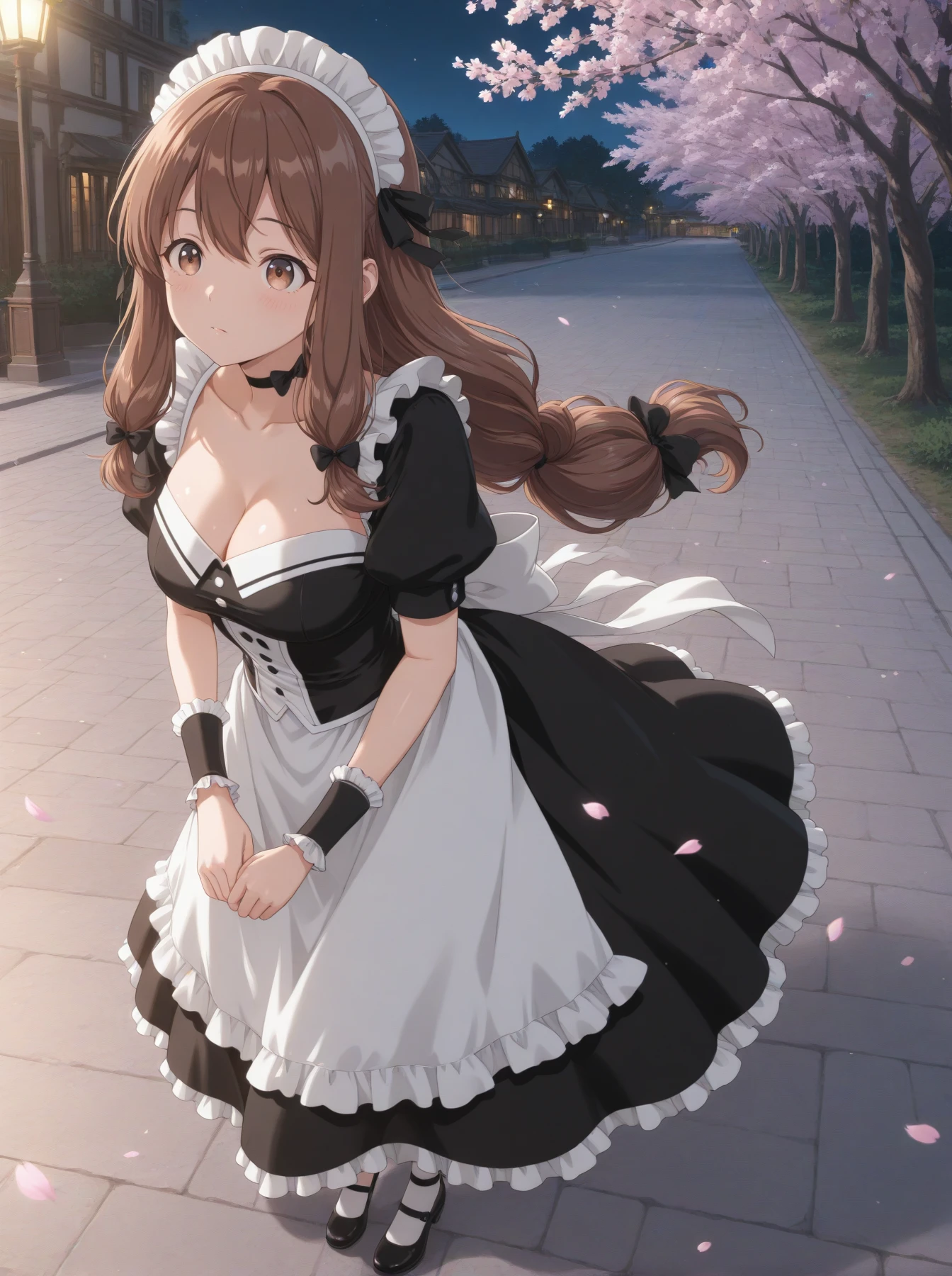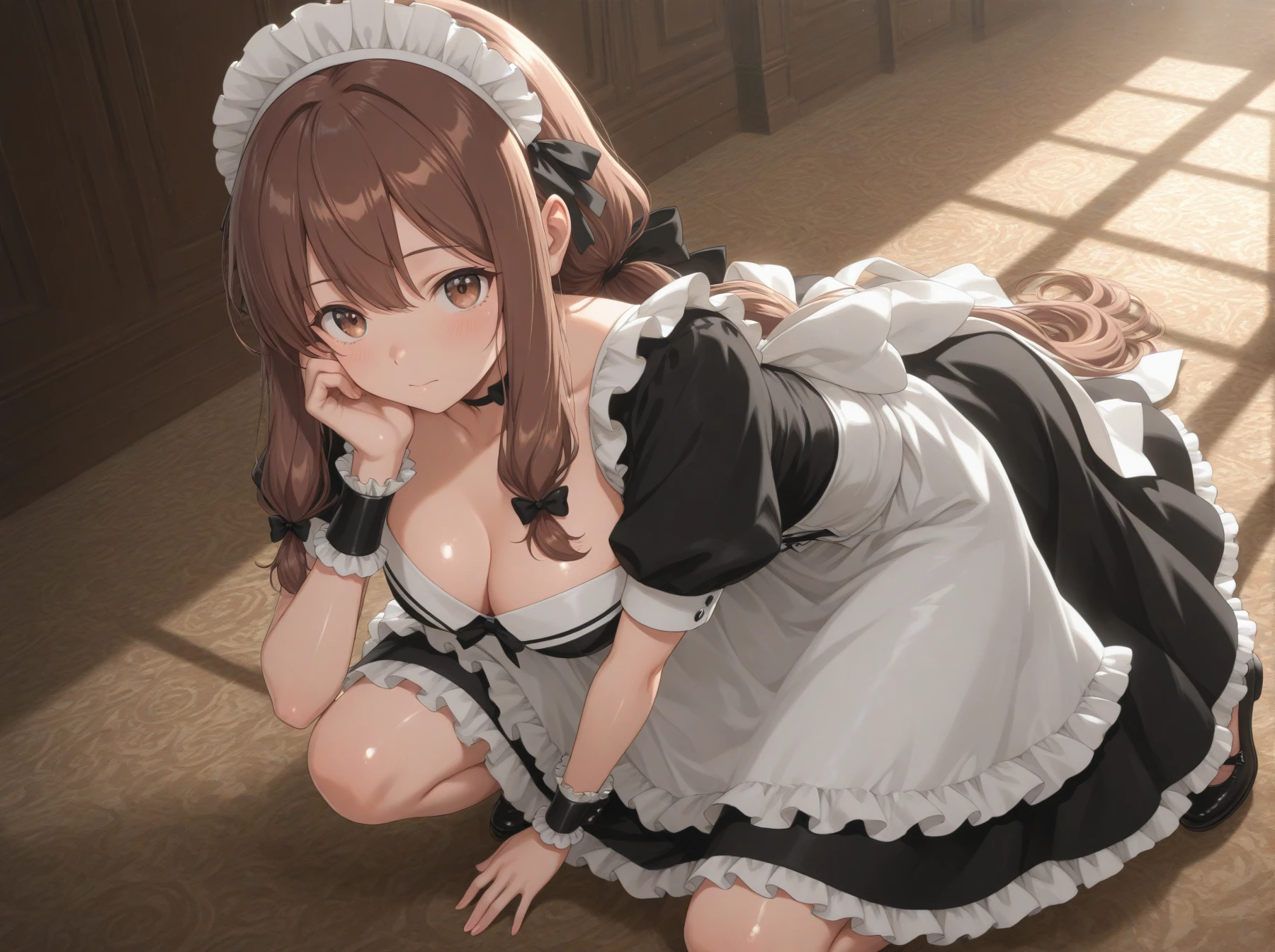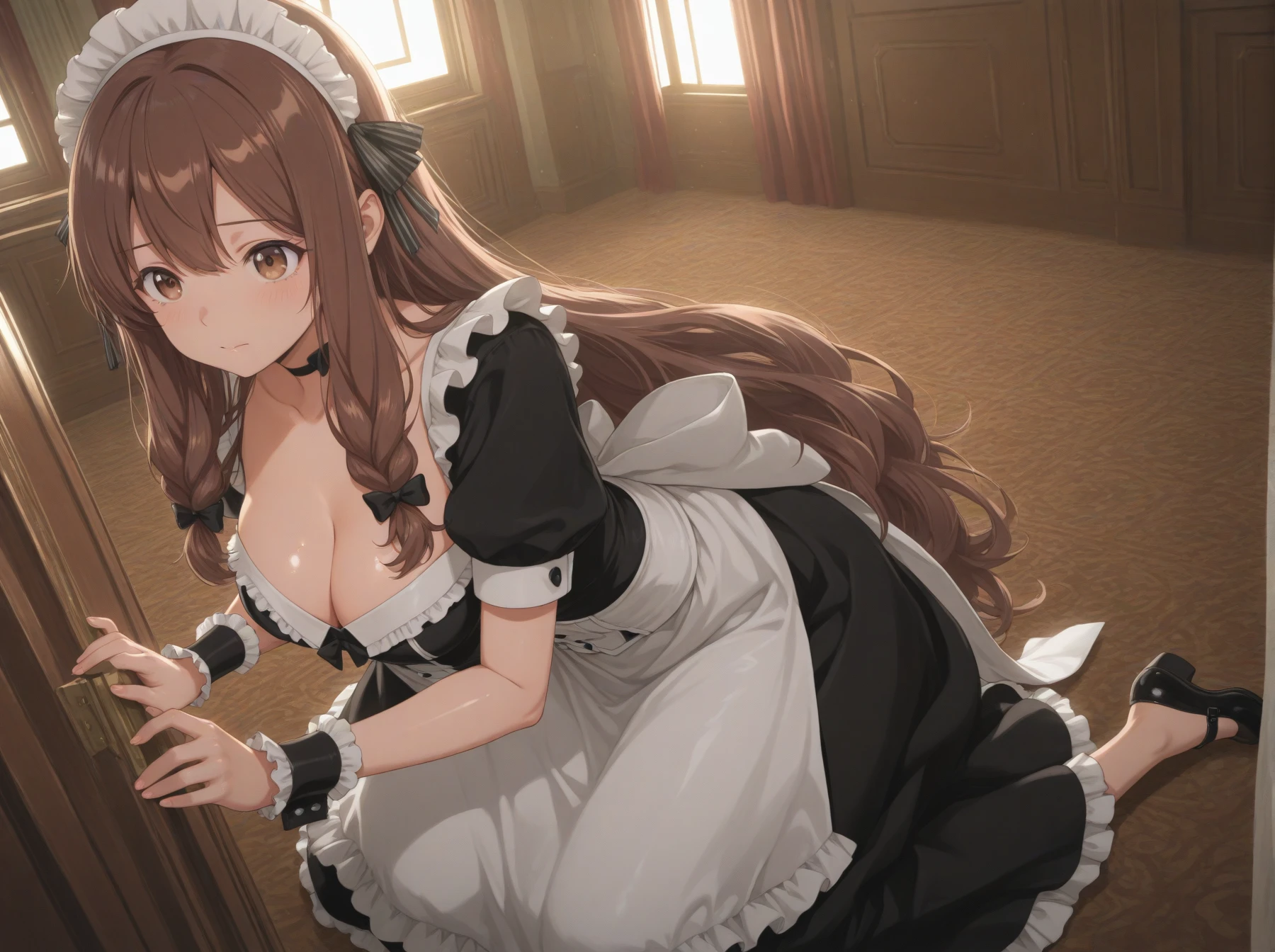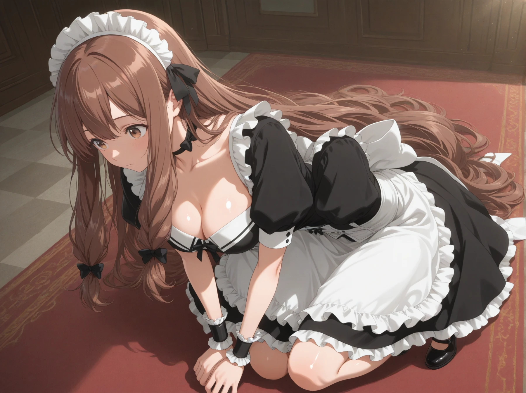 Clothes: (maid uniform, maid headdress, wrist cuffs, choker, bows, black dress shoes, cleavage)
