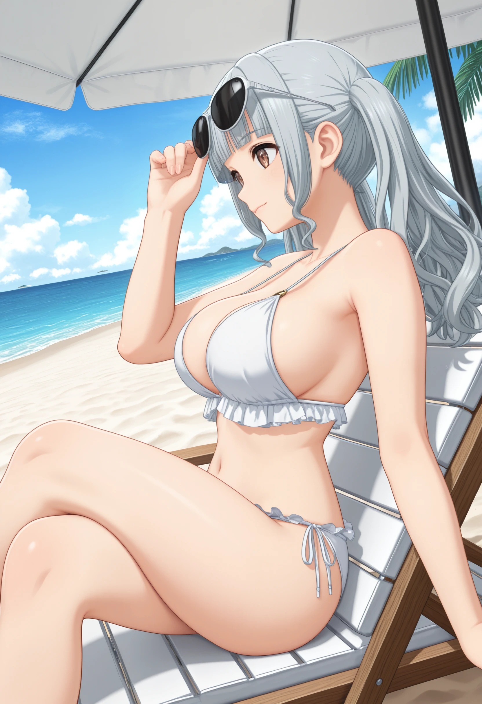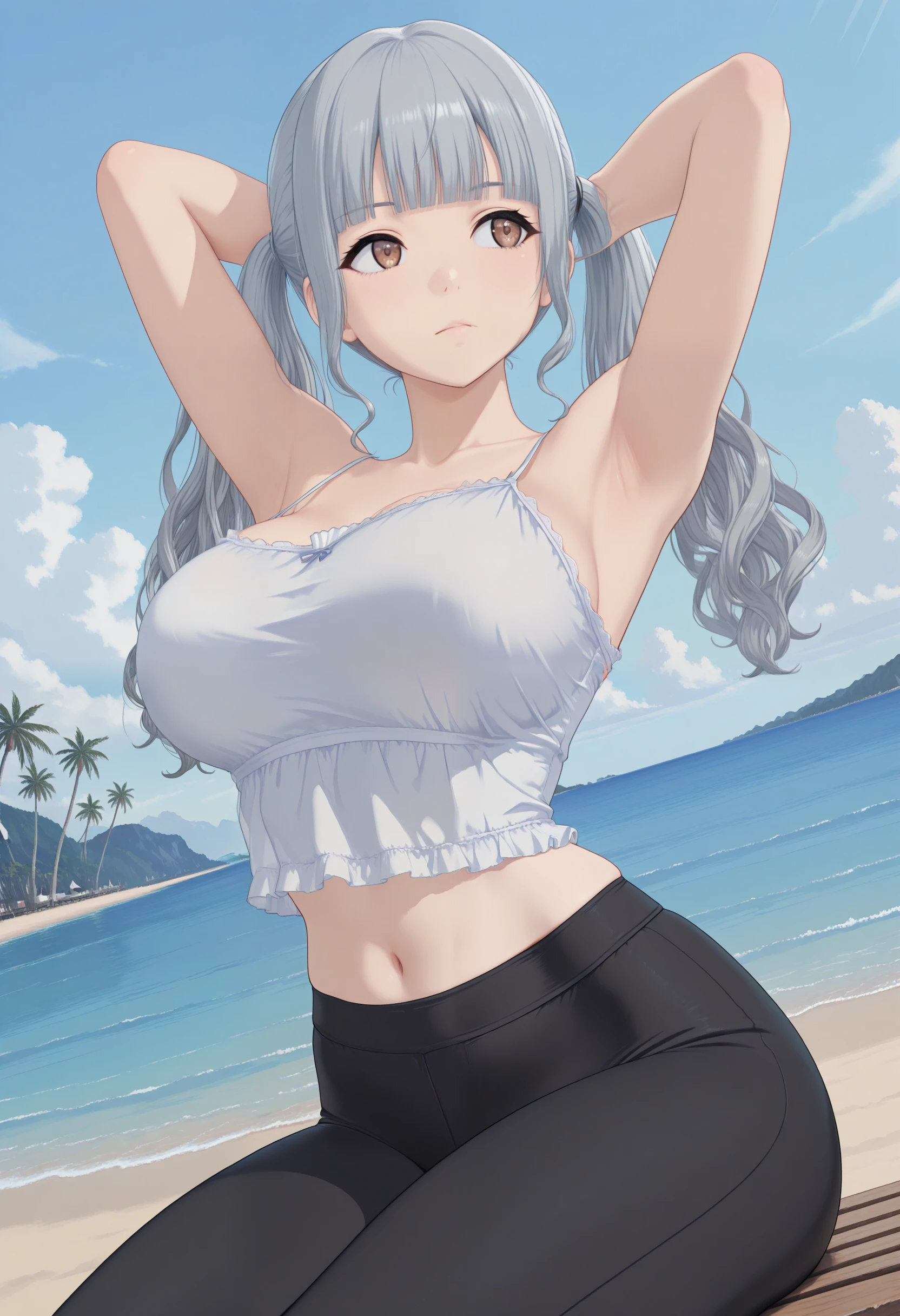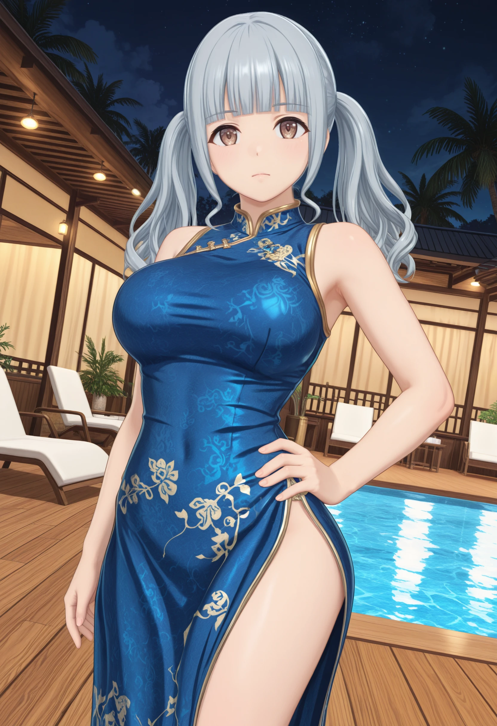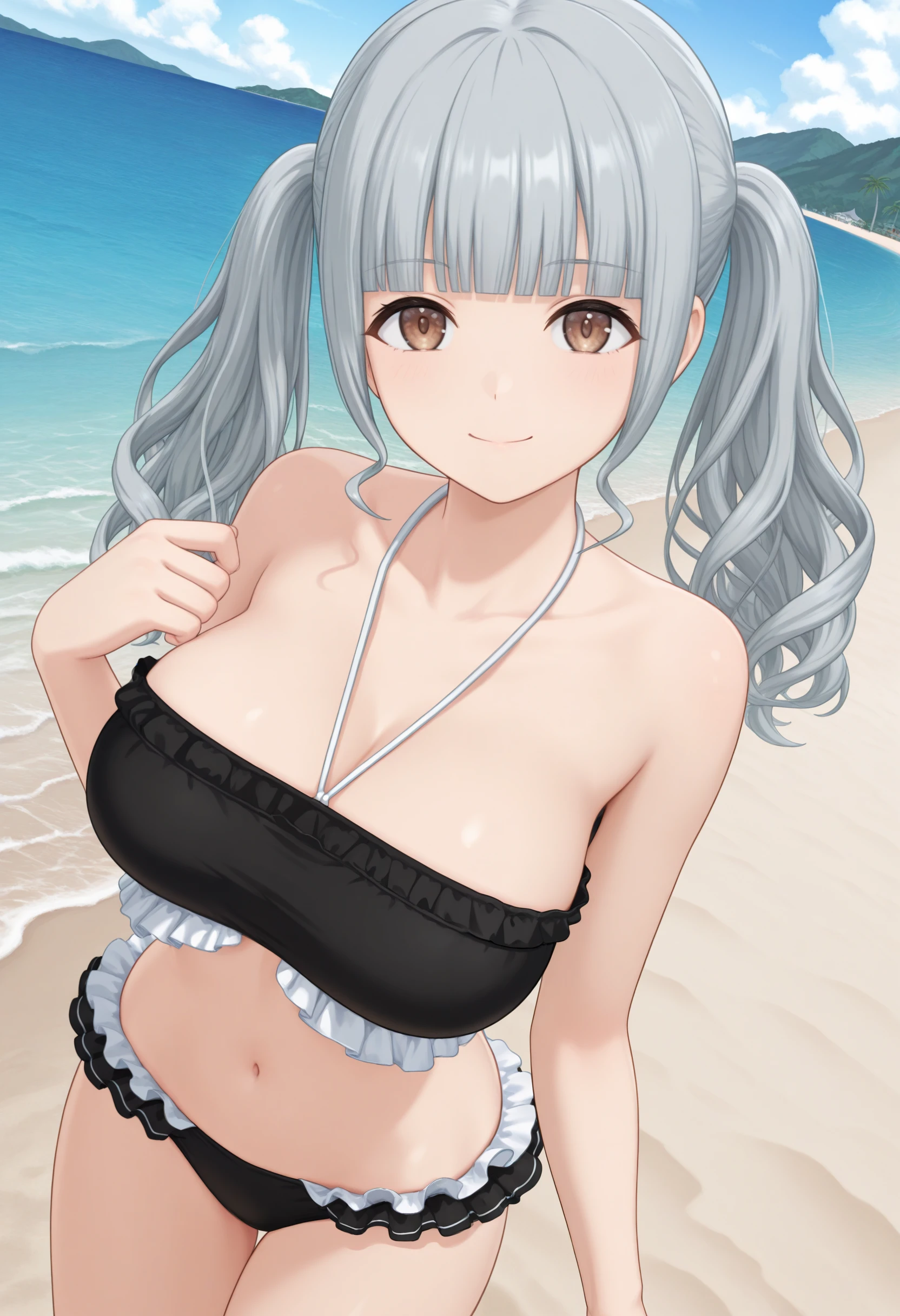 Character:"NagatoMei_Dolwv,brown eyes,grey hair,blunt bangs,sidelocks,long hair,wavy hair,twintails,large breasts"