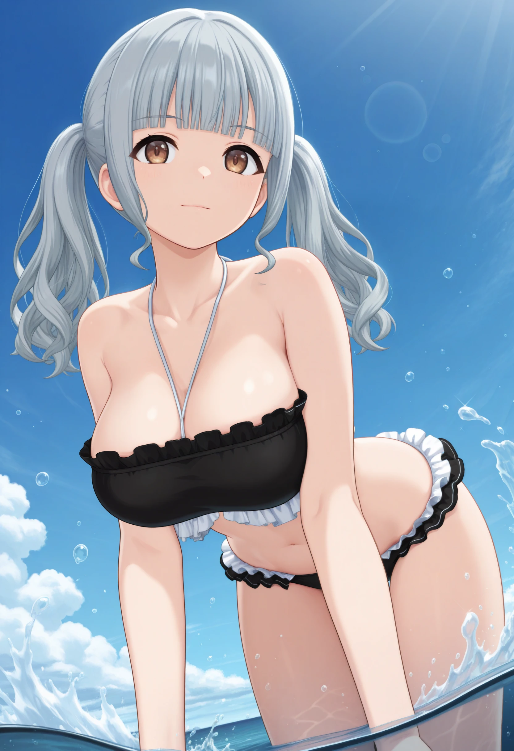 水着:"halterneck,strapless black bikini,frilled bikini,white ankle strap,black strappy heels"
