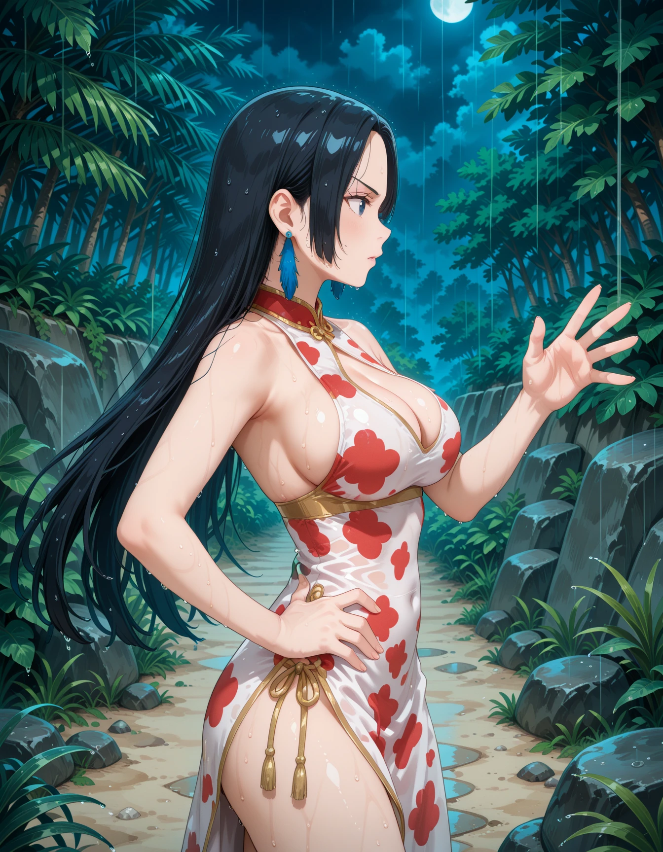 boa hancock, black hair, black eyes, official alternative dress, blue feather earrings, white china dress, cow print, red pattern, cleavage cutout, gold side-tie, gold sash, side slit, pelvic curtain,