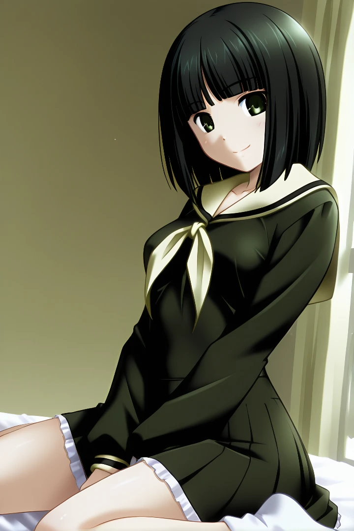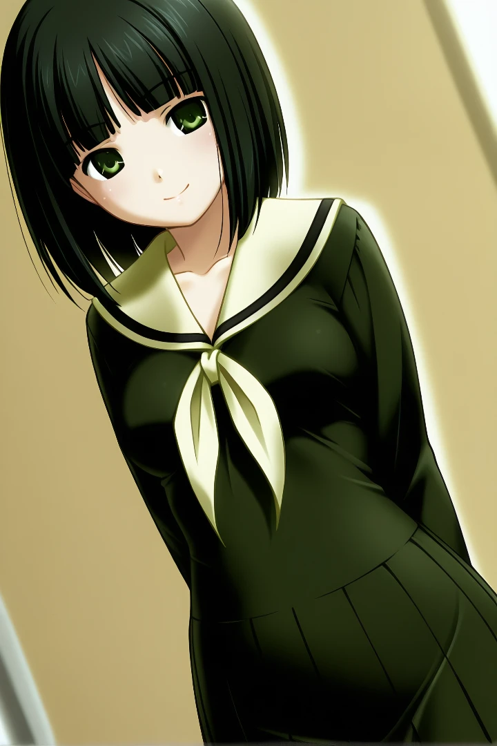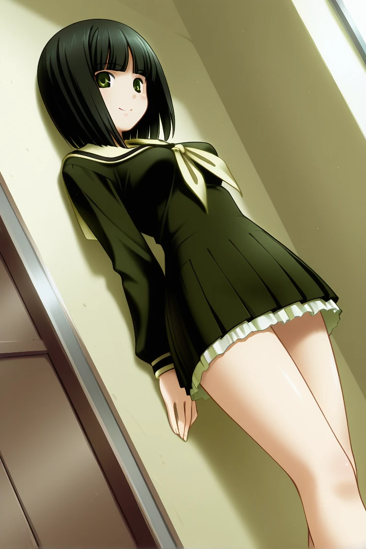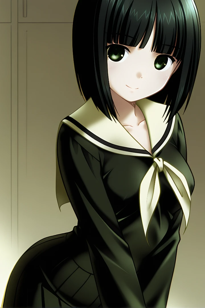 nijonariko, bob cut, black hair, green eyes, short hair, medium breasts, 1girl, lillian girls' academy school uniform, serafuku, skirt, white socks,
