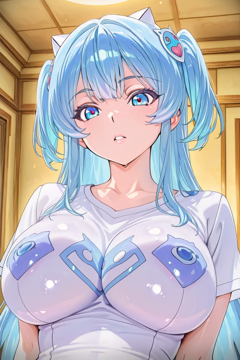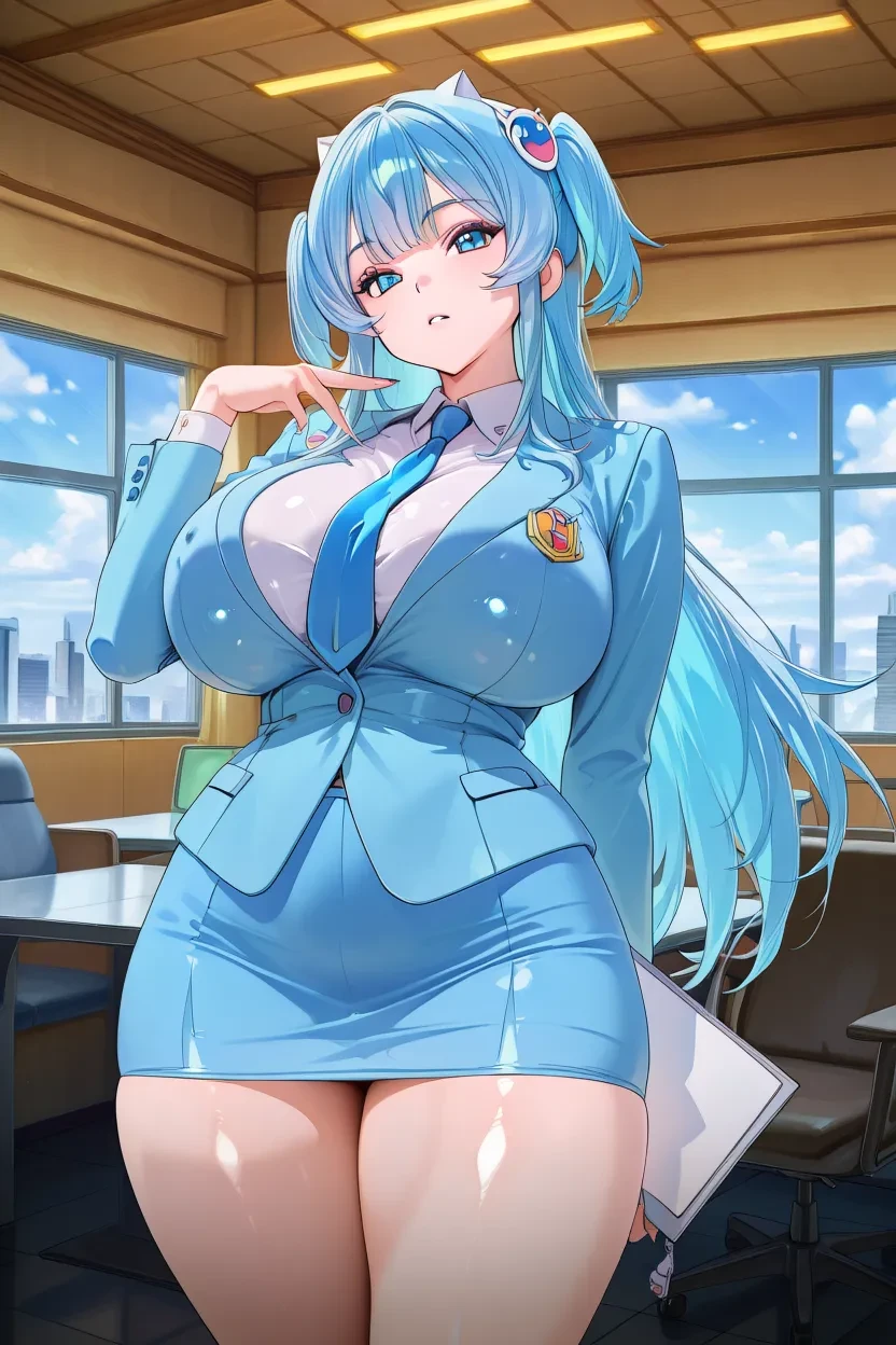 1girl, Mekami Shifty, blue eyes, multicolored hair blue hair, long hair, glossy lips, massive breasts, curvy, extremely sexy, wide hips, thick thighs, headset, body suit, white body suit, detached sleeves, anime_coloring, anime_source, HD, Hi-res, superb quality, No-Flaws