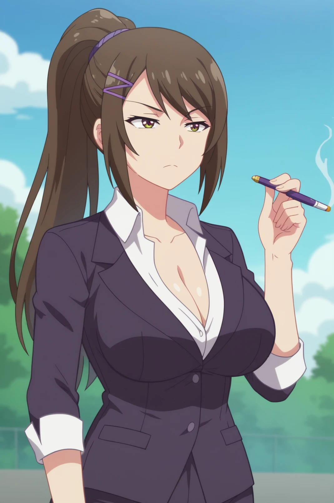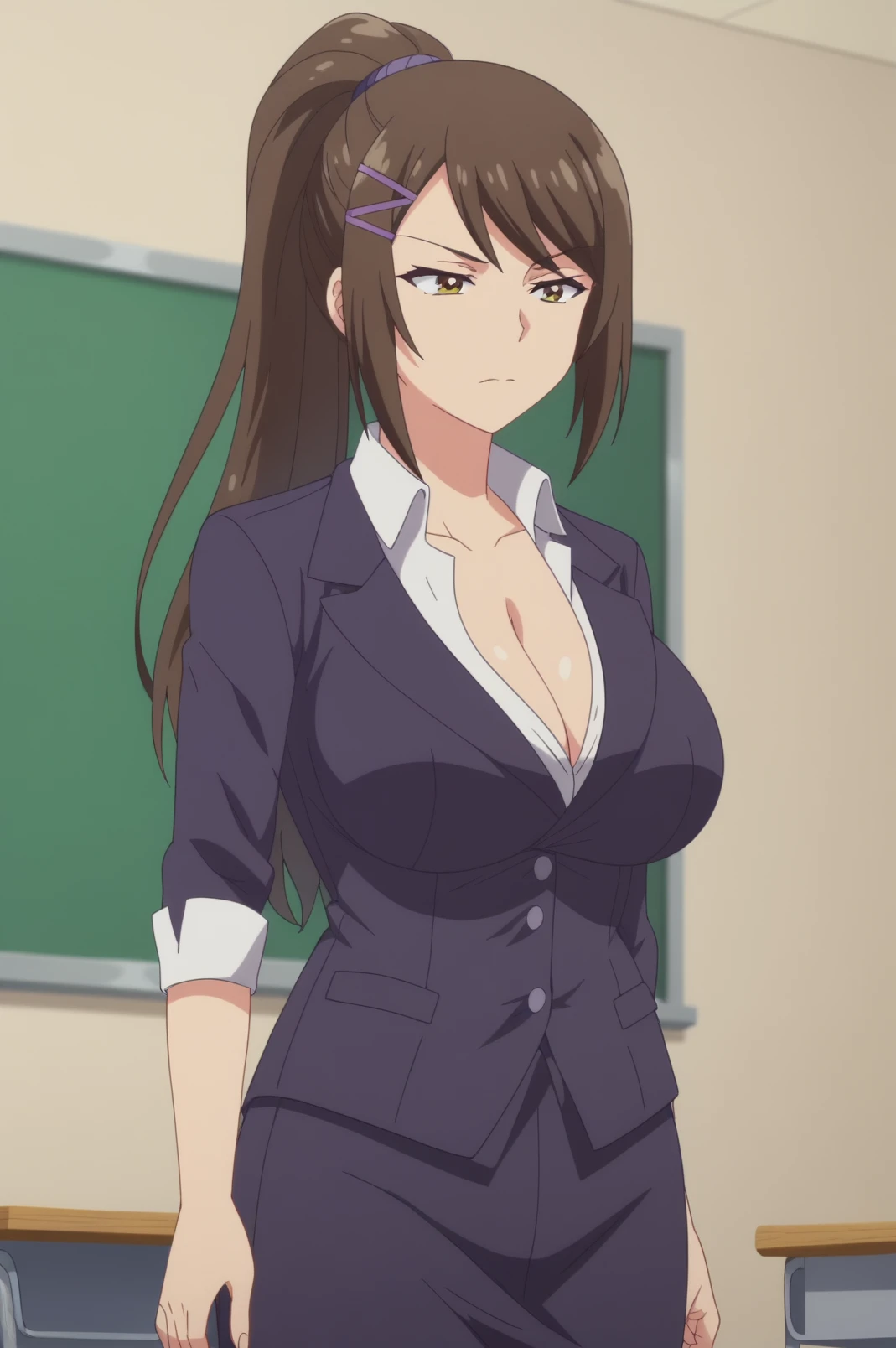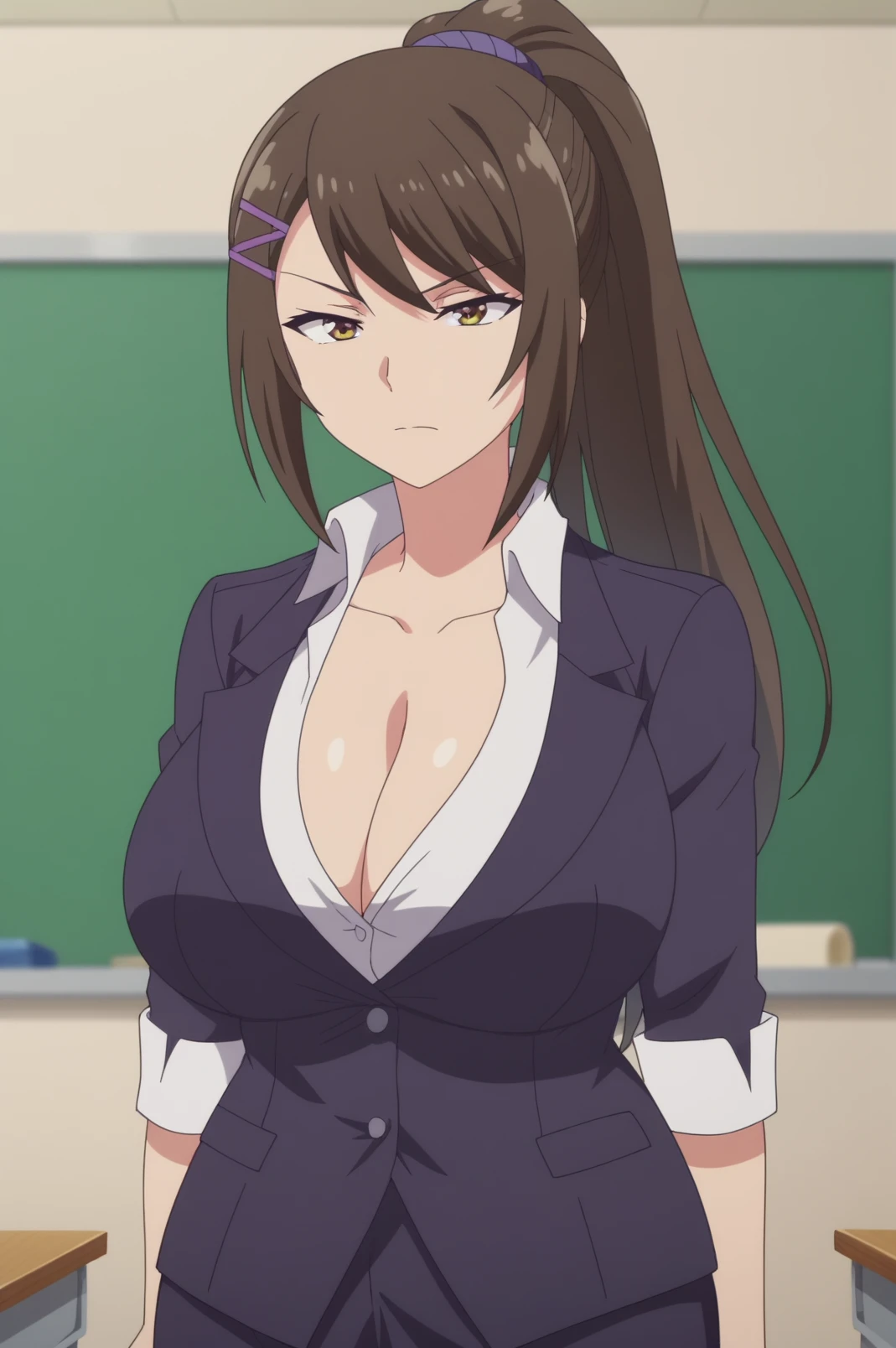 sae chabashira,long hair,hair ornament, hair clip,ponytail,breasts,collared shirt,cleavage,large breasts