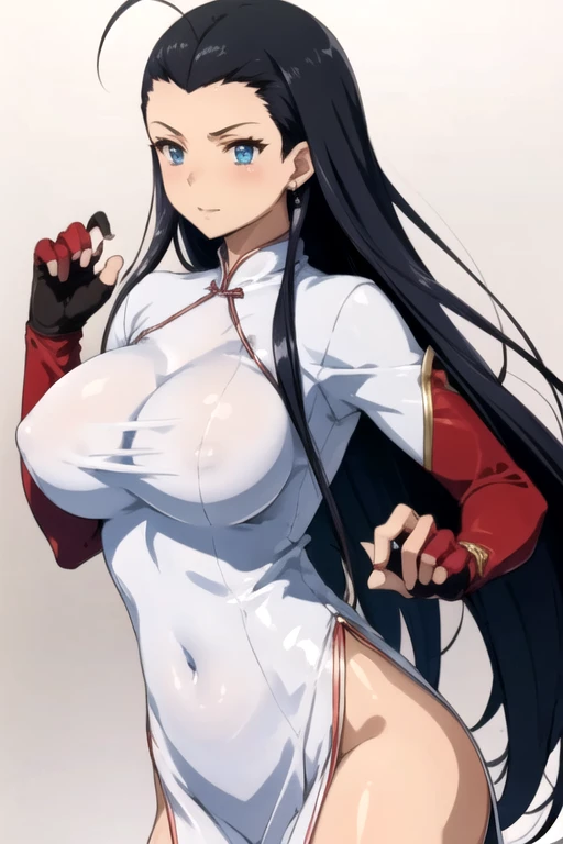 KakouenMyousai, 1girl, solo, very long hair, blue eyes, large breasts, black hair, fingerless gloves, white dress, jewelry, chinese clothes, china dress, red gloves, hair pulled back, magatama earrings, side slit