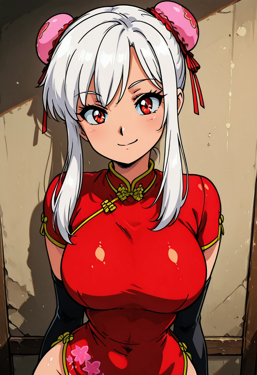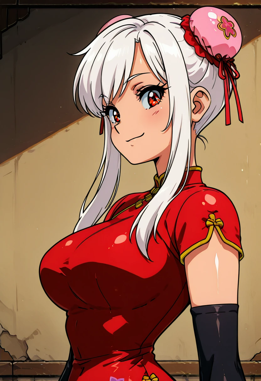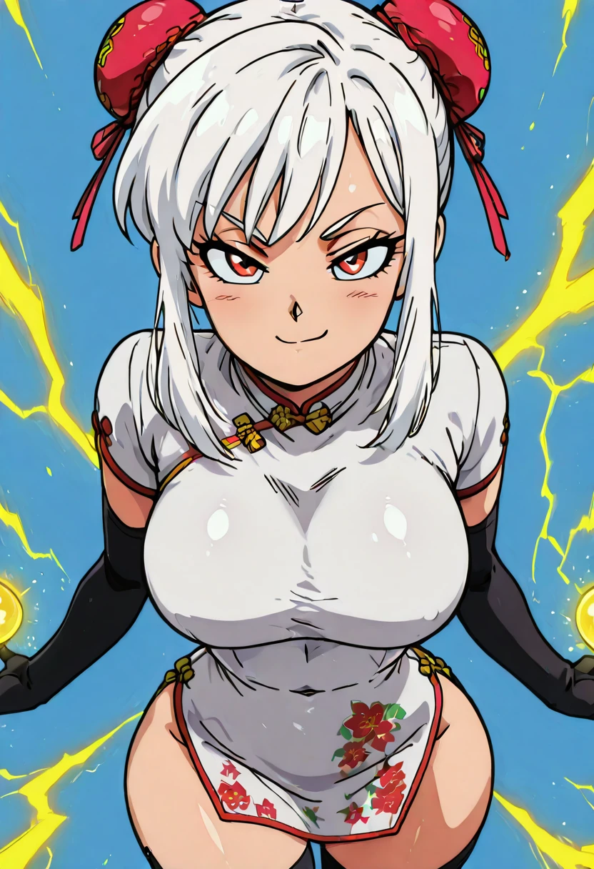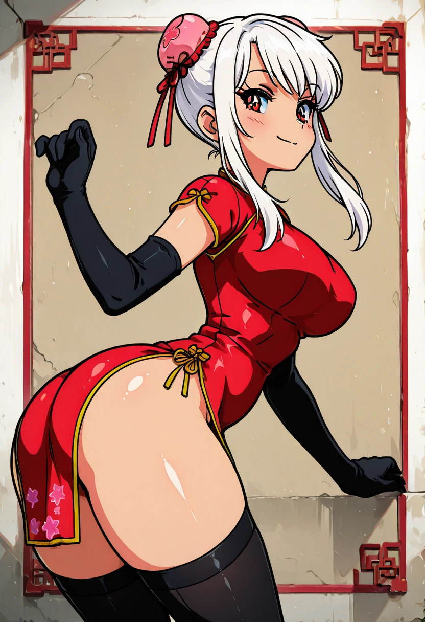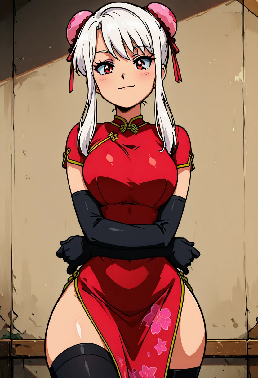 QipaoIllyaCitron, red eyes, sidelocks, white hair, bun cover, chinese clothes, china dress, elbow gloves, black thighhighs,