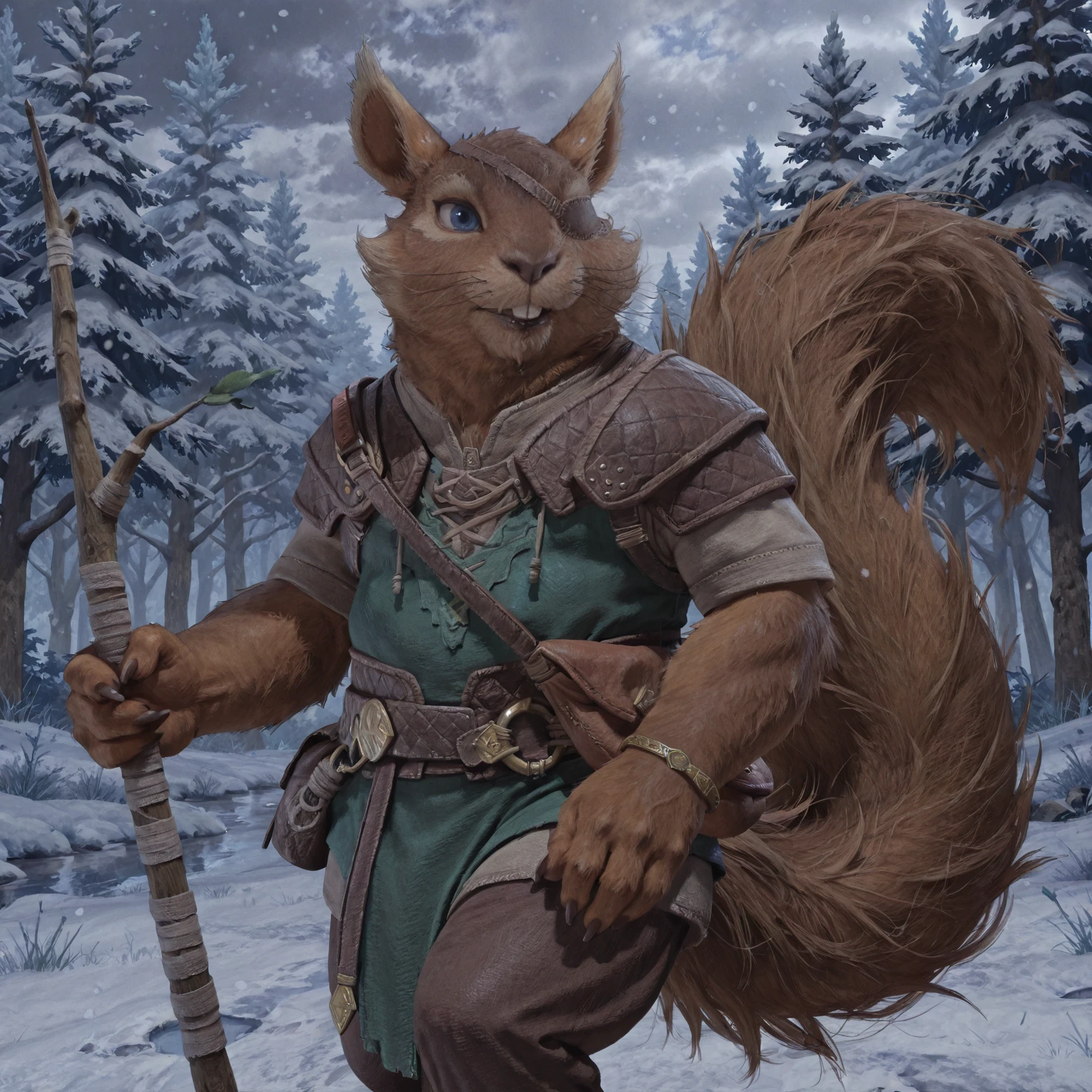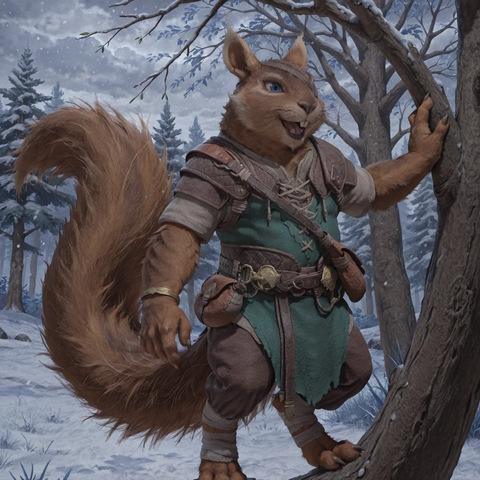 1boy, male, furry, semi-anthro, squirrel, solo, brown fur, two-tone fur, blue eyes, brown nose, buck teeth, pointed ears, whiskers, short beard, sharp nails, tail, bushy tail