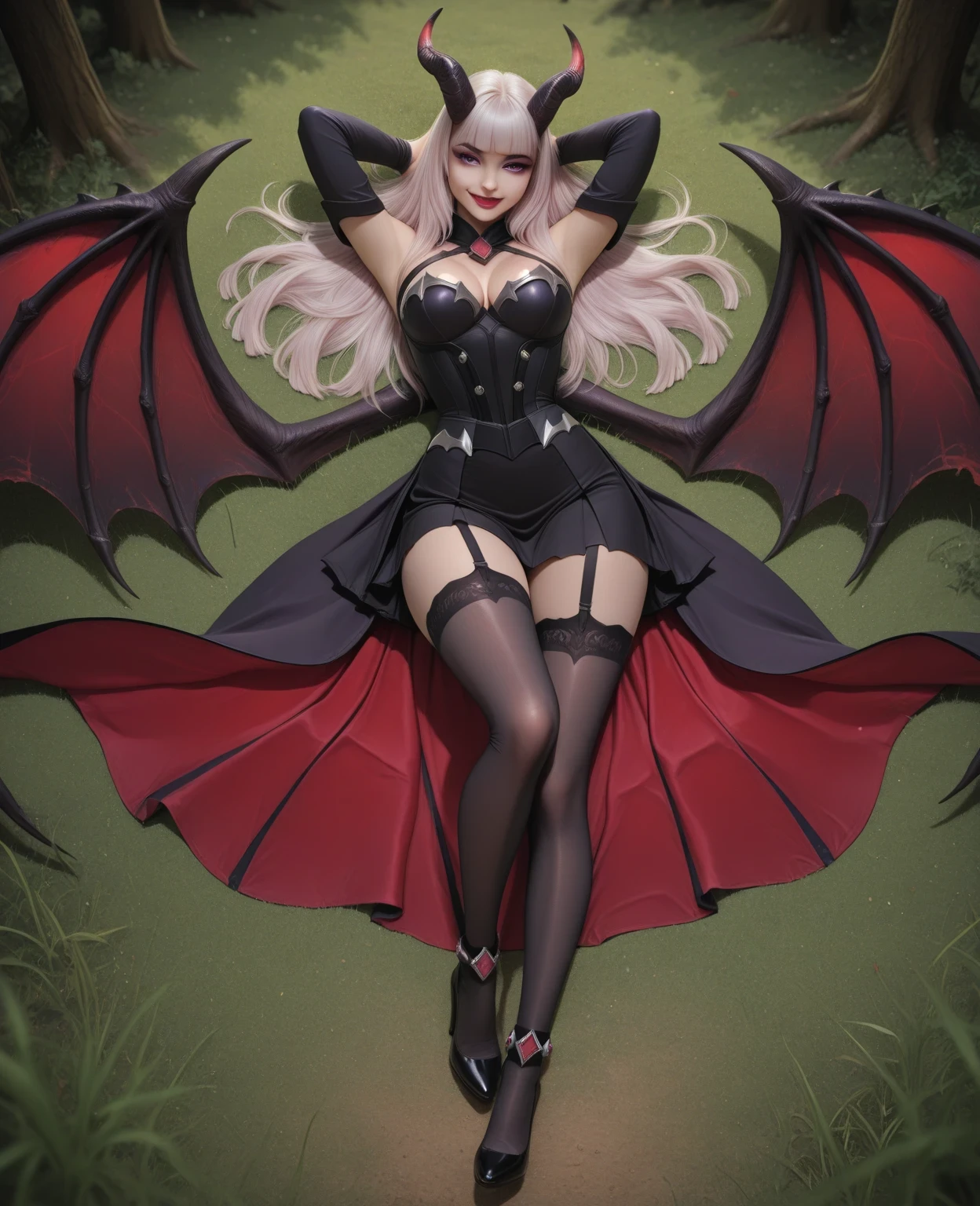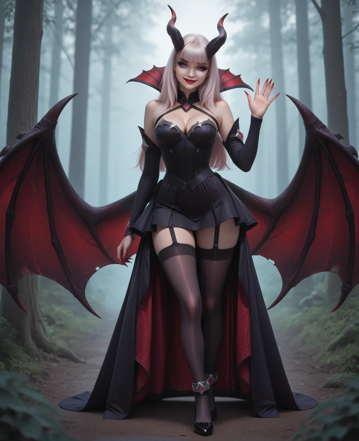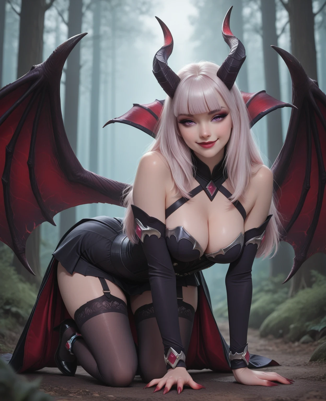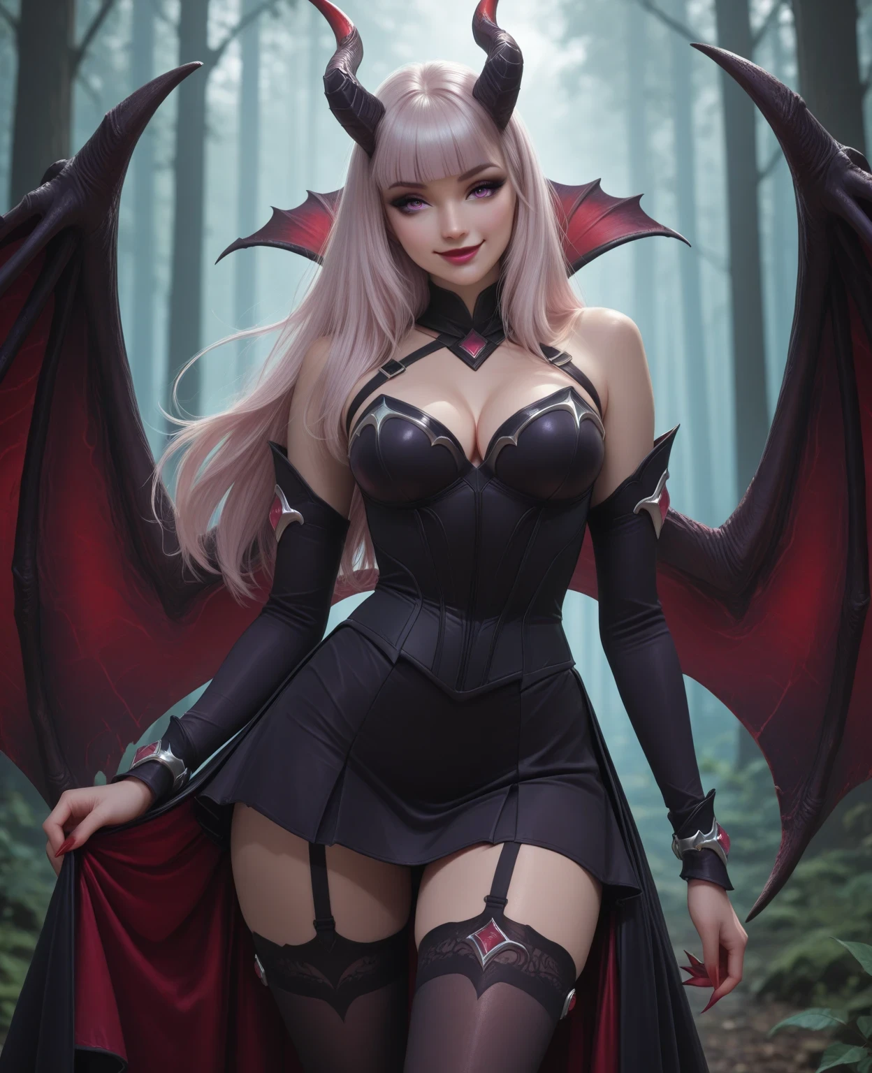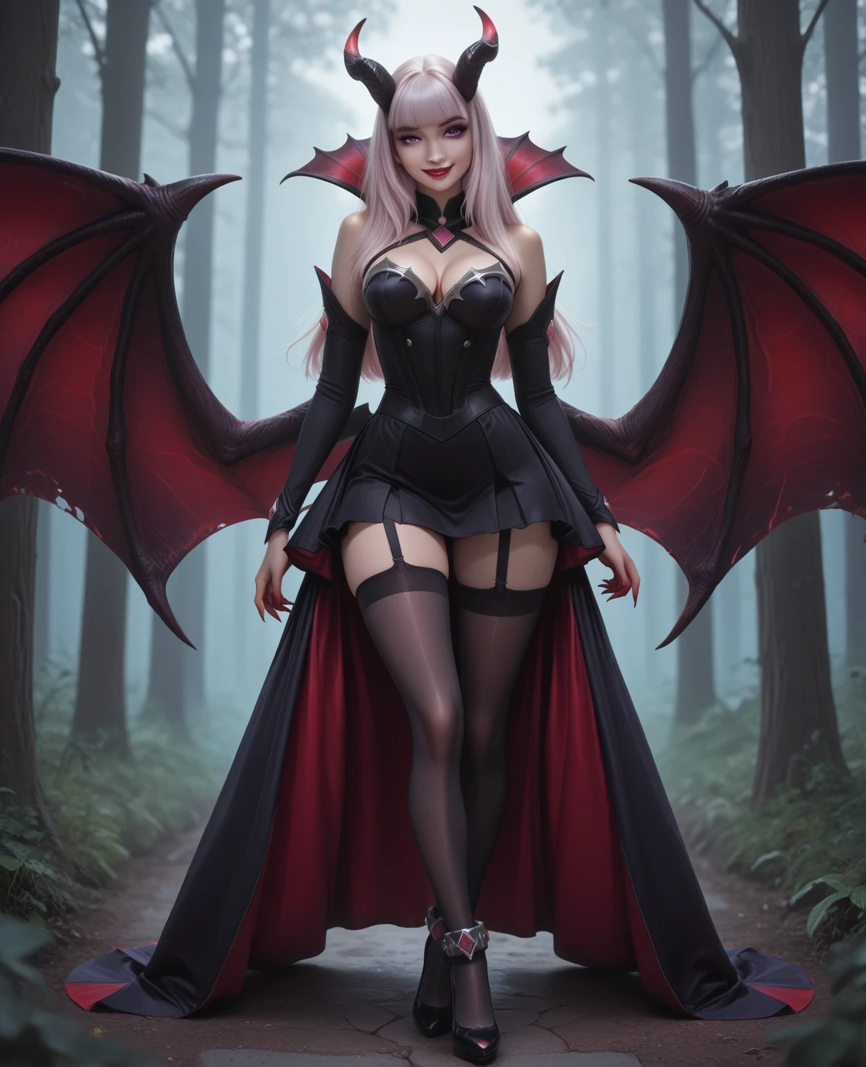 Alice_mobile , demon girl, succubus, light pink hair, long hair, straight hair, blunt bangs, pale skin, purple eyes, eyeshadow, lipstick, horns, demon horns, red tipped horns,waist cape, tattered cape, inner red cape, flowing cape, bat motif, two-sided cape,high collar, devil collar, popped collar, gothic outfit, mini dress, black dress, strapless dress, corset, armored skirt, armor accents, strap chocker, choker, cleavage cutout, straps on chest, cleavage, red gem on chest, gem on shoulders, arm sleeves, detached sleeves, bridal gauntlets, bare shoulders, sheer thighhighs, patterned thighhighs, semi-transparent legwear, garter straps, ankle cuffs, jewelled anklets, sharp fingernails, red extremities, red fingers,,demon wings,black high heels