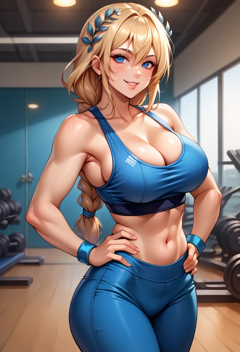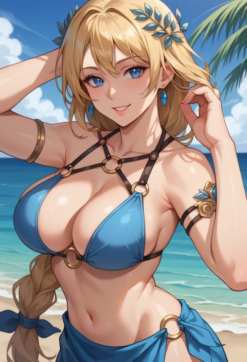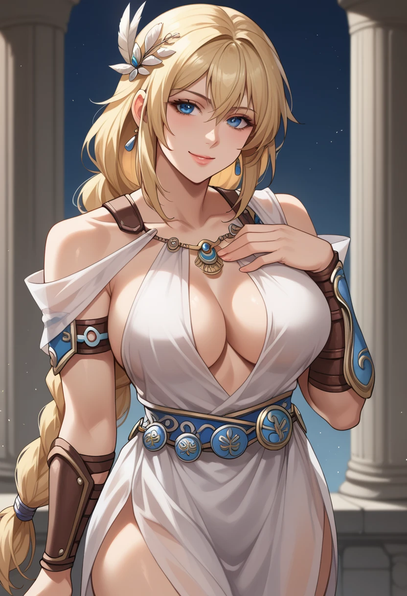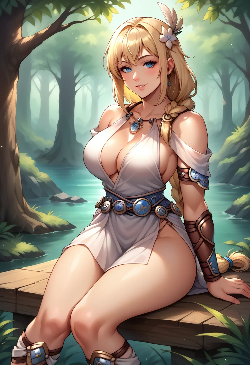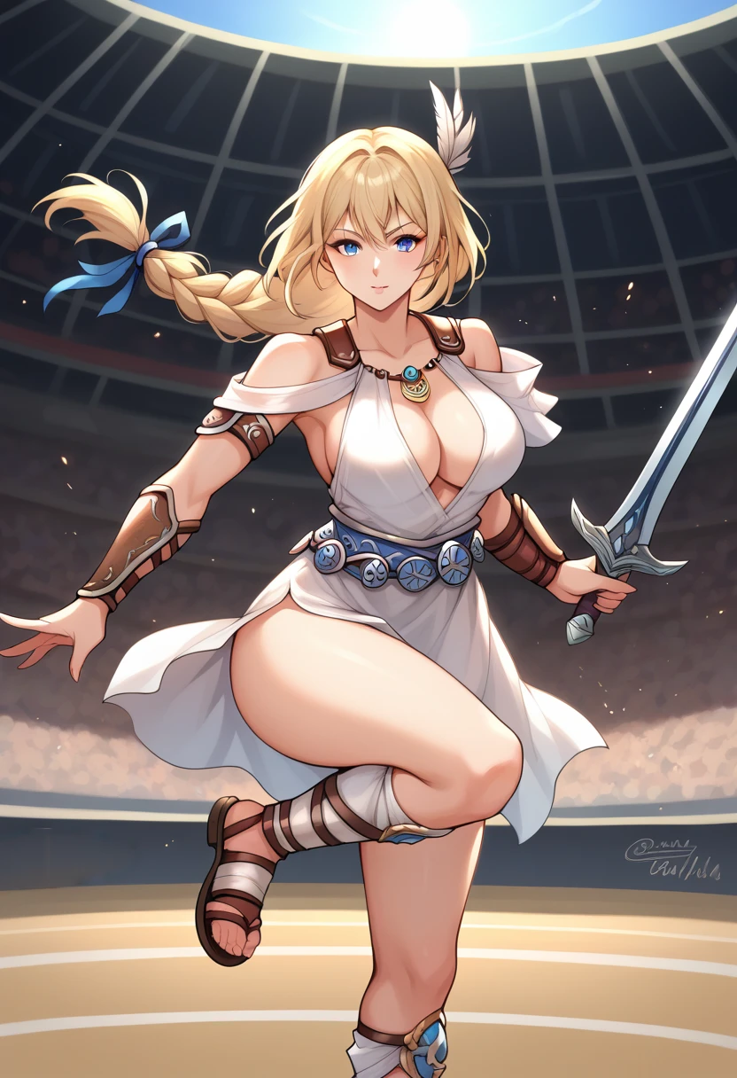 "SophiSC4, blonde hair, blue eyes, feather hair ornament, low-tied long hair, single braid, off-shoulder dress, armlet, large breasts, cleavage , jewelry, blue belt, arm guards, legs, gladiator sandals" for her SC4 outfit.