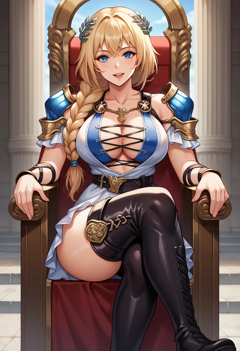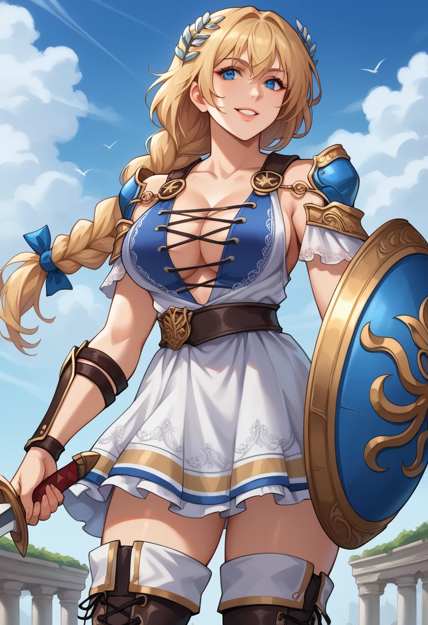 "SophAlexSC6, blonde hair, low-tied long hair, single braid, blue eyes, silver laurel crown, large breasts, white armored dress, layered clothes, white skirt, cross-laced clothes, pauldron, vambraces, leather belt, thigh boots, leather armor" for her SC6 costume.