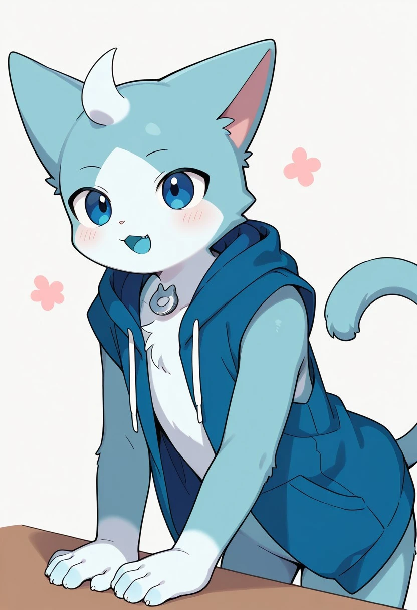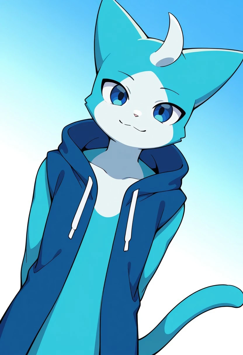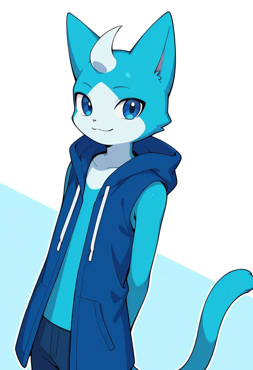 solo, male, anthro cat, blue fur, light-blue mouth, light-blue chest, dark-blue hoodie, light-blue hands, sleeveless, blue eyes, white head lock