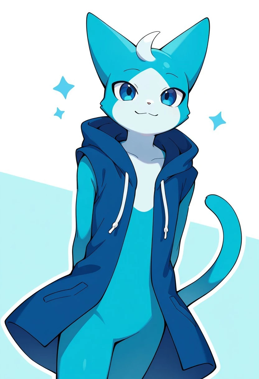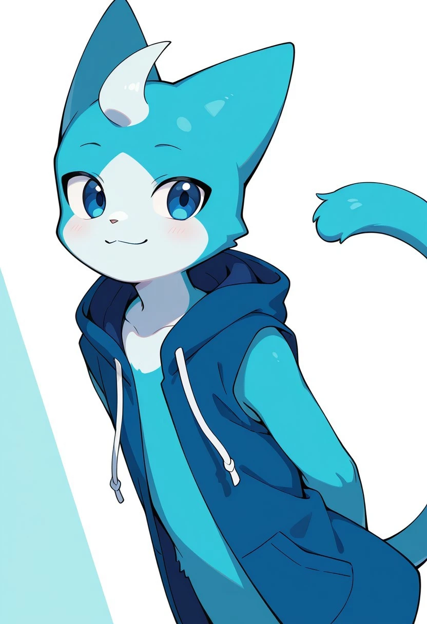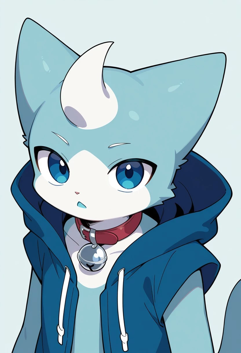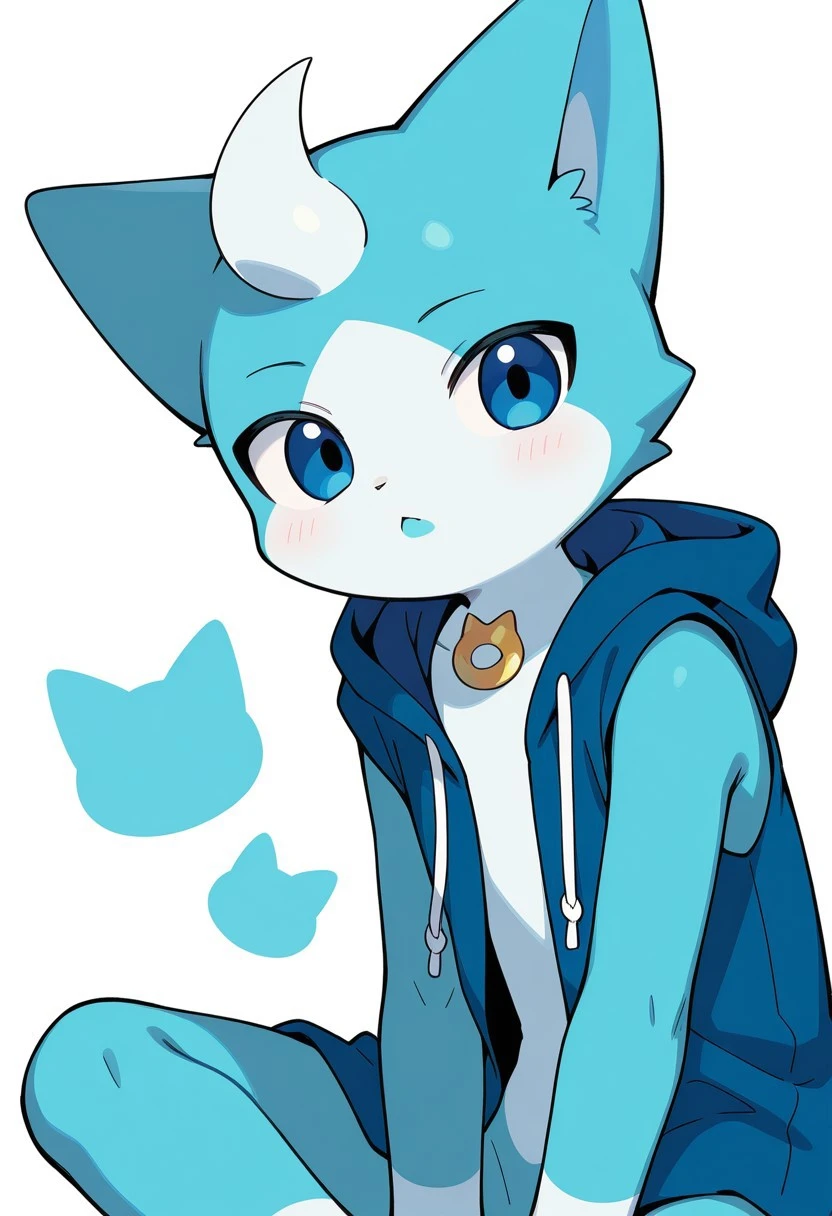 solo, male, anthro cat, blue fur, light-blue mouth, light-blue chest, dark-blue hoodie, light-blue hands, sleeveless, blue eyes, white head lock