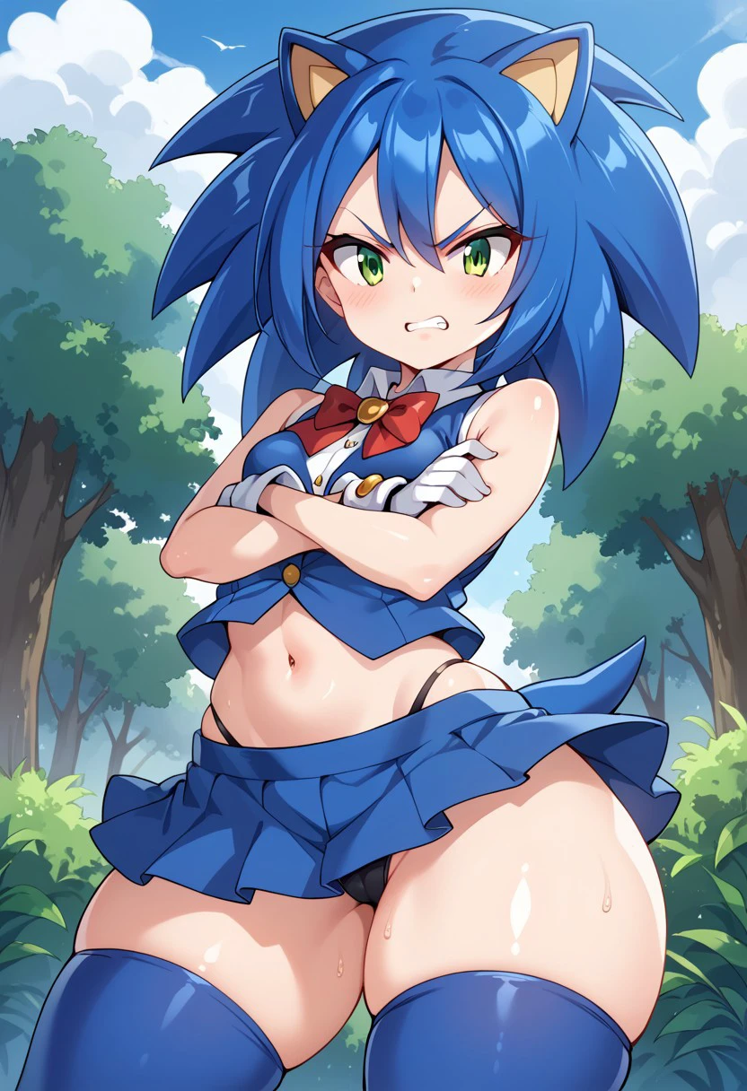 SonicGijinka, 1girl, big hair, blue hair, hedgehog ears, hedgehog tail, green eyes, spiked hair, hair between eyes, sidelocks, white gloves, red shoes, white socks