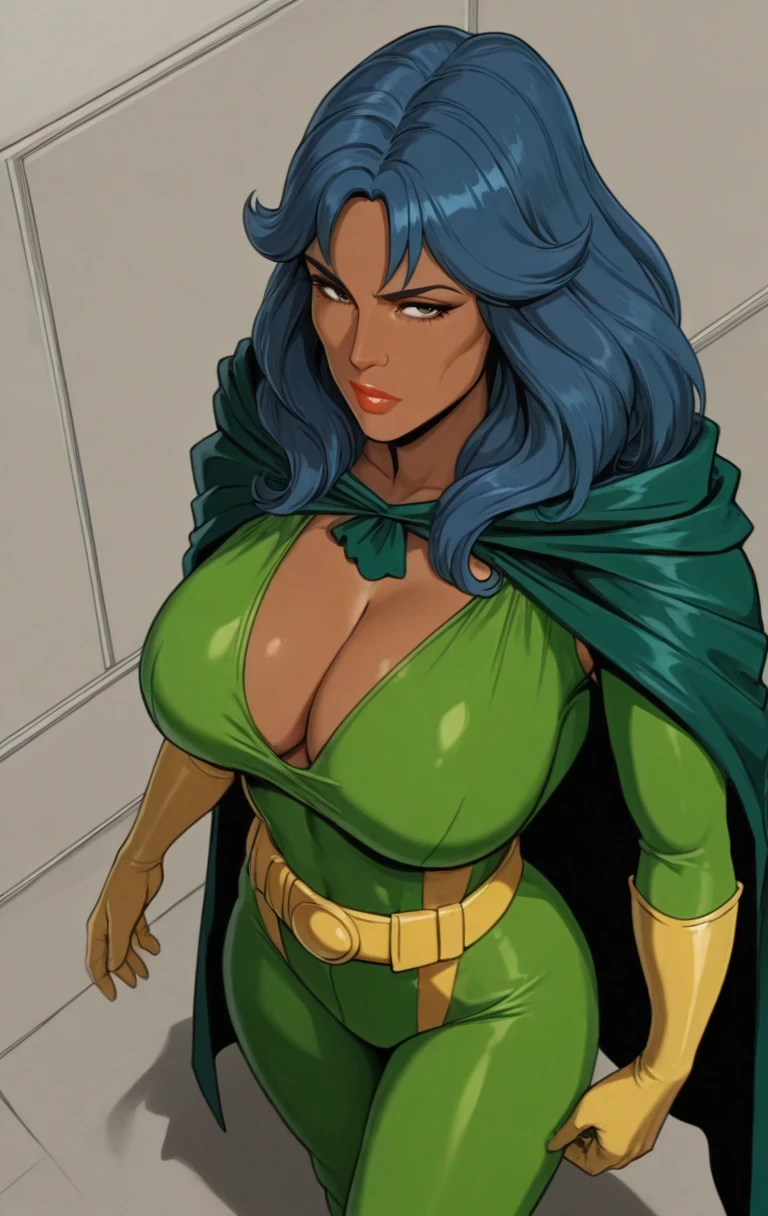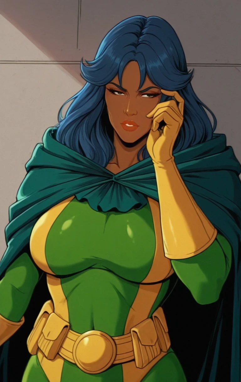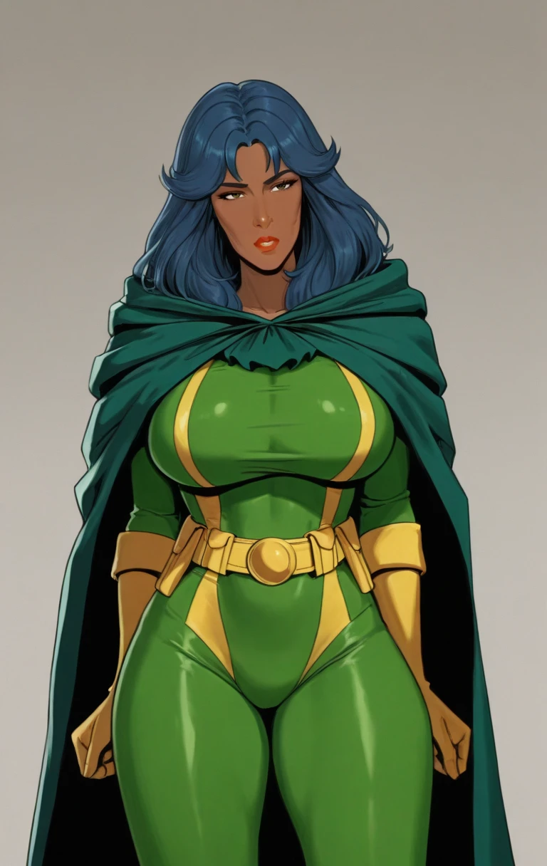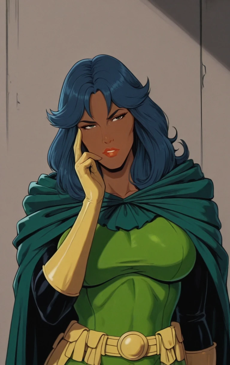 1girl, solo, long hair, looking at viewer, blue hair, black hair, coat, dark skin, lips, black coat, dark-skinned female, green cape,green cape, hand on face, yellow belt, green outfit,s1lv3rf0x,
