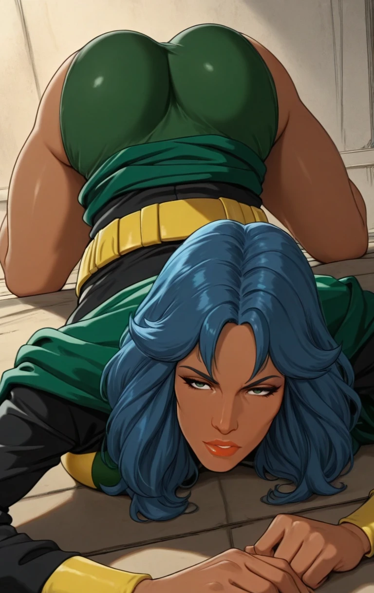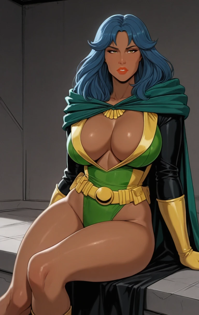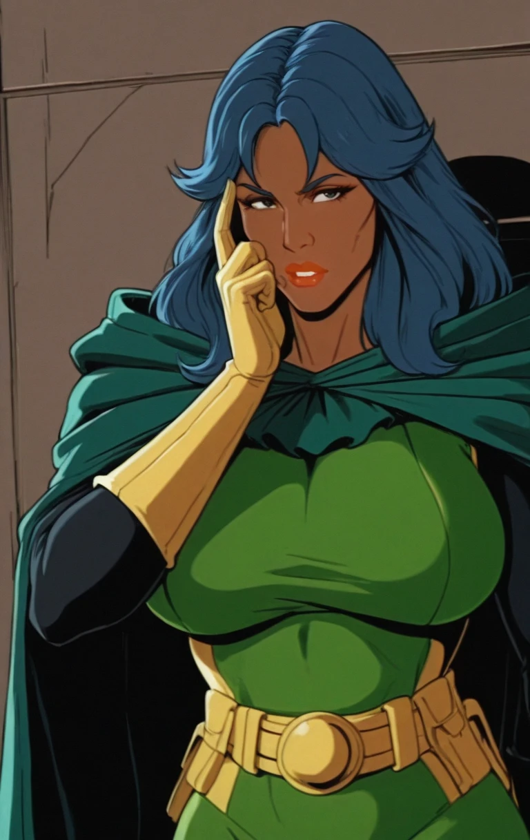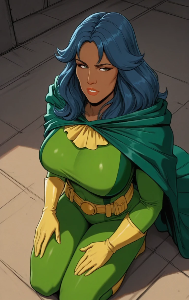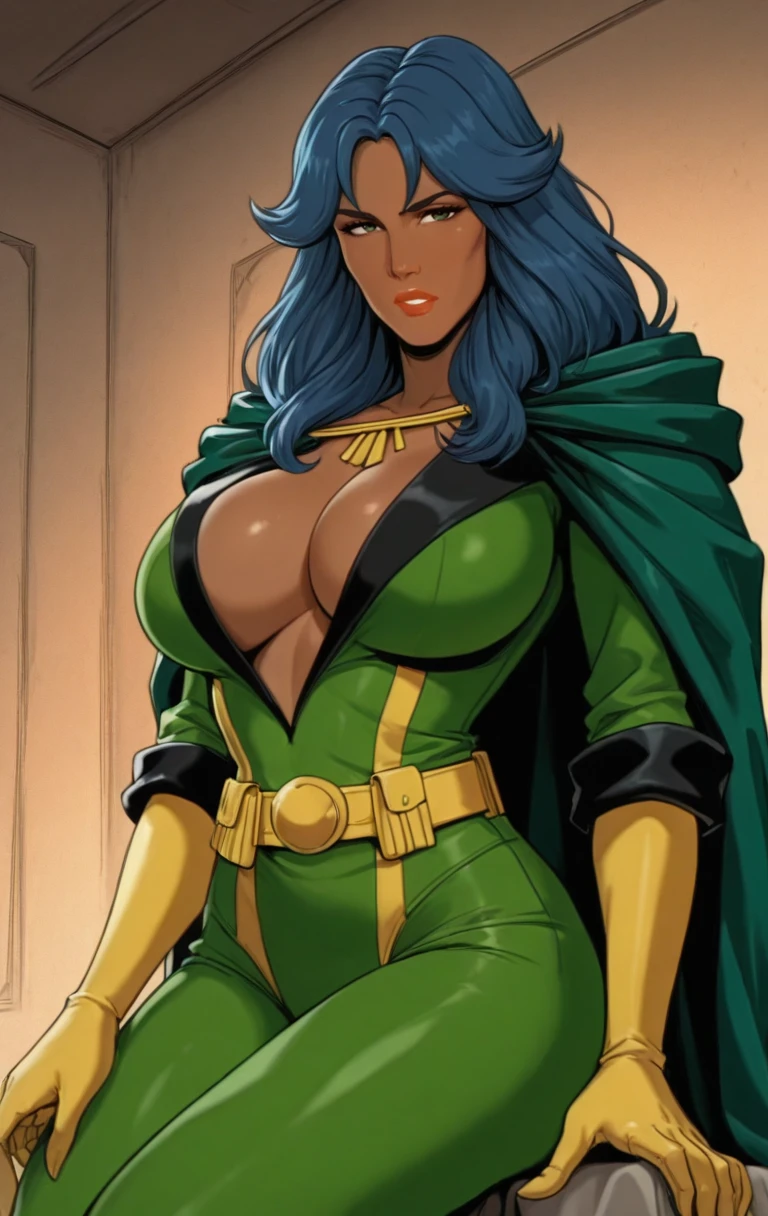 1girl, solo, long hair, looking at viewer, blue hair, black hair, coat, dark skin, lips, black coat, dark-skinned female, green cape,green cape, hand on face, yellow belt, green outfit,s1lv3rf0x,