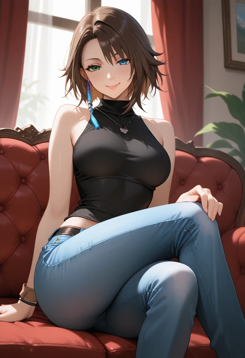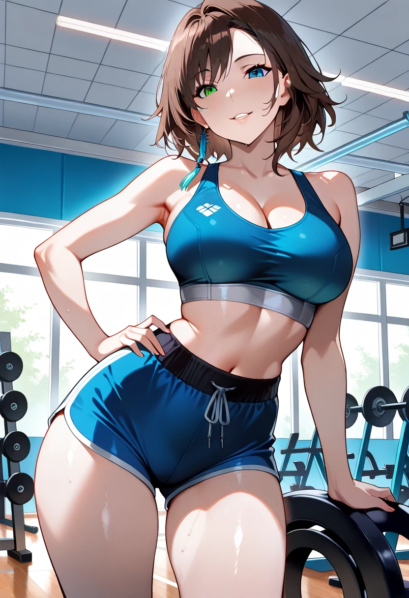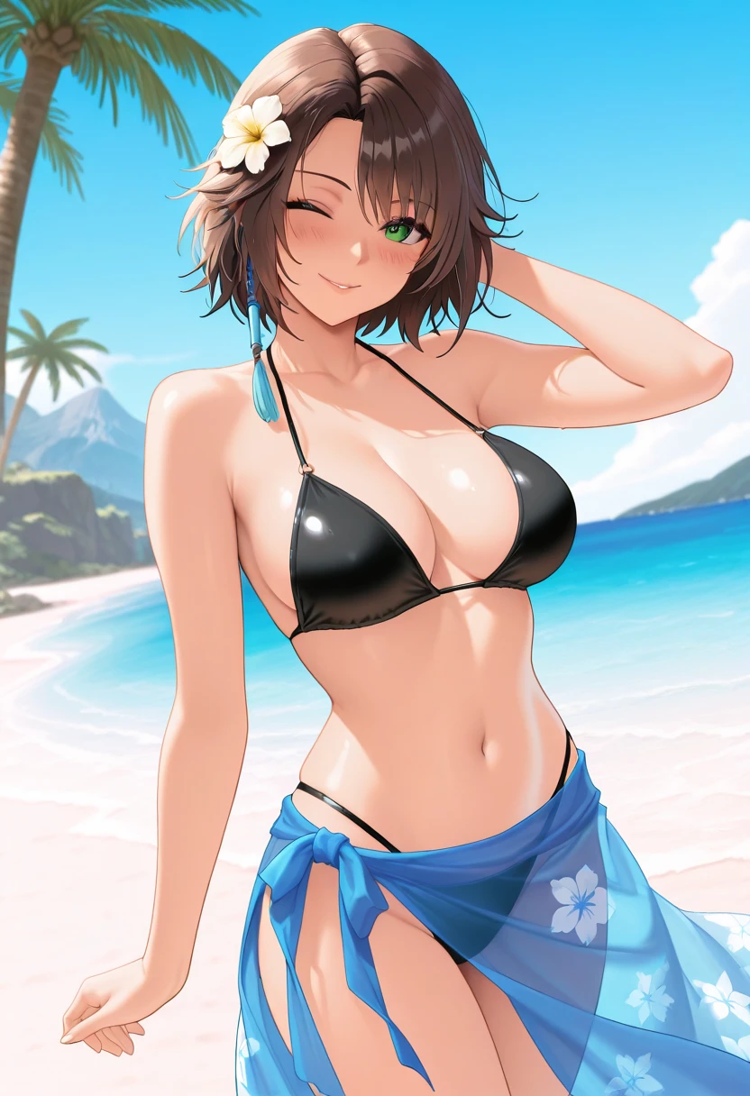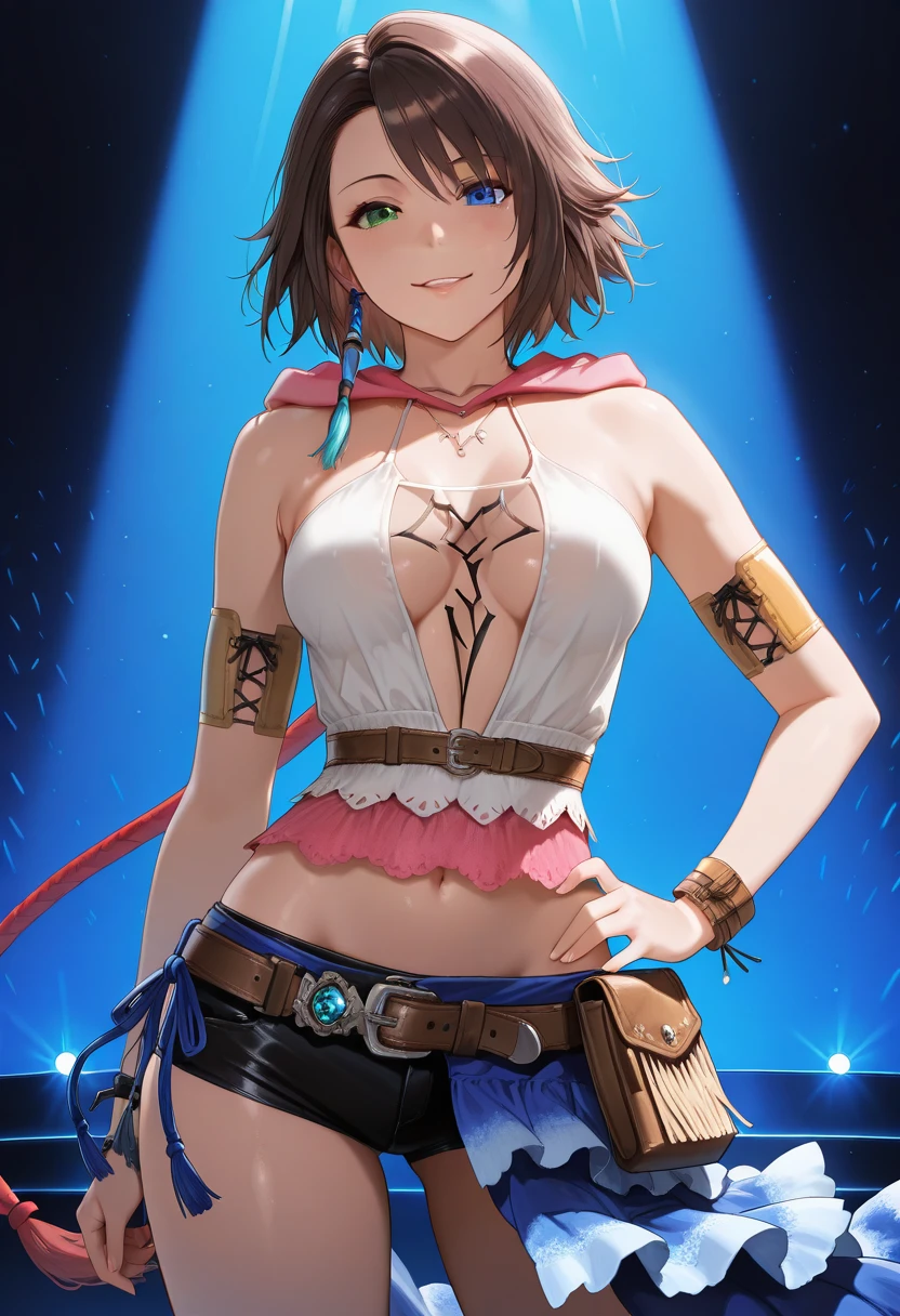 "FFXS0NG, brown hair, short hair, hair ornament, blue sleeveless vest, plunging neckline,necklace, navel, frills, detached sleeves, cross-laced clothes, black skirt, belt, blue showgirl skirt"