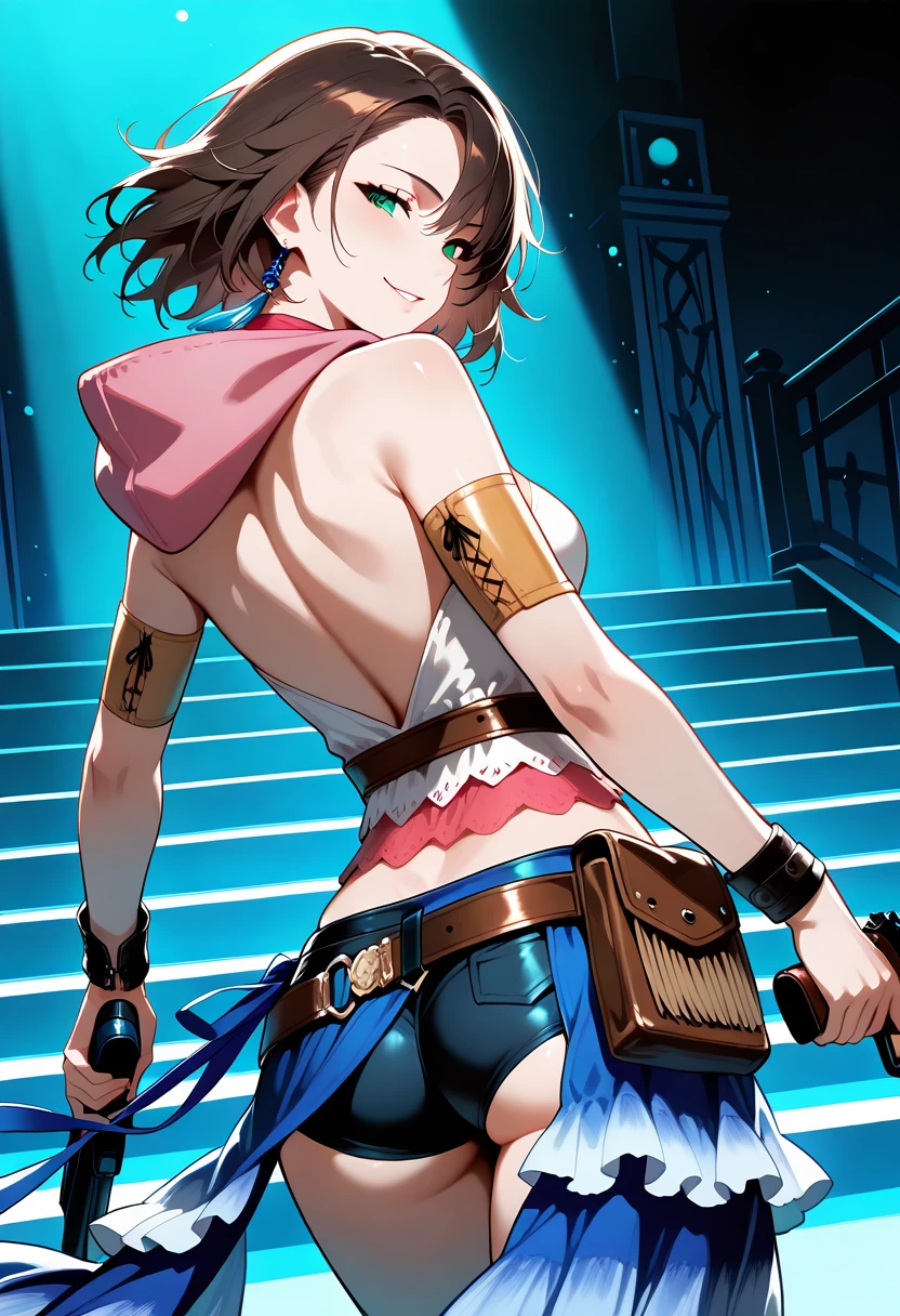 "YNAFFX2, short hair, brown hair, hair ornament, hood down, pink hood, halterneck, center opening, chest tattoo, navel, pink undershirt, bare shoulders, armlet, bracelet, belt, belt pouch, short shorts, showgirl skirt"