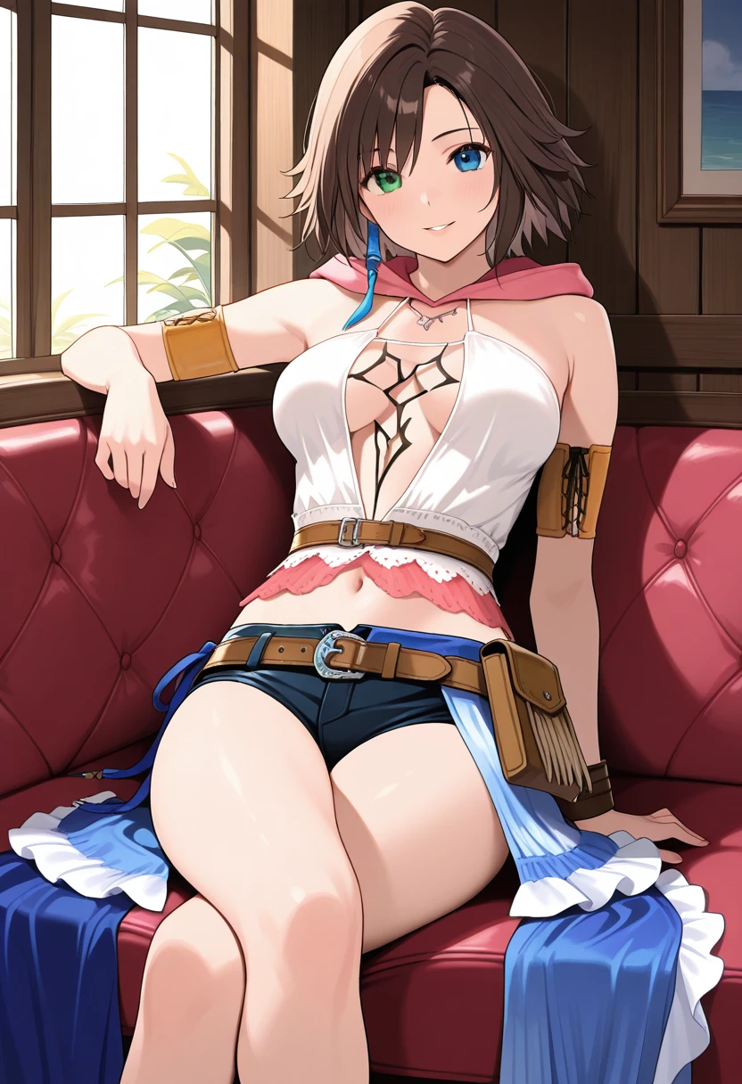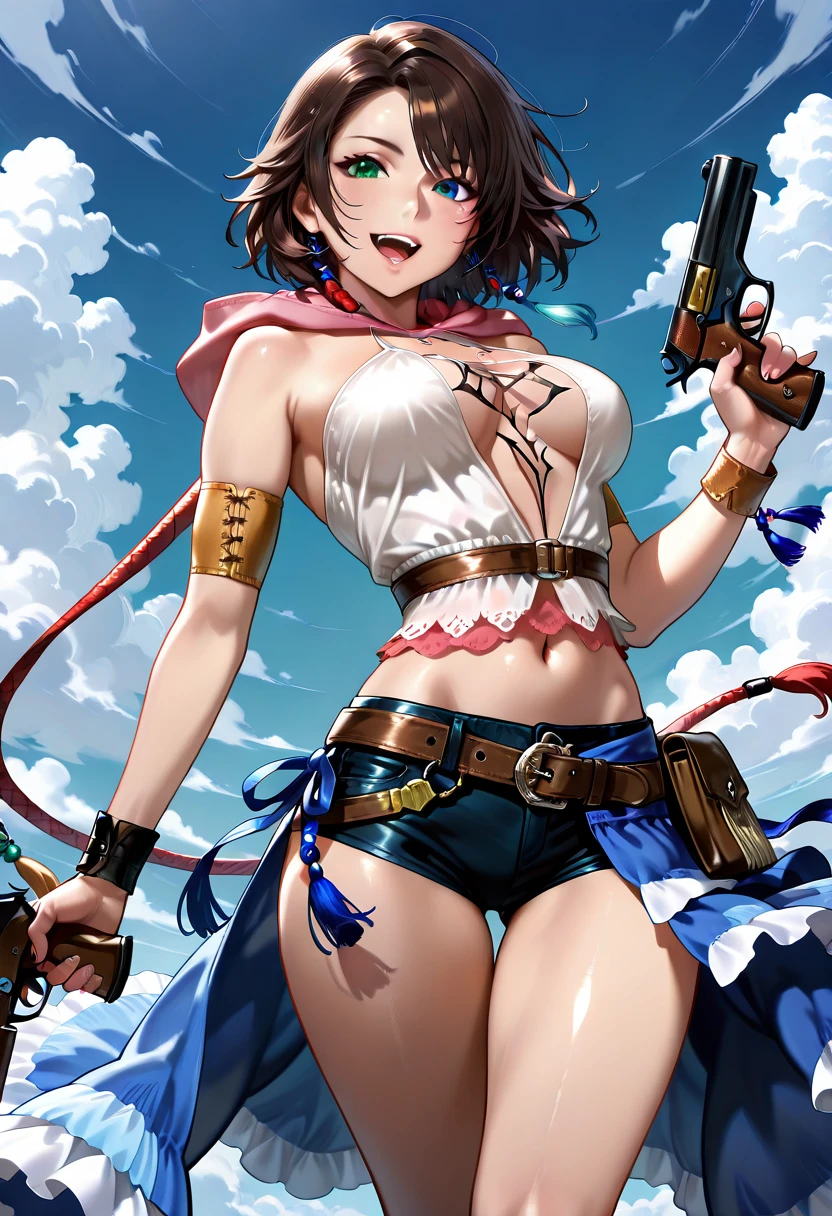 YNAFFX2, short hair, brown hair, hair ornament, hood down, pink hood, halterneck, center opening, chest tattoo, navel, pink undershirt, bare shoulders, armlet, bracelet, belt, belt pouch, short shorts, showgirl skirt,