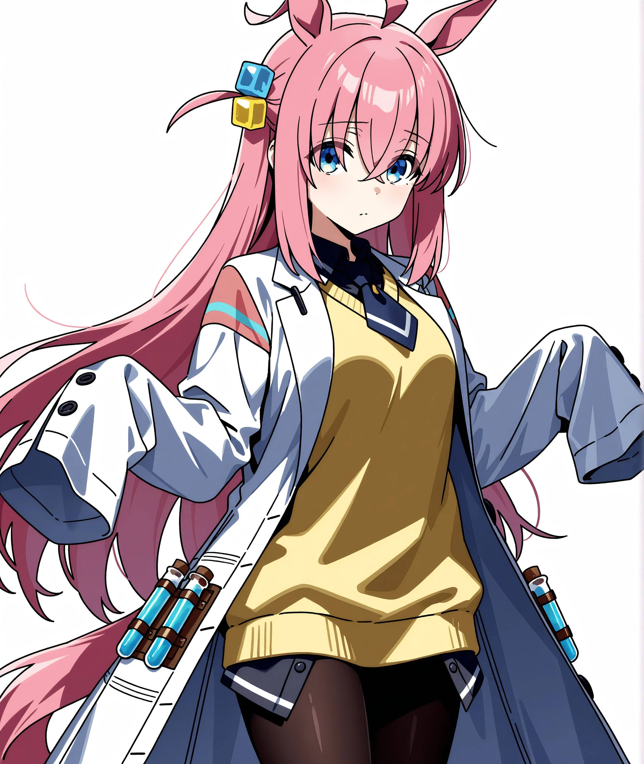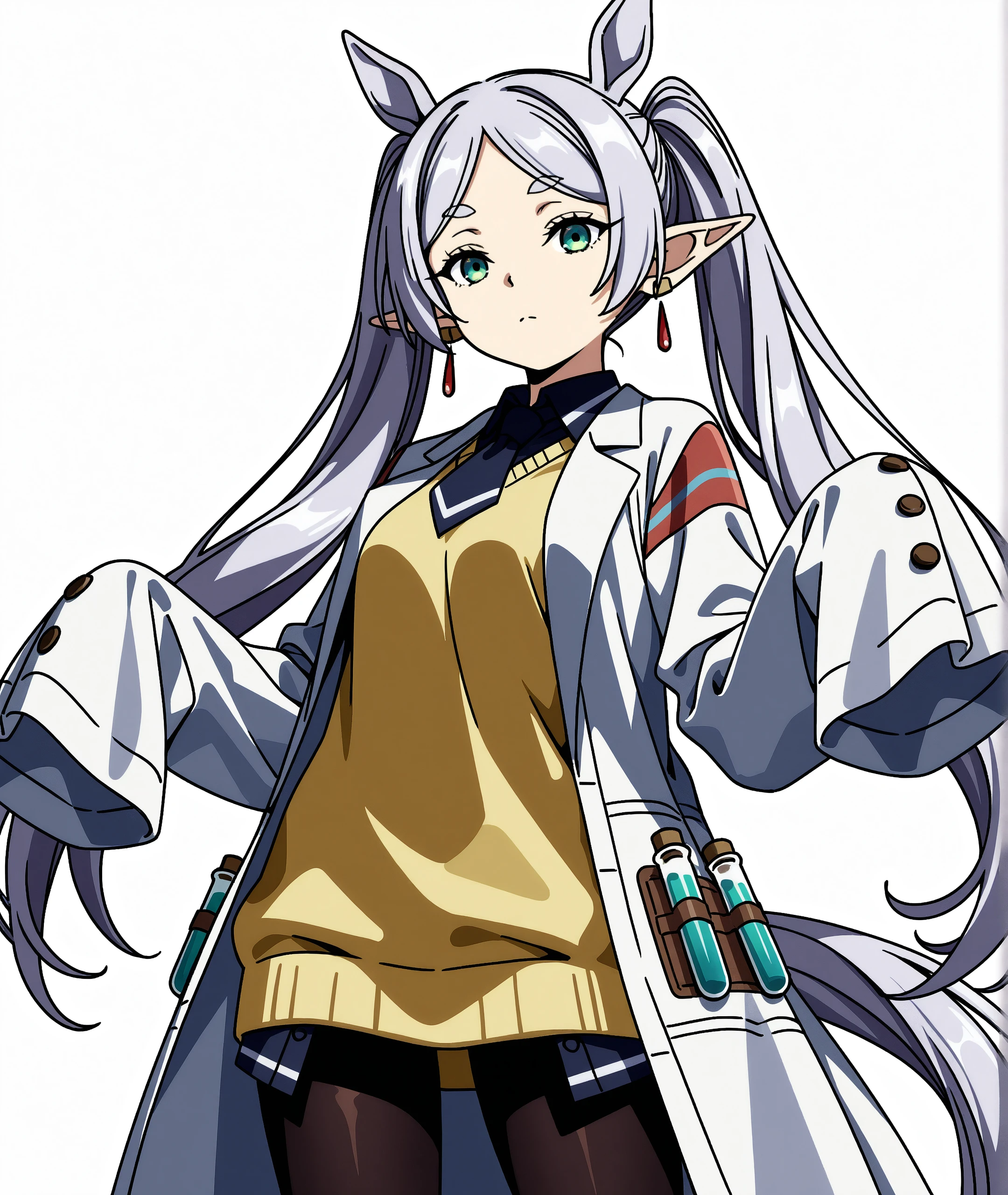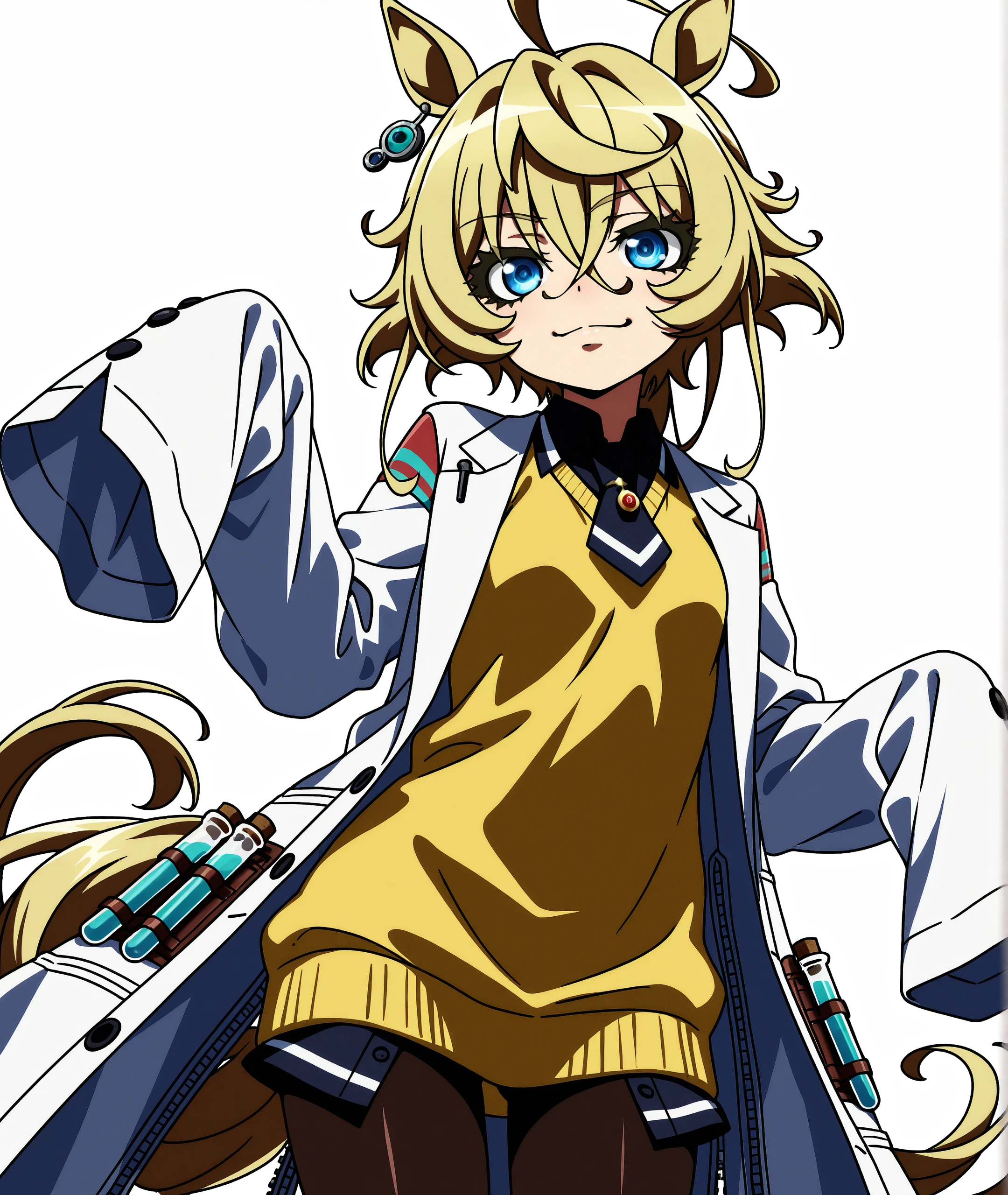 breasts, jewelry, earrings, single earring, shirt, long sleeves, , necktie, collared shirt, vest, coat, sweater, black shirt, sleeves past wrists, yellow sweater vest, black necktie, sleeves past fingers, blue necktie, , sweater vest, white coat, lab coat, short necktie, yellow sweater, yellow vest, very long sleeves, test tube, vial, cork, black pantyhose, pantyhose, brown pantyhose,