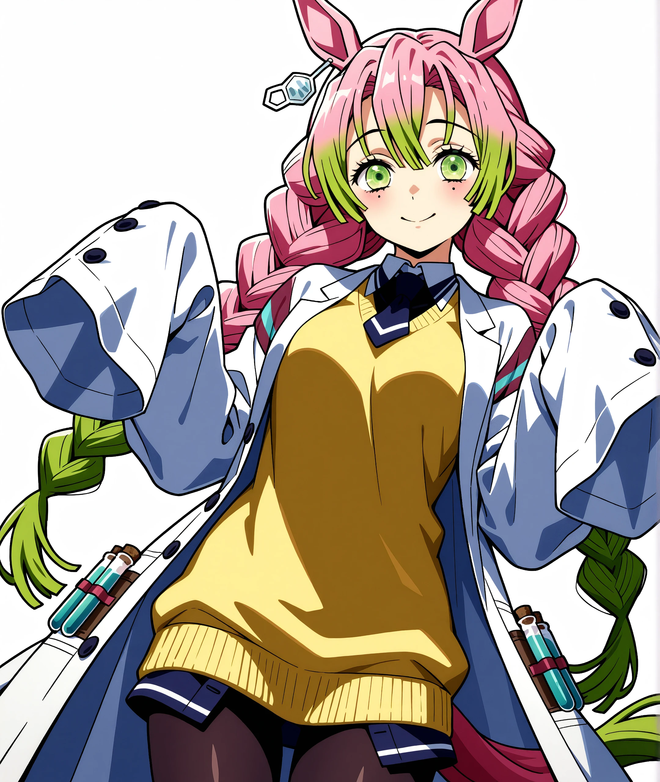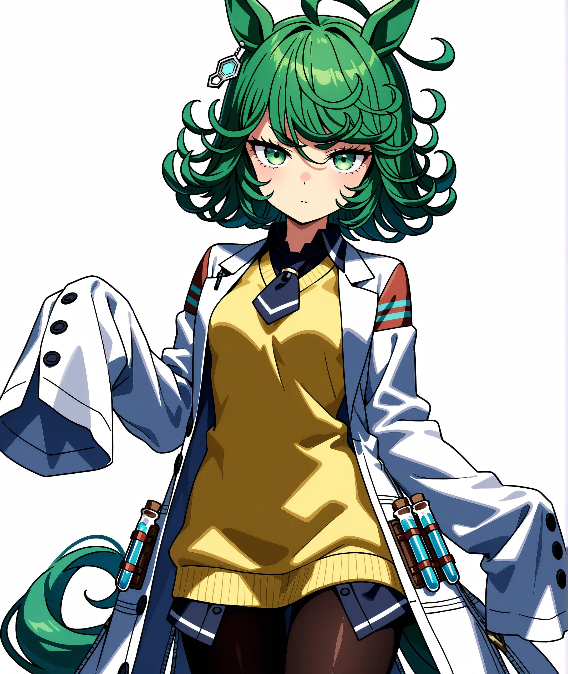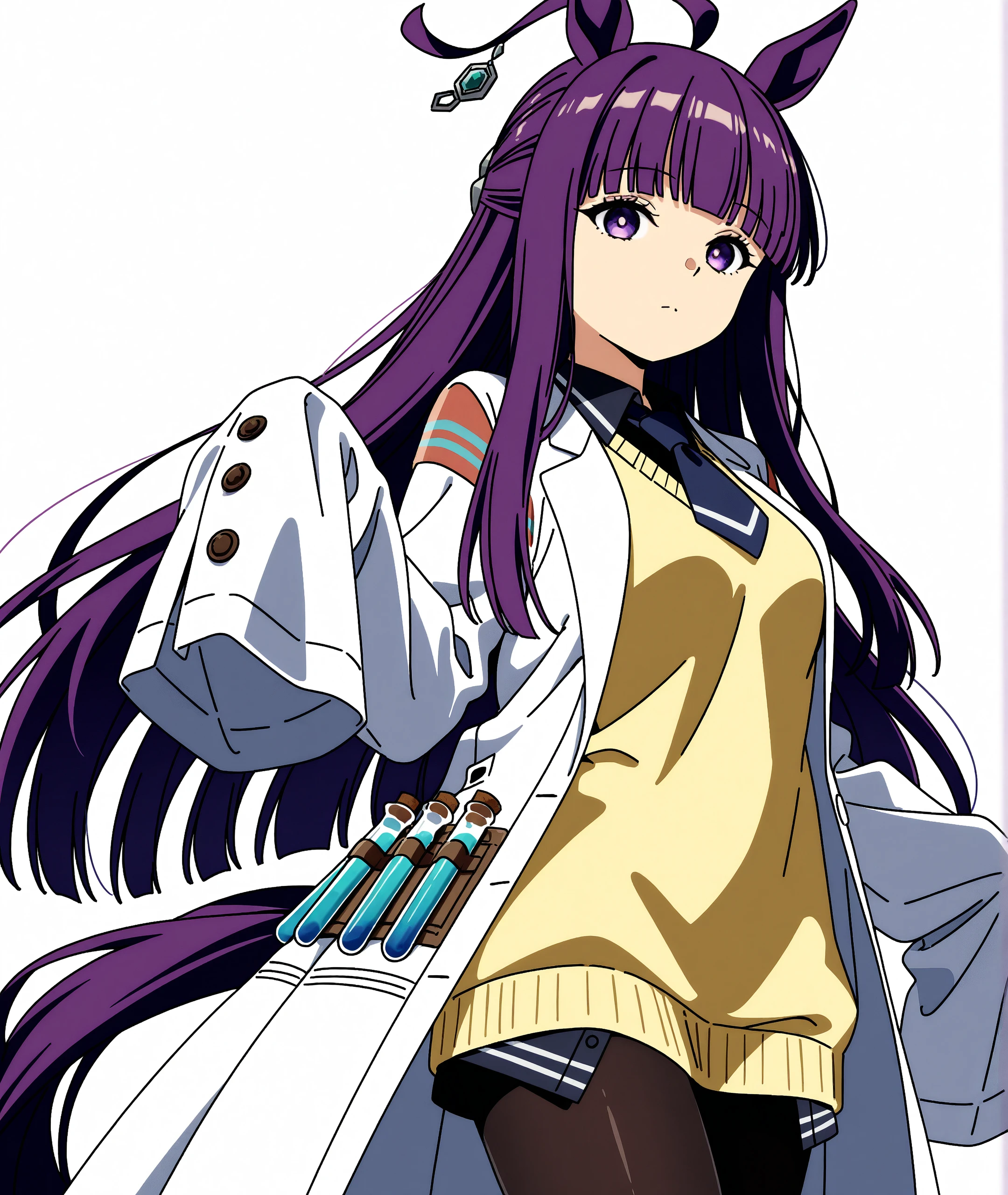 breasts, jewelry, earrings, single earring, shirt, long sleeves, , necktie, collared shirt, vest, coat, sweater, black shirt, sleeves past wrists, yellow sweater vest, black necktie, sleeves past fingers, blue necktie, , sweater vest, white coat, lab coat, short necktie, yellow sweater, yellow vest, very long sleeves, test tube, vial, cork, black pantyhose, pantyhose, brown pantyhose,