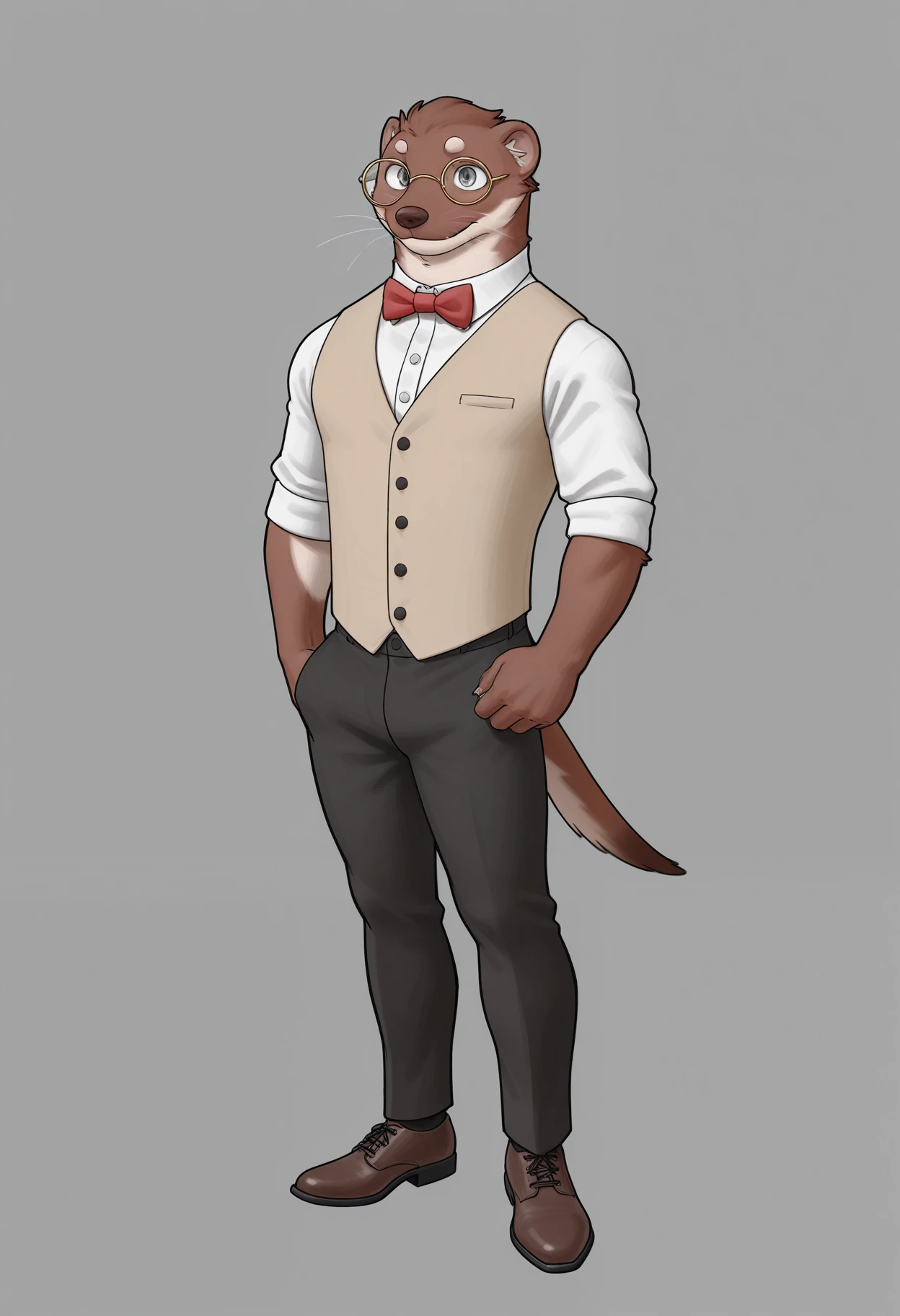 Main outfit: round glasses, red bowtie, white collared shirt, light brown vest, black pants, dress shoes,